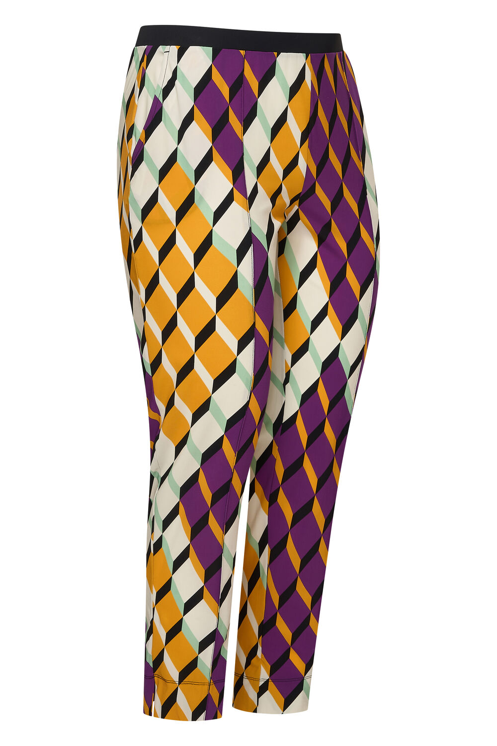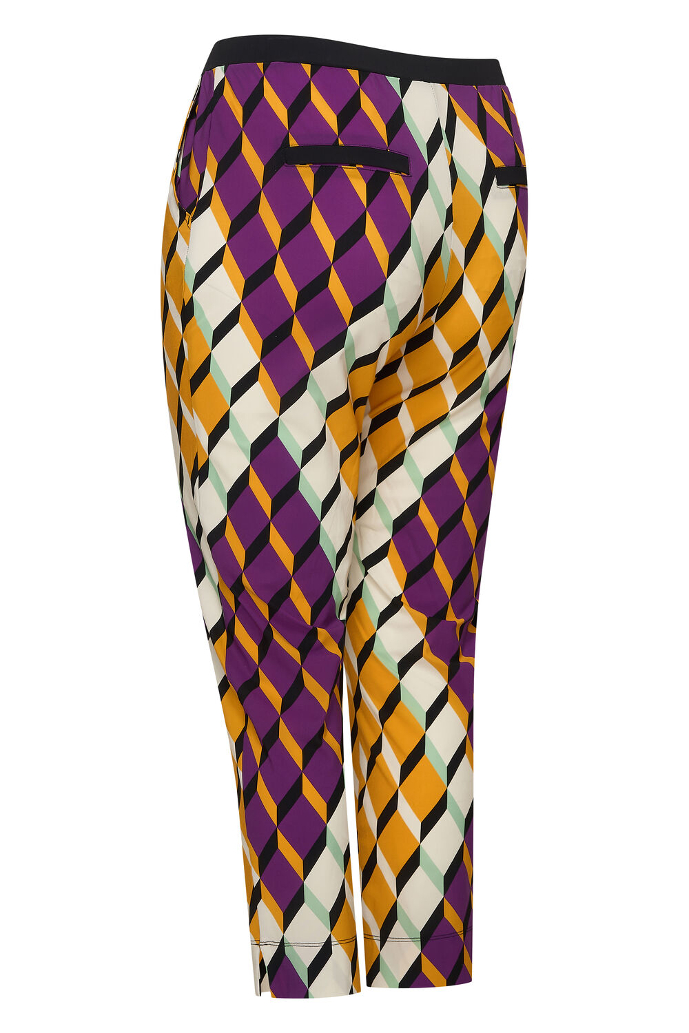 Rechte city broek 7/8 lengte. Elastische tailleband, twee steekzakken voor en twee sier/fake strookzakken achter. Ingestikte naad voor en split onderaan de pijp.
