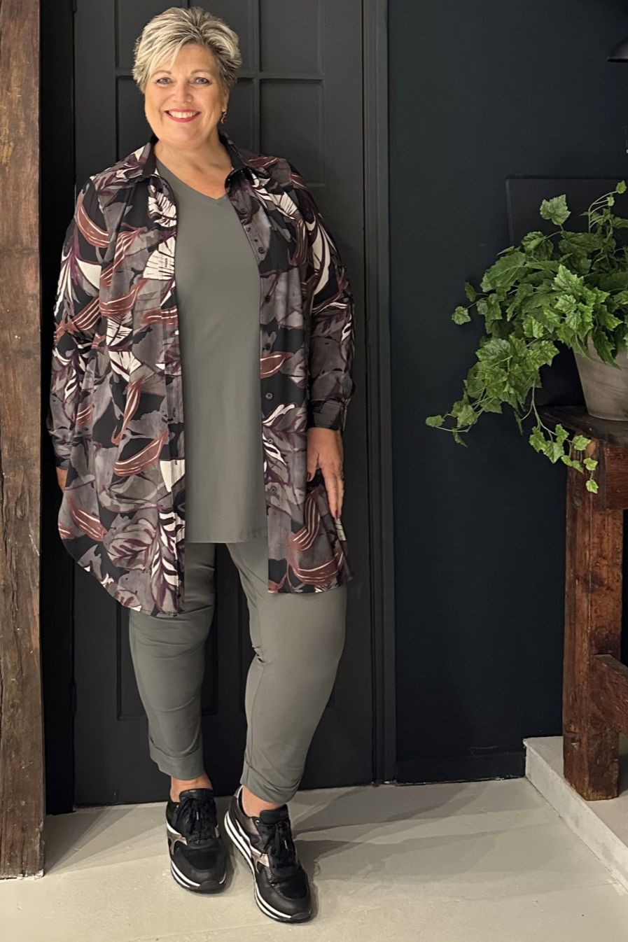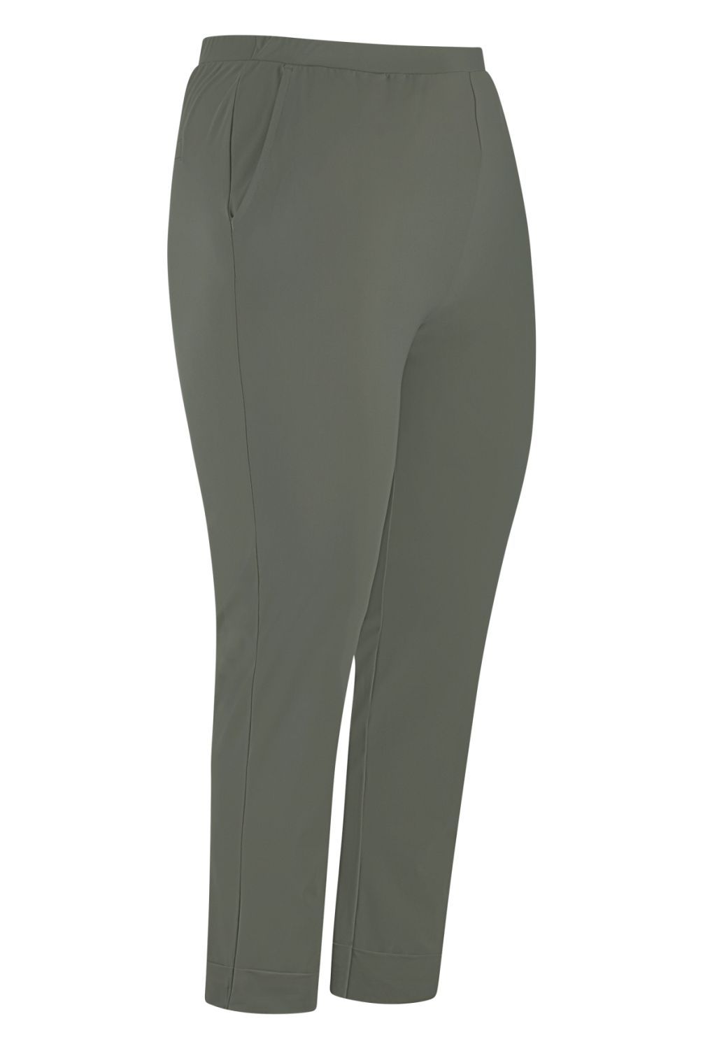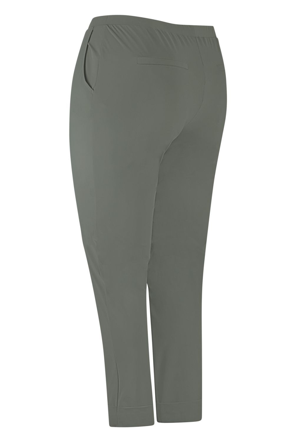 Rechte city broek met elastische tailleband. Twee steekzakken voor en twee sier/fake strookzakken achter. Omslag aan de pijp. Binnenbeenlengte 71 cm.