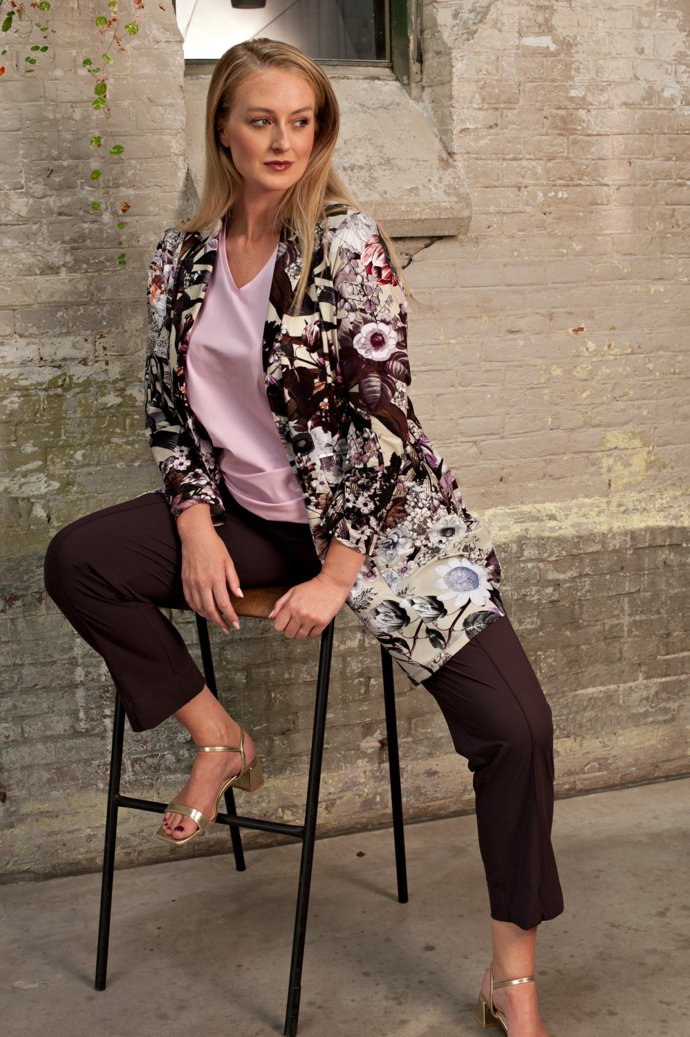 Rechte city broek met twee steekzakken voor en twee fake strookzakken achter. Ingestikte naad op been voor. Split onderaan op pijp.