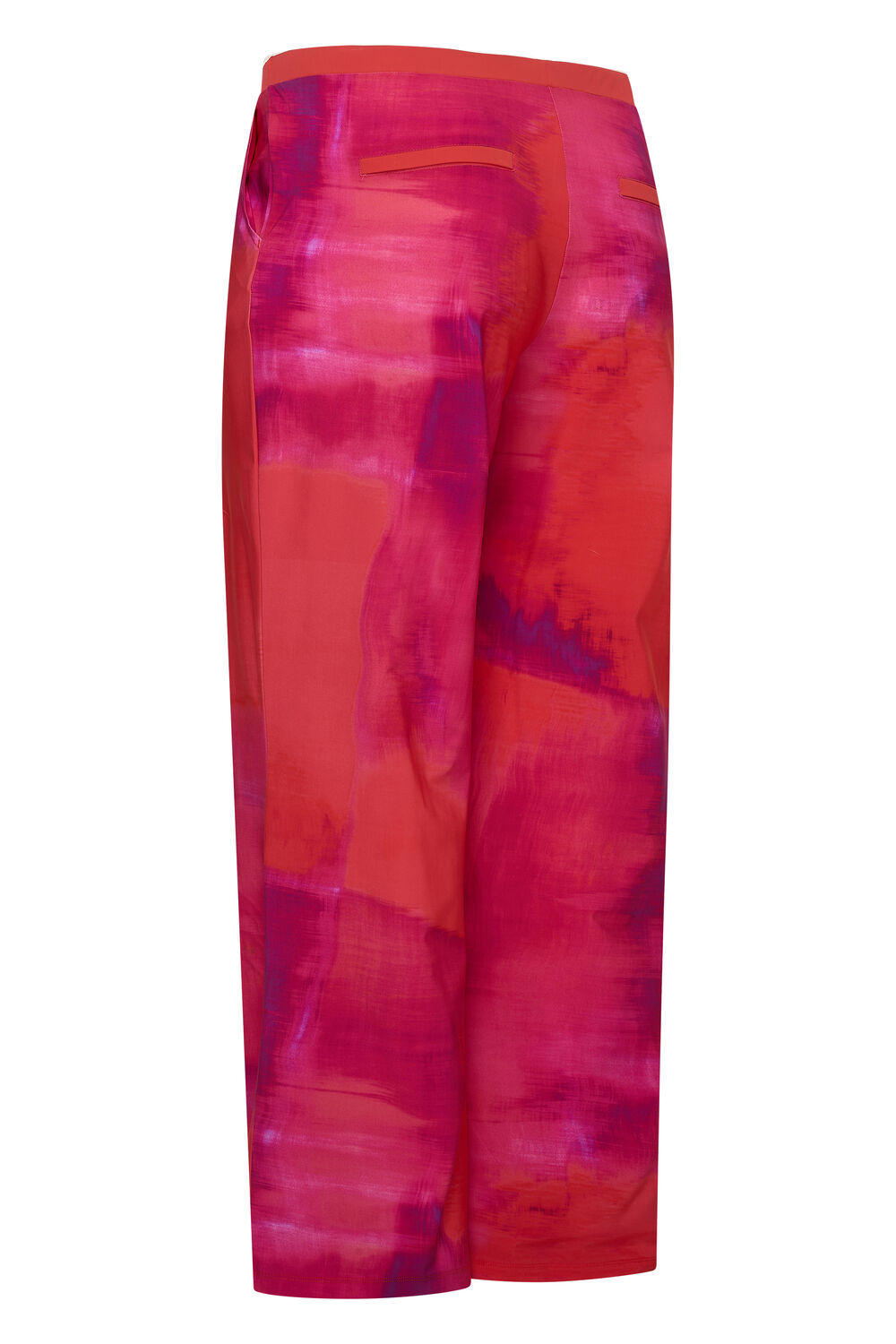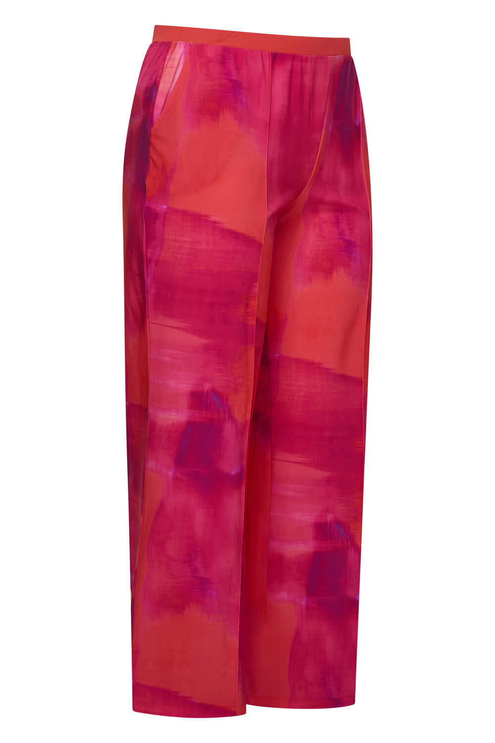 Wijde pantalon met elastische tailleband. Twee steekzakken voor en twee sier/fake strookzakken achter. Ingestikte naad op been voorzijde. Binnenbeen lengte 83 cm