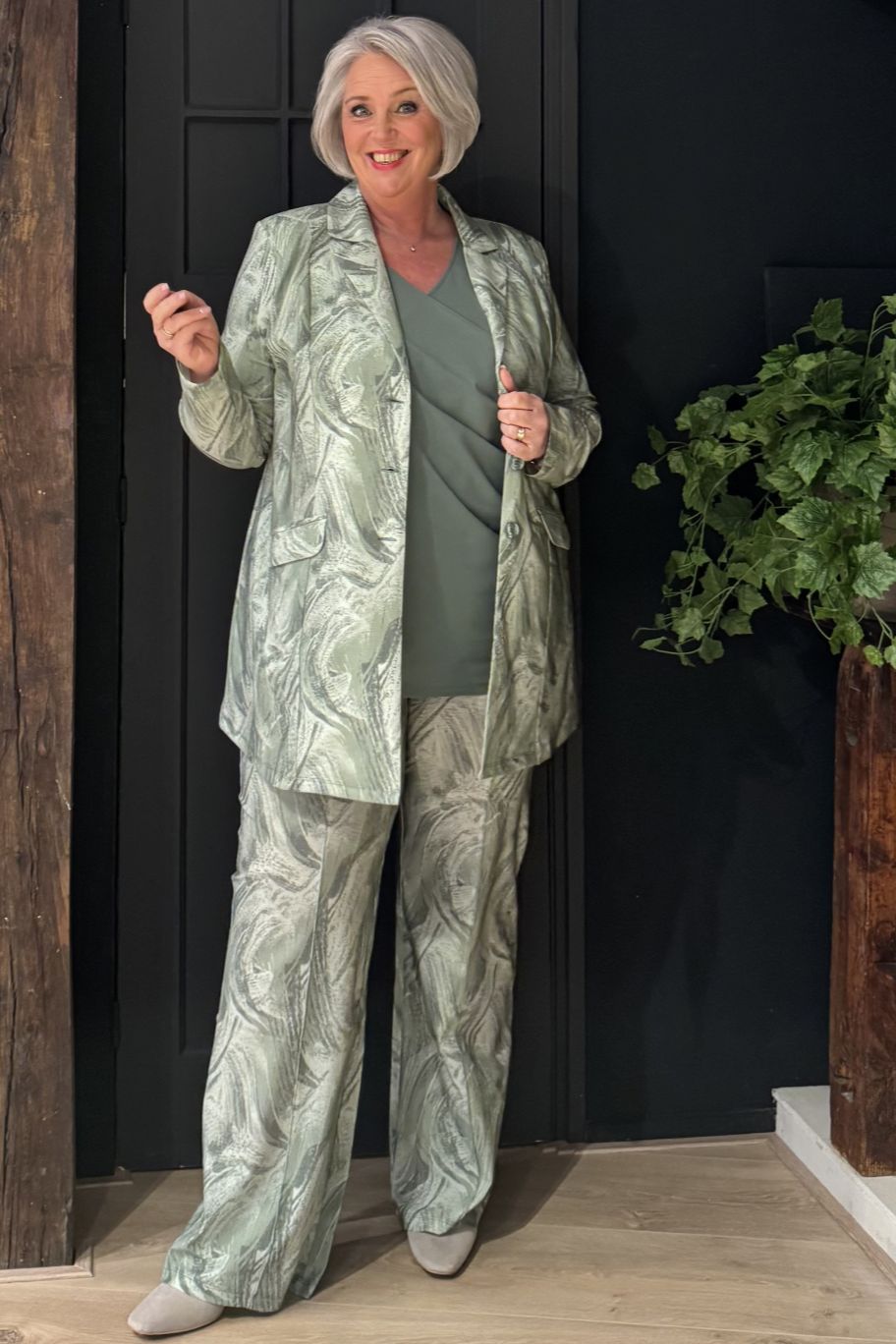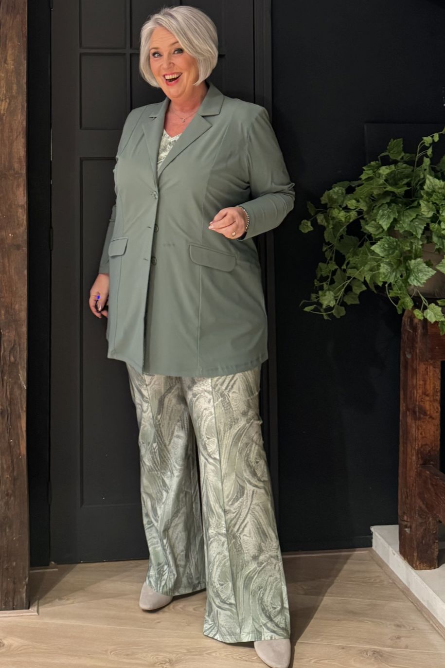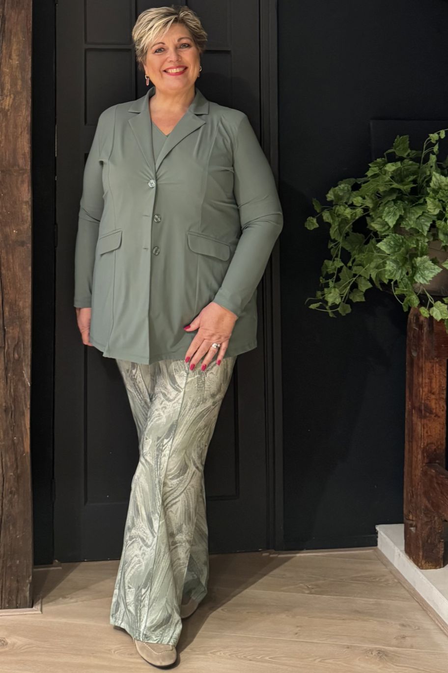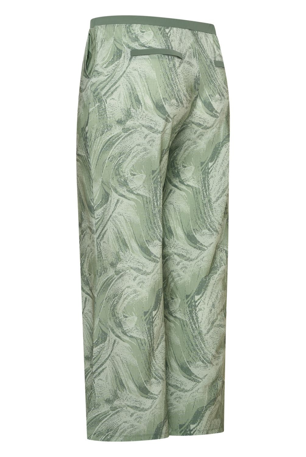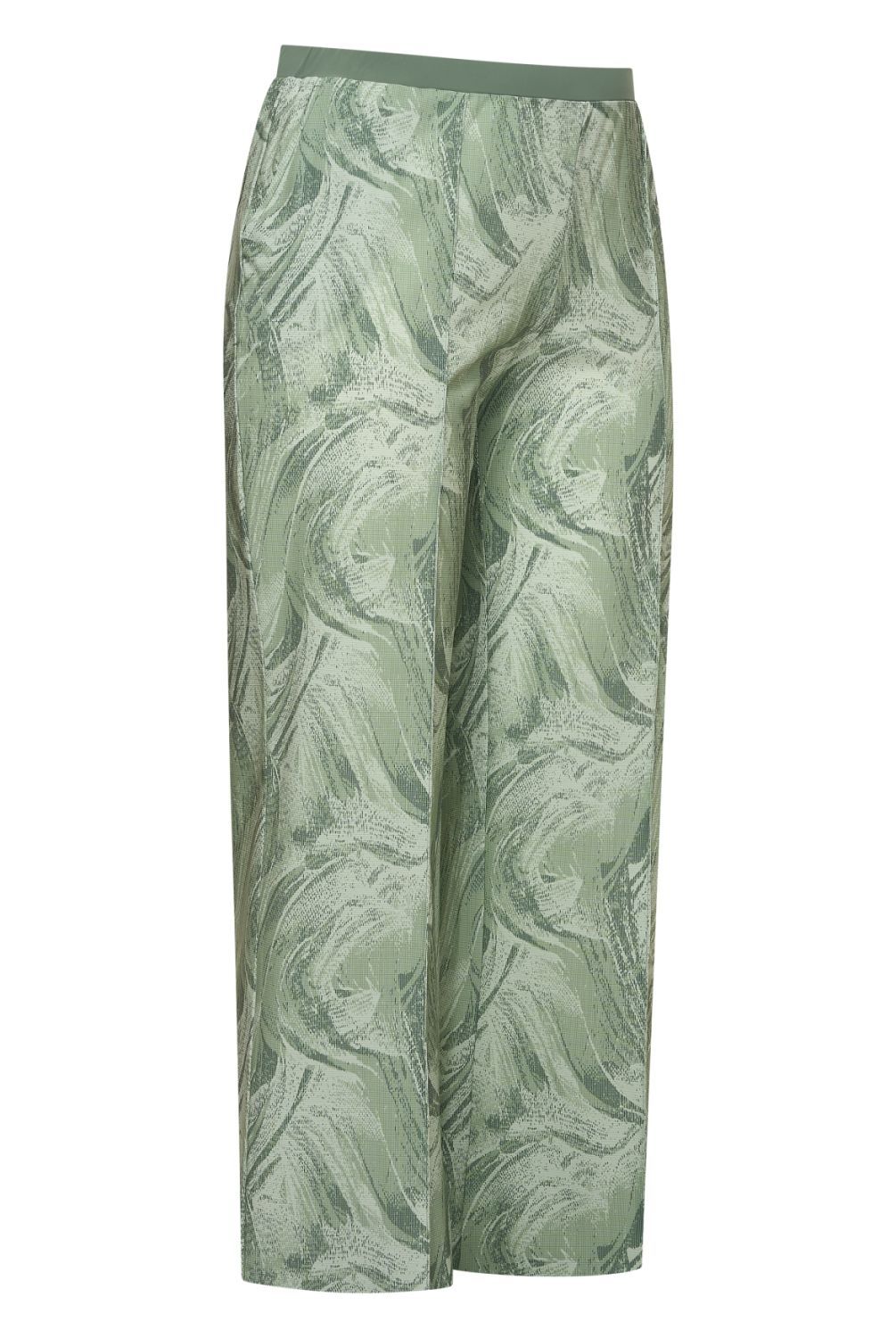 Wijde pantalon met elastische tailleband. Twee steekzakken voor en twee sier/fake strookzakken achter. Ingestikte naad op been voorzijde. Binnenbeen lengte 83 cm