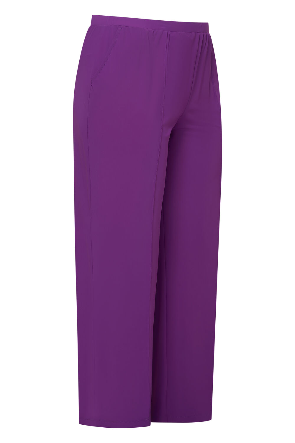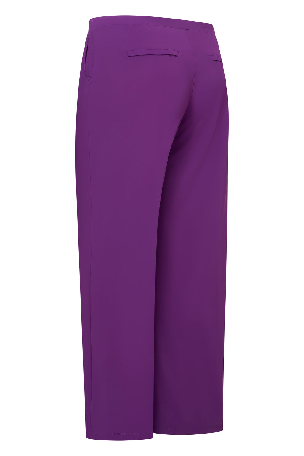 Wijde pantalon met elastische tailleband. Twee steekzakken voor en twee sier/fake strookzakken achter. Ingestikte naad op been voorzijde. Binnenbeen lengte 83 cm