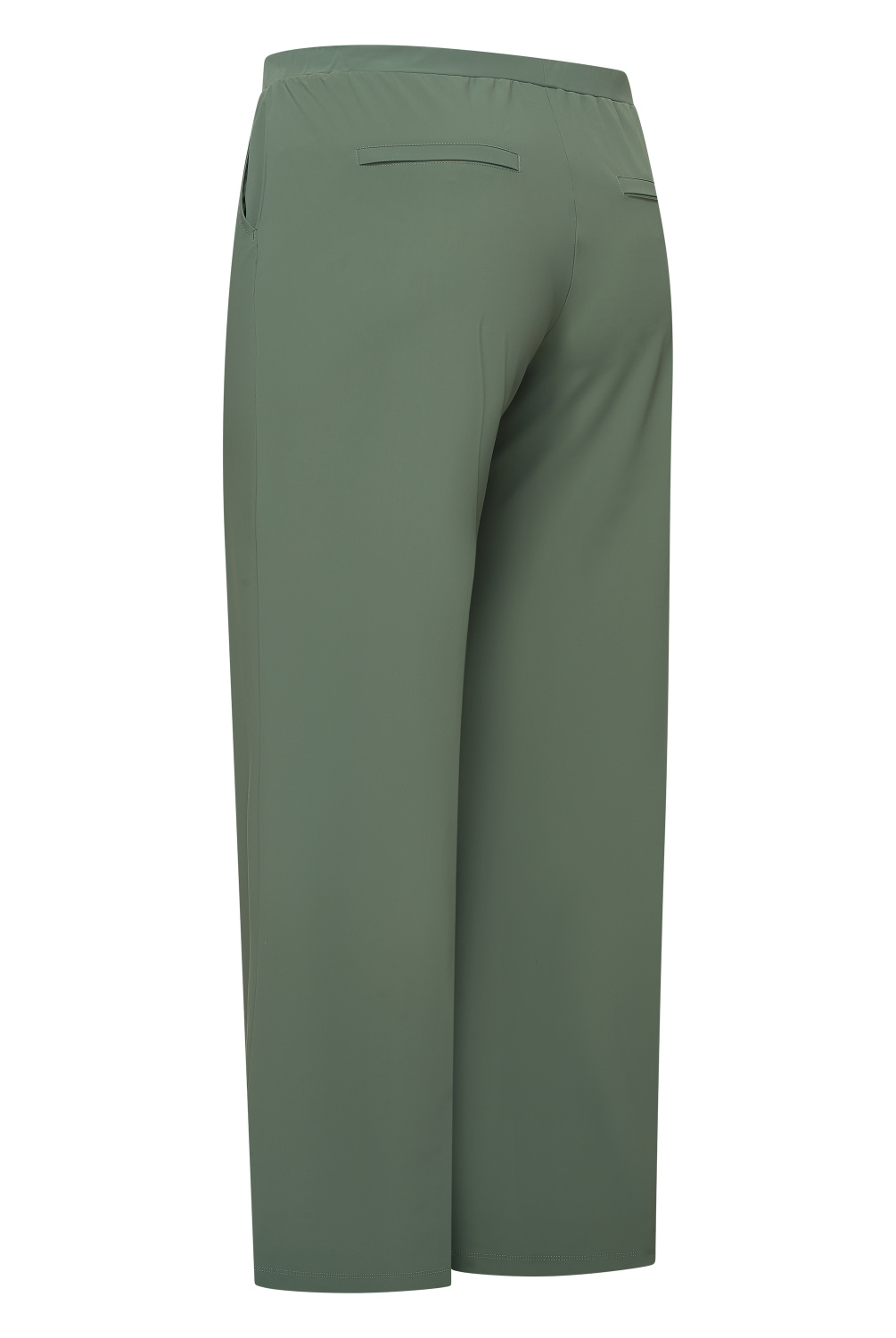 Wijde pantalon met elastische tailleband. Twee steekzakken voor en twee sier/fake strookzakken achter. Ingestikte naad op been voorzijde. Binnenbeen lengte 83 cm