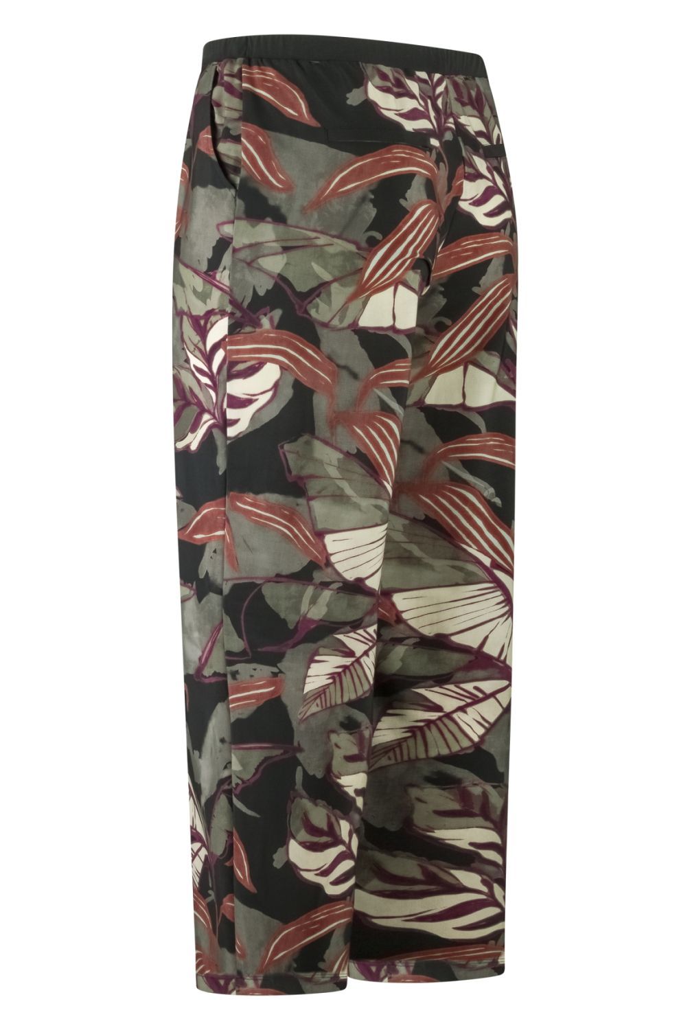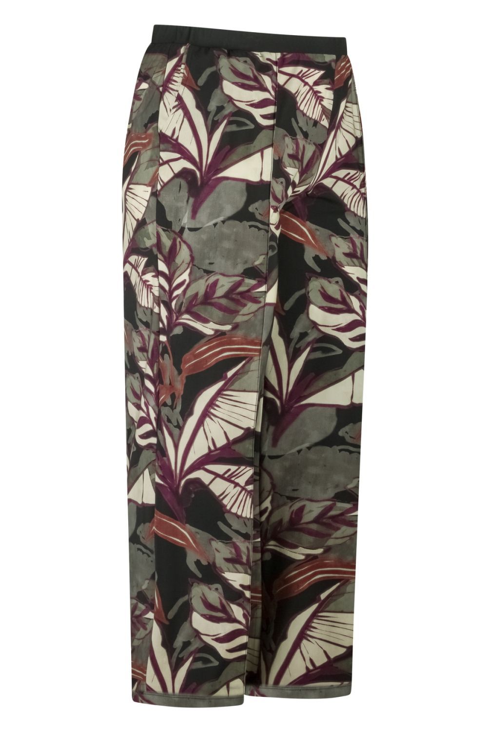 Wijde pantalon met elastische tailleband. Twee steekzakken voor en twee sier/fake strookzakken achter. Ingestikte naad op been voorzijde. Binnenbeen lengte 83 cm