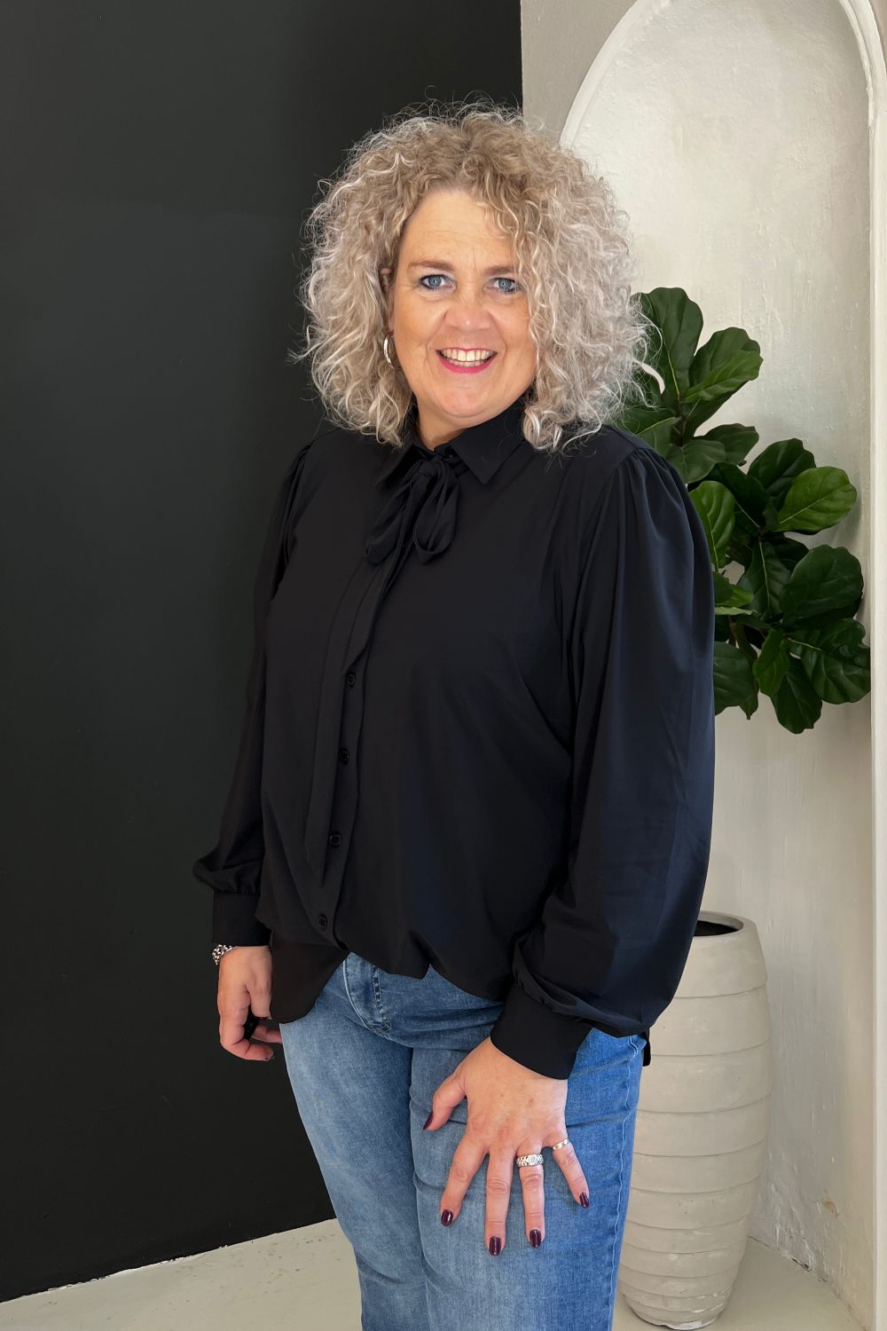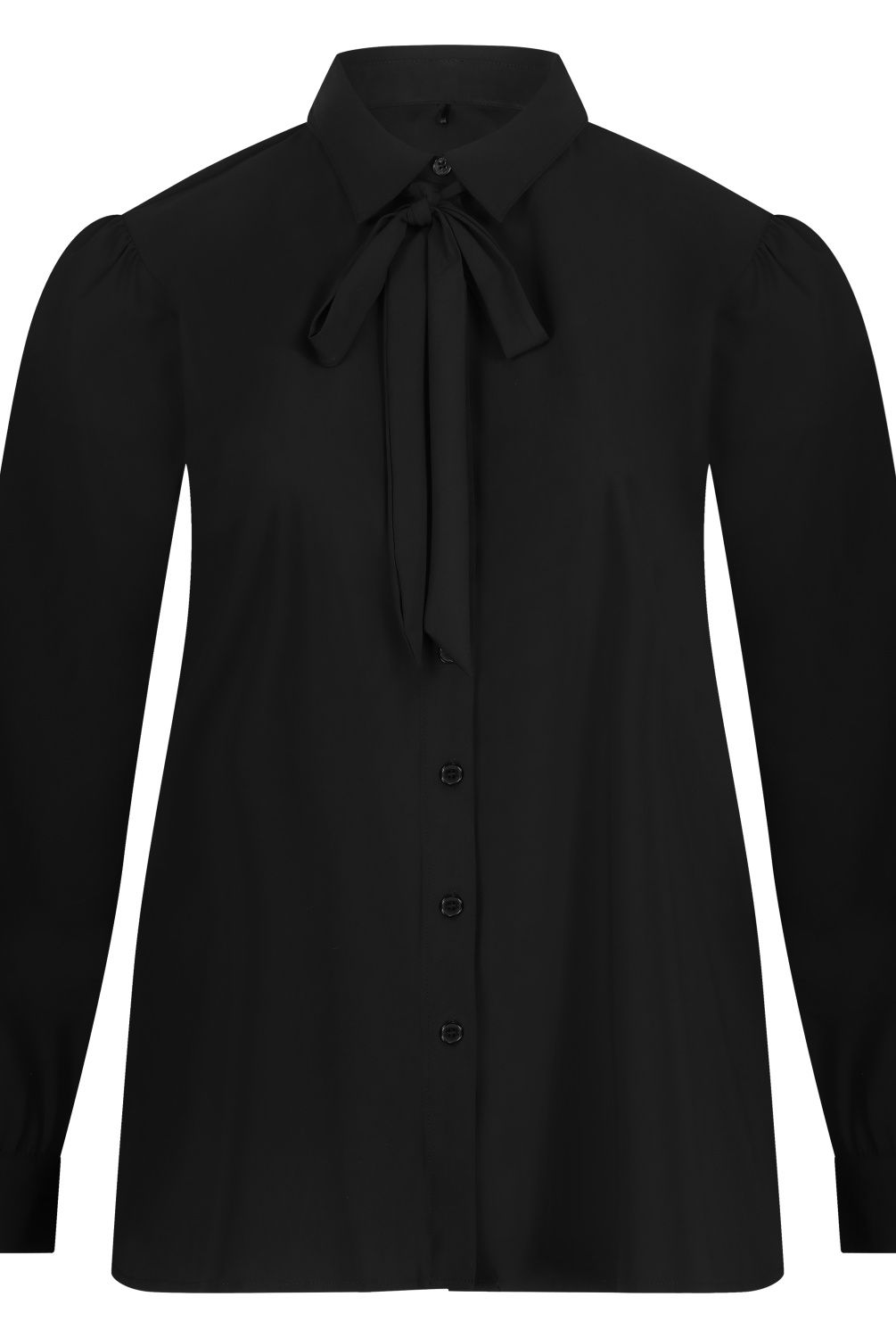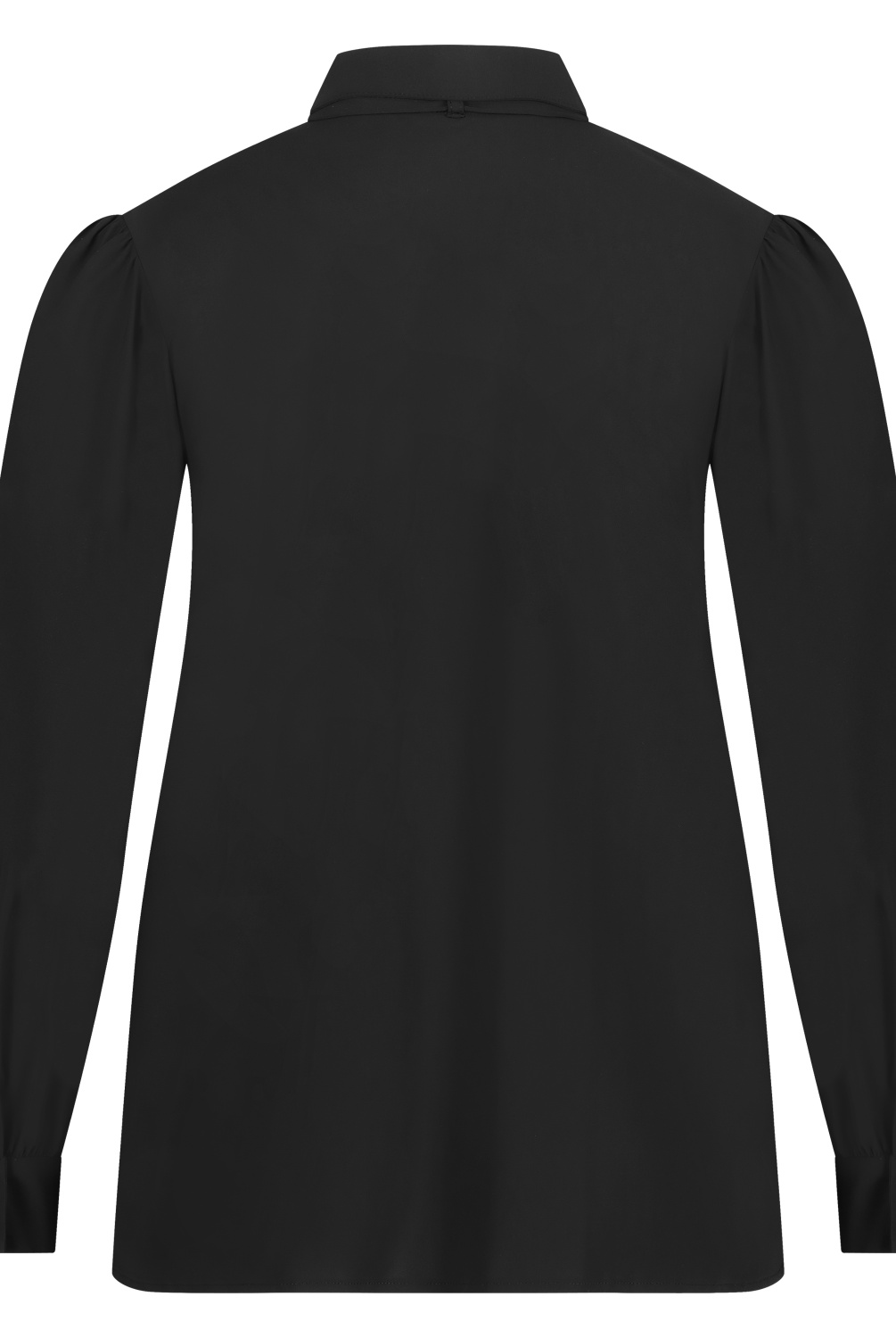Shirt Puffed met lange ietwat poffende mouwen met kleine plooitjes aan de schouderaanzet. Manchetten met twee knoopjes, afgeronde zoom met split. met of zonder decoratieve strik te dragen (strik gaat door lus in achterzijde kraag.)