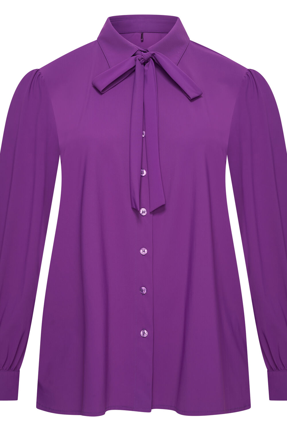Shirt Puffed met lange ietwat poffende mouwen met kleine plooitjes op de schouderaanzet. Manchet met twee knoopjes. Afneembare strik, afgeronde zoom met split.