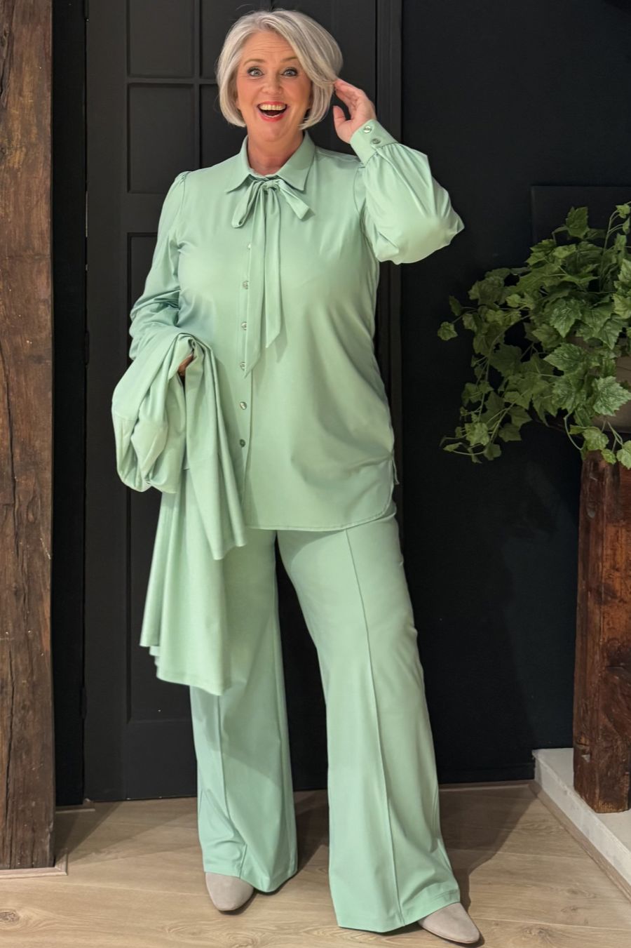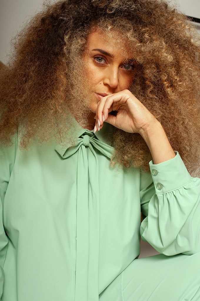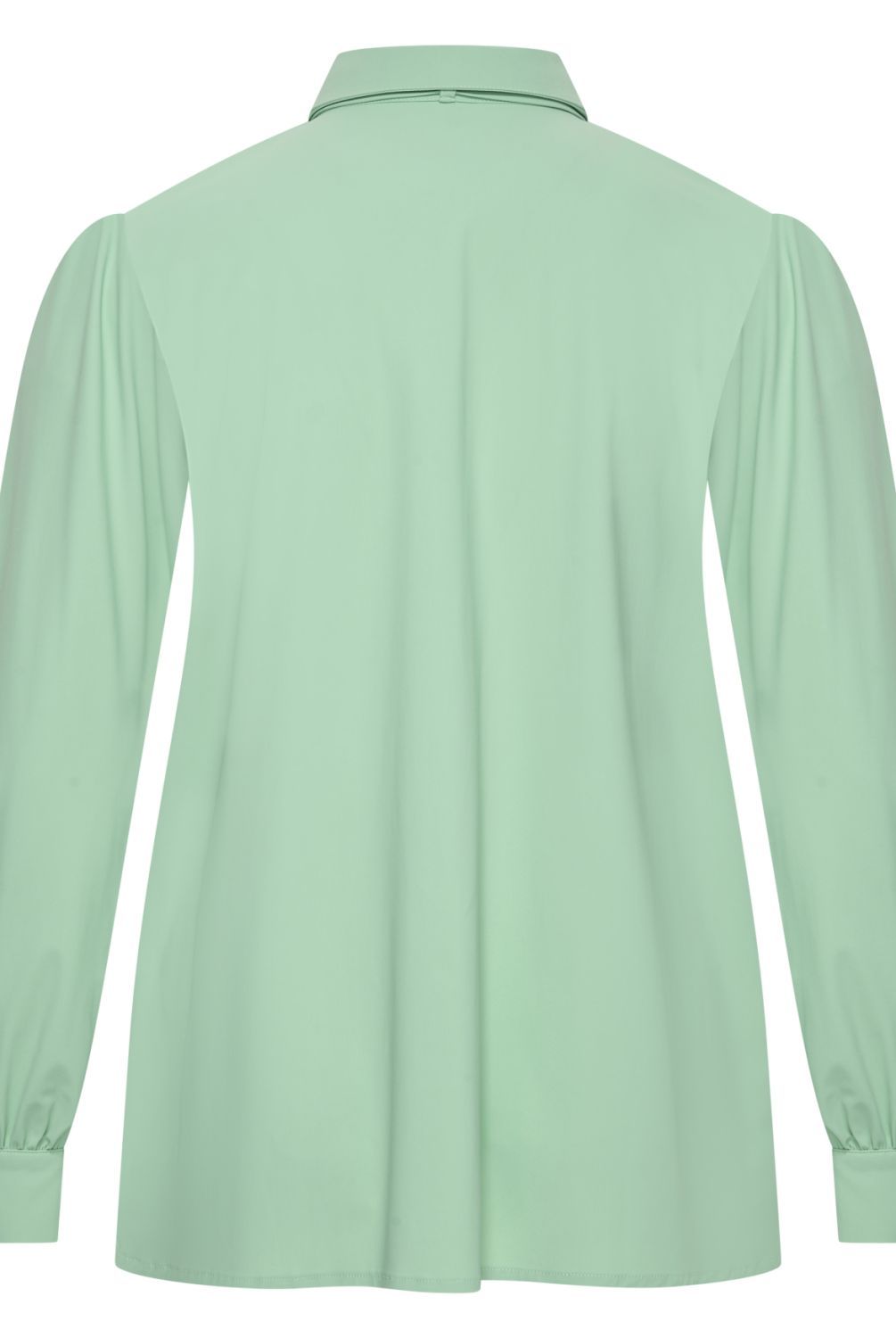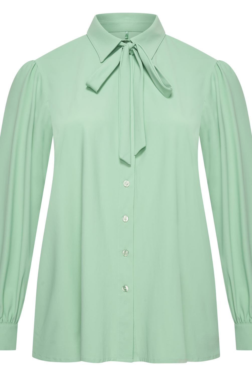 Shirt Puffed met lange ietwat poffende mouwen met kleine plooitjes op de schouderaanzet. Manchet met twee knoopjes. Afneembare strik, afgeronde zoom met split.