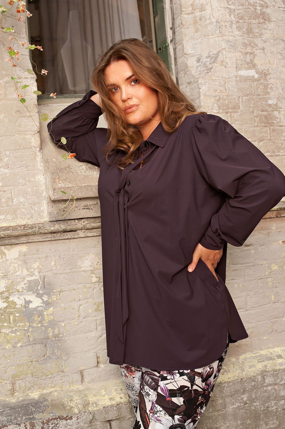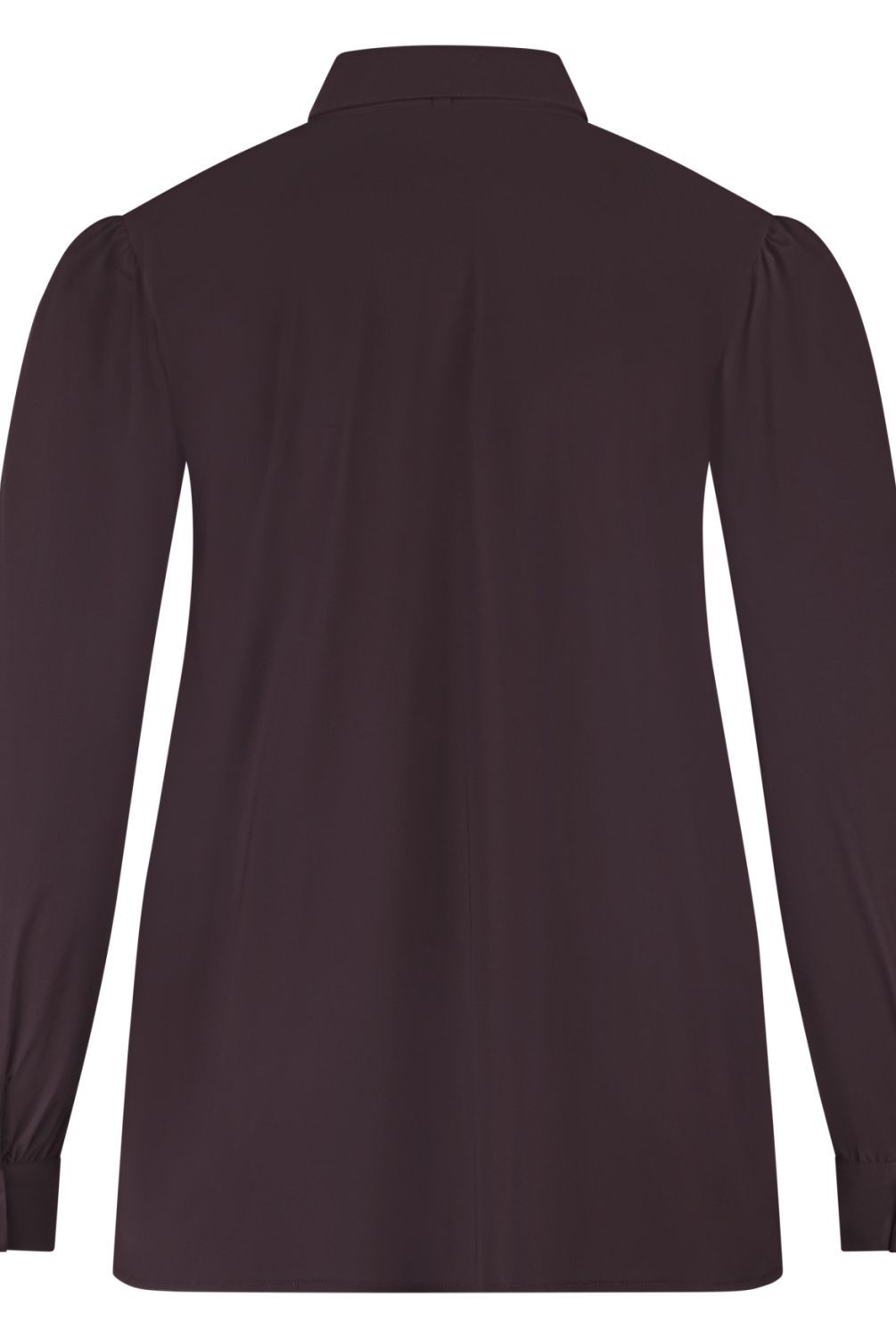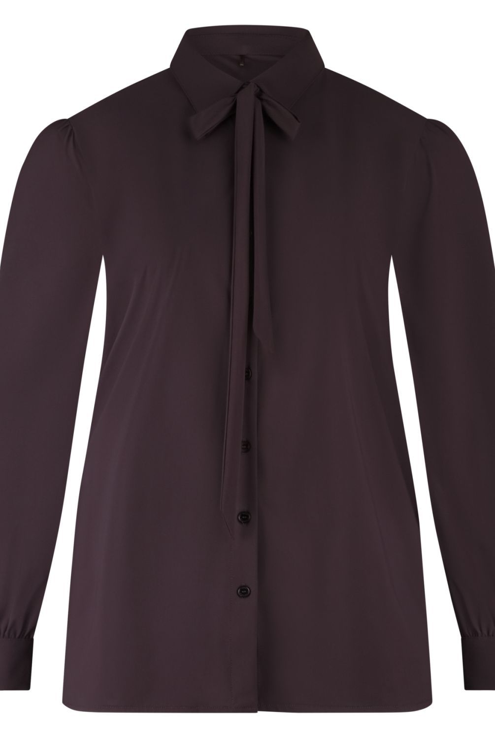 Shirt Puffed met lange ietwat poffende mouwen met kleine plooitjes op de schouderaanzet. Manchet met twee knoopjes. Afneembare strik, afgeronde zoom met split.