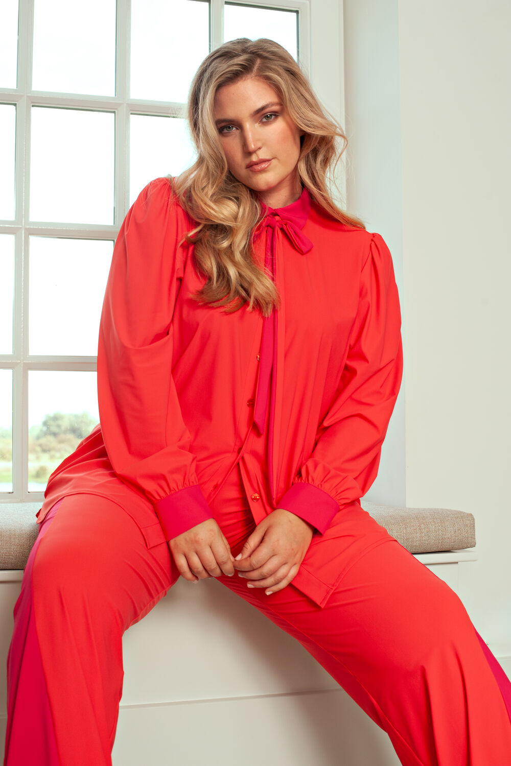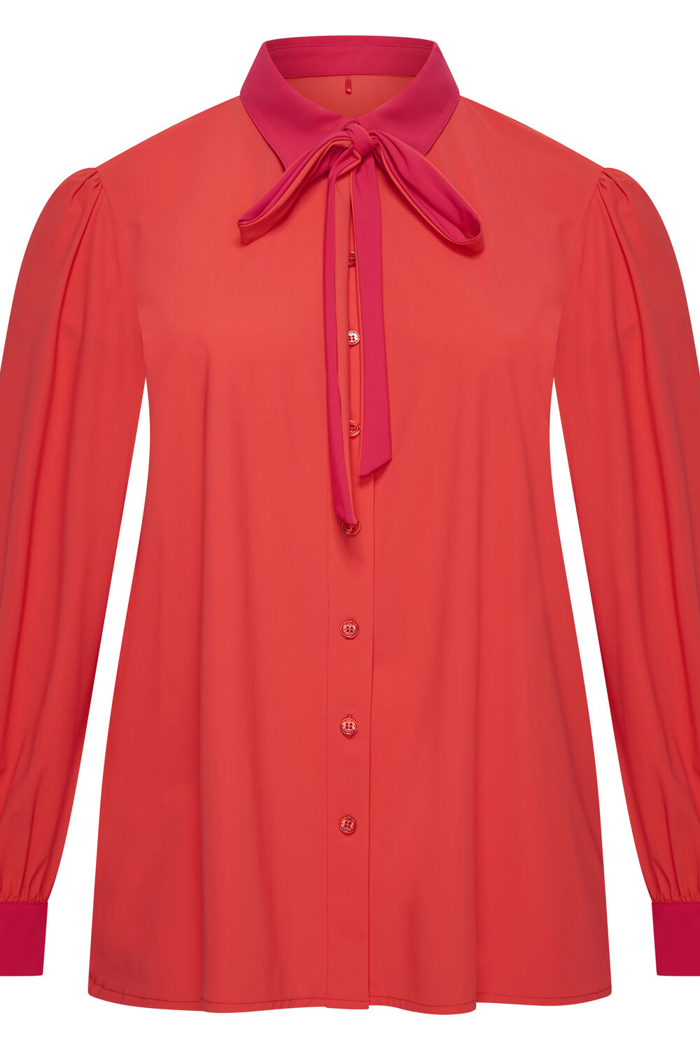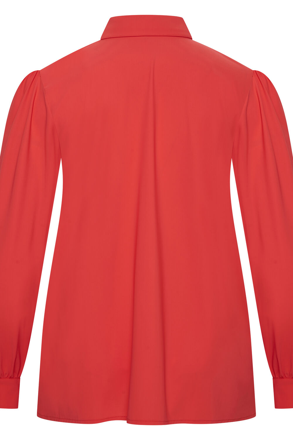 Shirt Puffed met lange ietwat poffende mouwen met kleine plooitjes op de schouderaanzet. Manchet met twee knoopjes. Afneembare strik, afgeronde zoom met split.