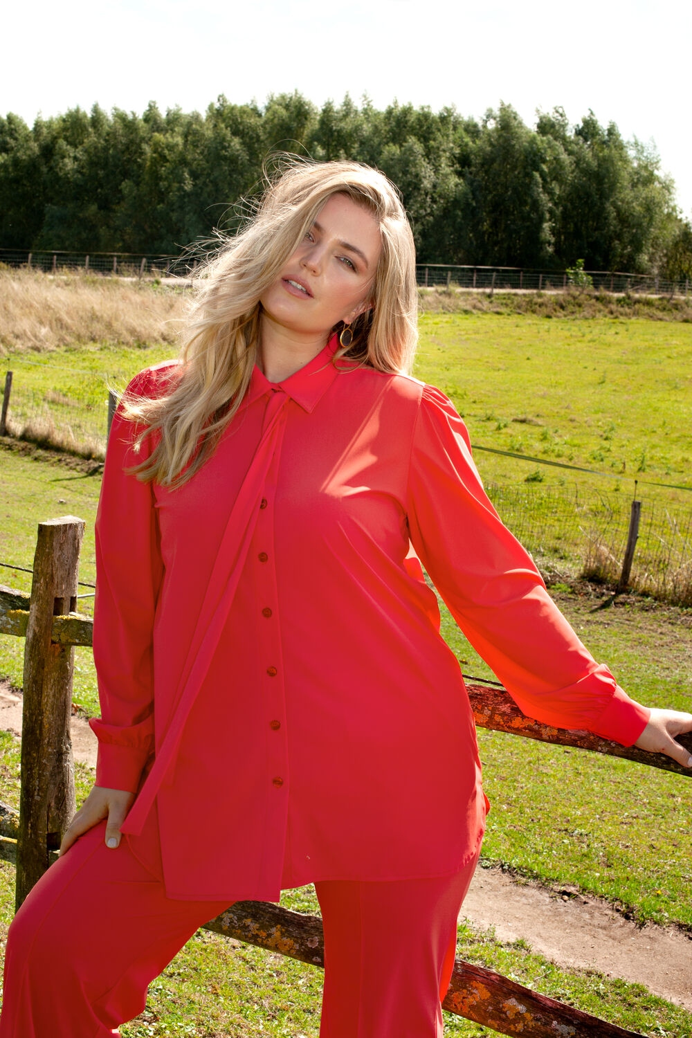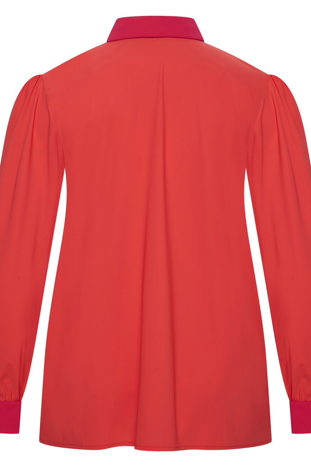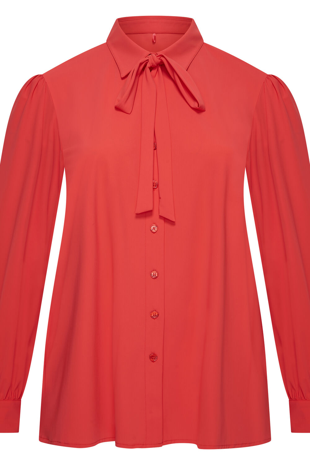 Shirt Puffed met lange ietwat poffende mouwen met kleine plooitjes op de schouderaanzet. Manchet met twee knoopjes. Afneembare strik, afgeronde zoom met split.