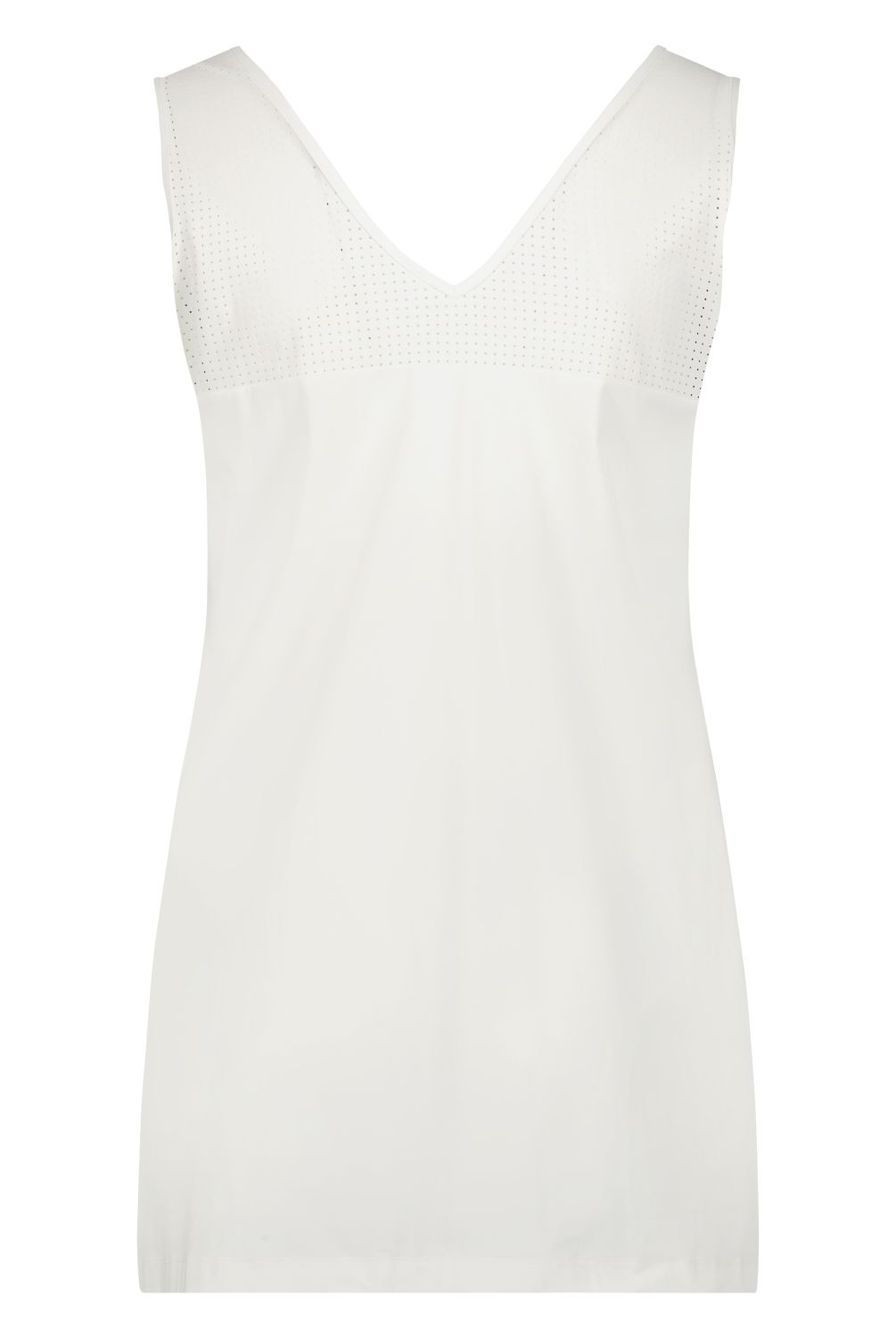 Een licht uitlopende mouwloze top. Zowel met ronde halslijn als met V-hals voor te dragen. Hals en armsgat zijn afgebiesd.