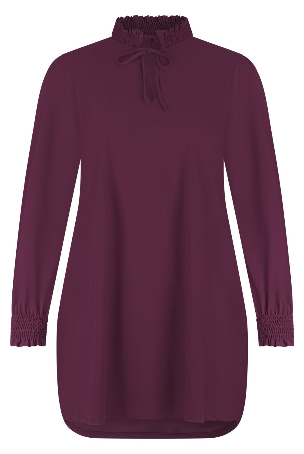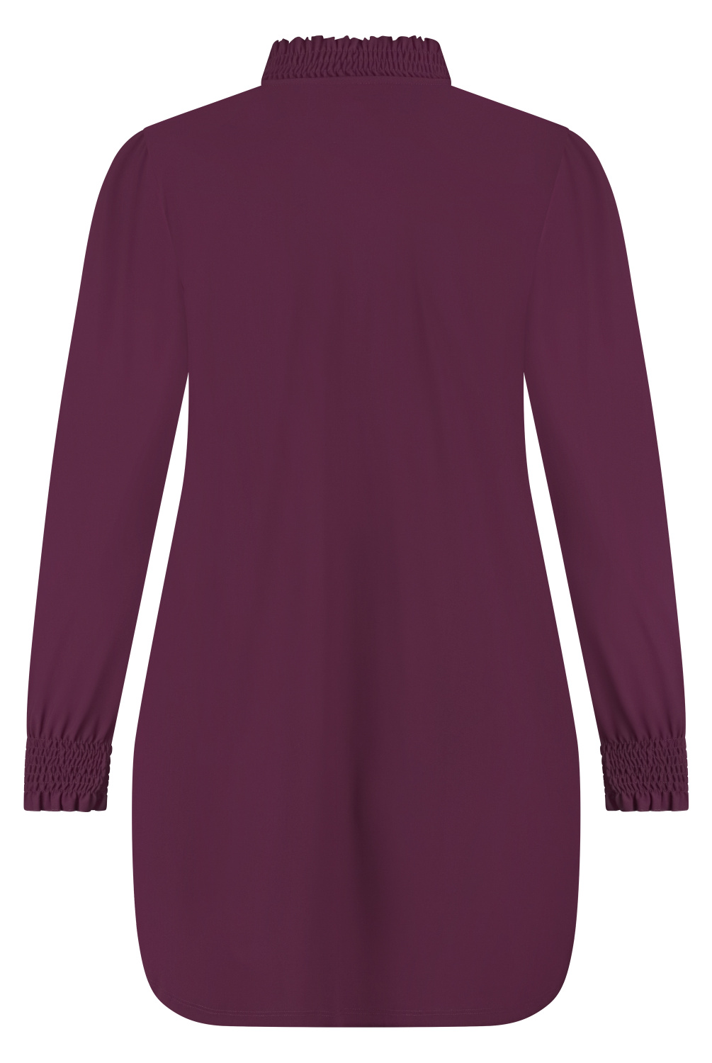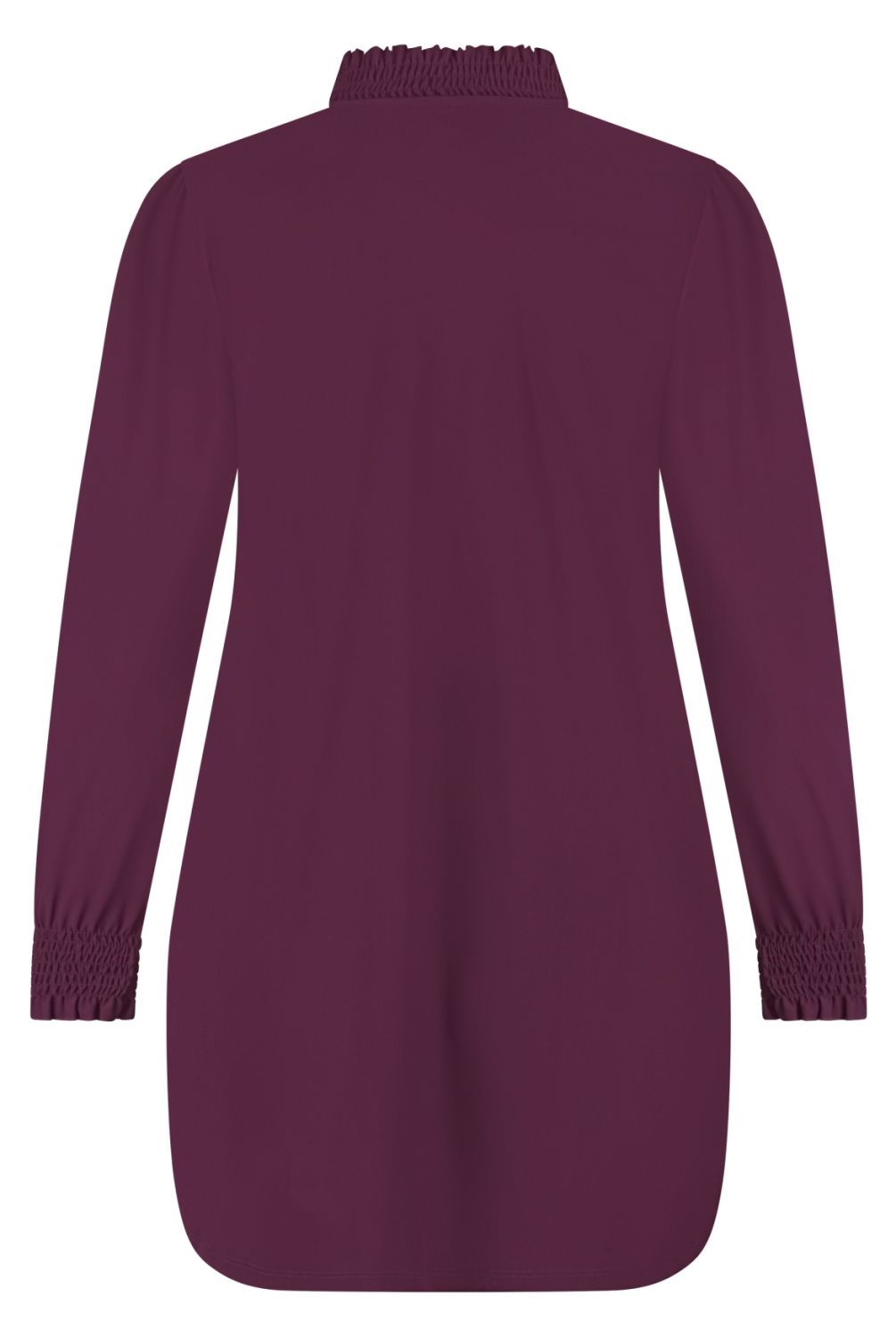 Uitlopende top met klein opstaand smockkraagje met striksluiting. De top heeft schoudervullingen, kleine plooien op de schouder, lange poffende mouwen met gesmockte elastische manchetten.