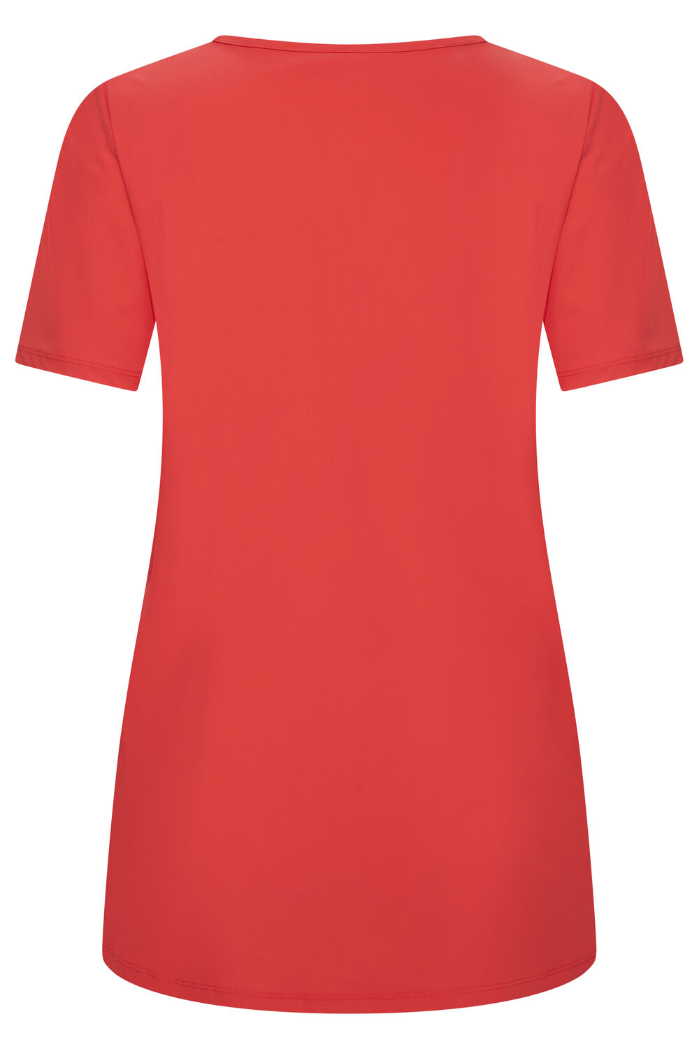 T-shirt met ronde hals en slanke mouw tot aan de elleboog.