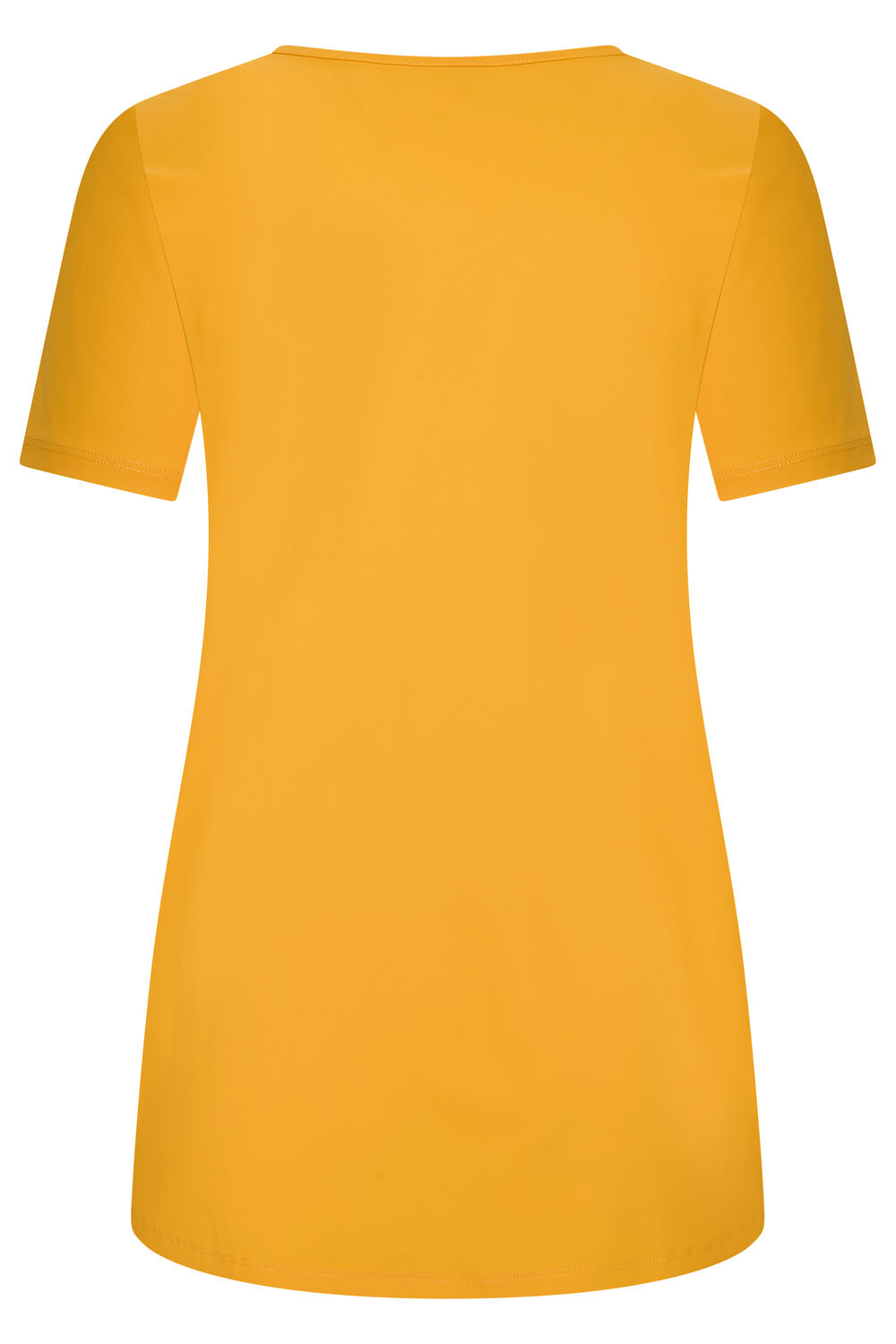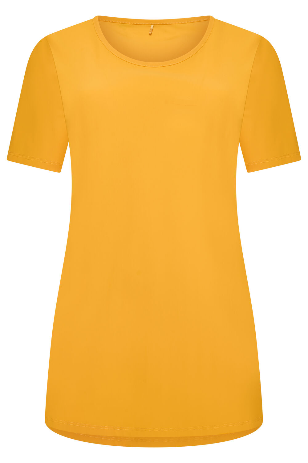 T-shirt met ronde hals en slanke mouw tot aan de elleboog.