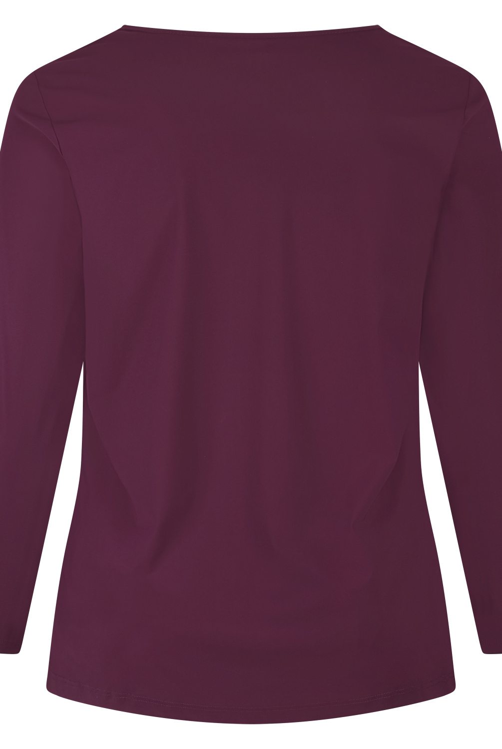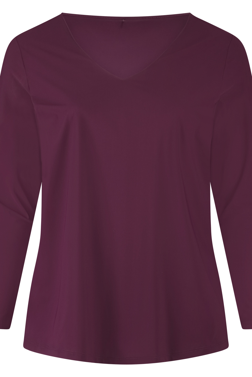 Top met V-hals en kort, aansluitend mouwtje. Slankere en kortere fit. Lengte 78 cm (mt 46)