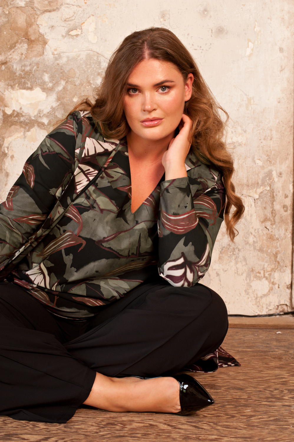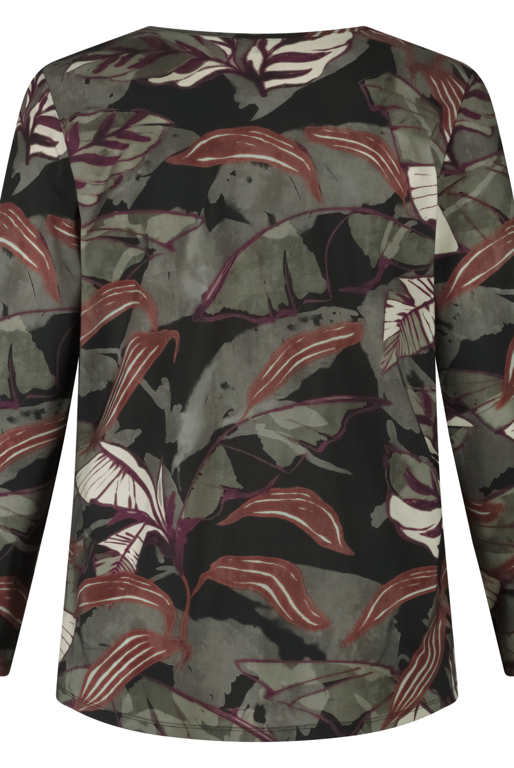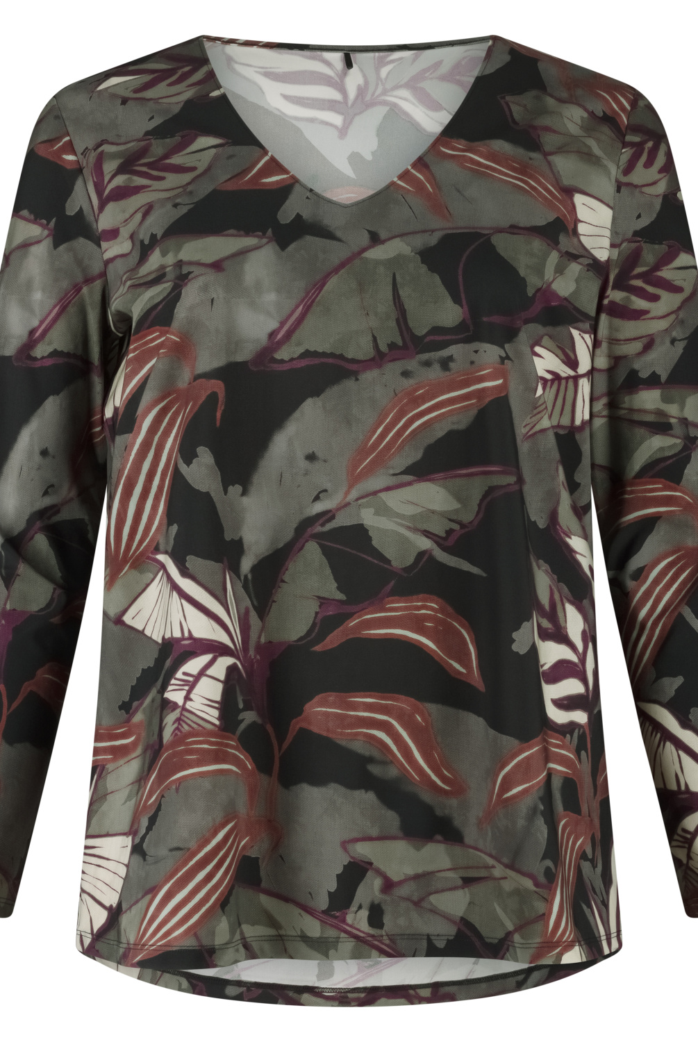 Top met V-hals en lange aansluitend mouw. Slankere en kortere fit. Lengte 78 cm (mt 46)