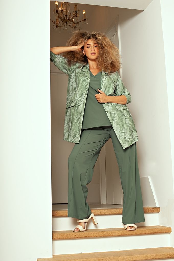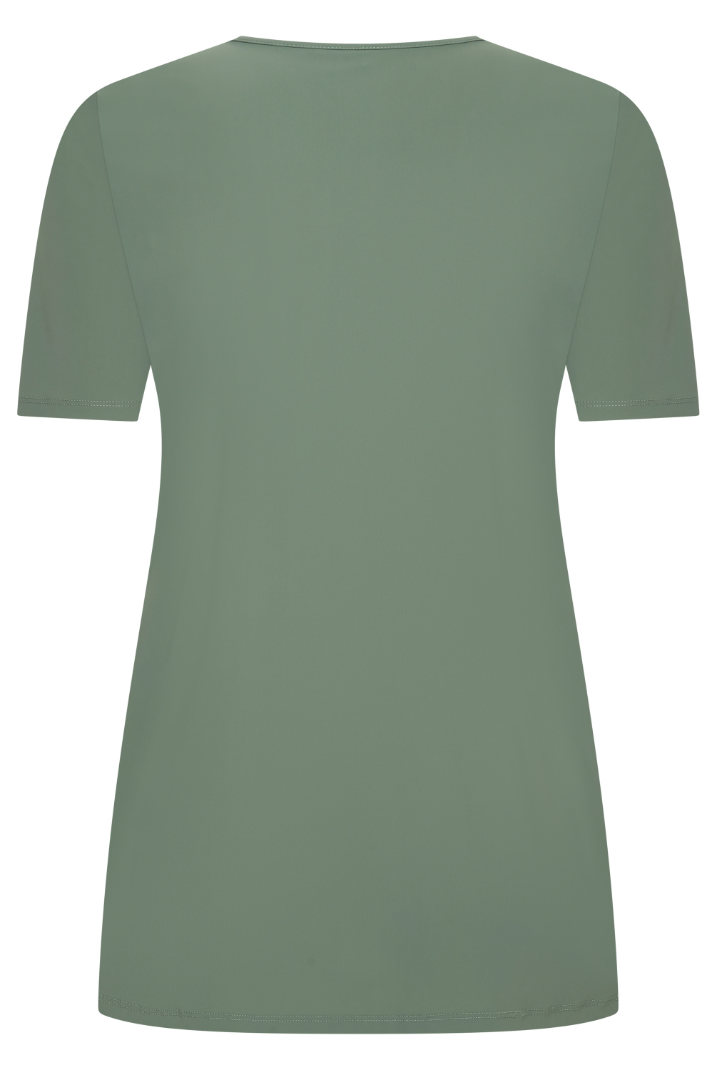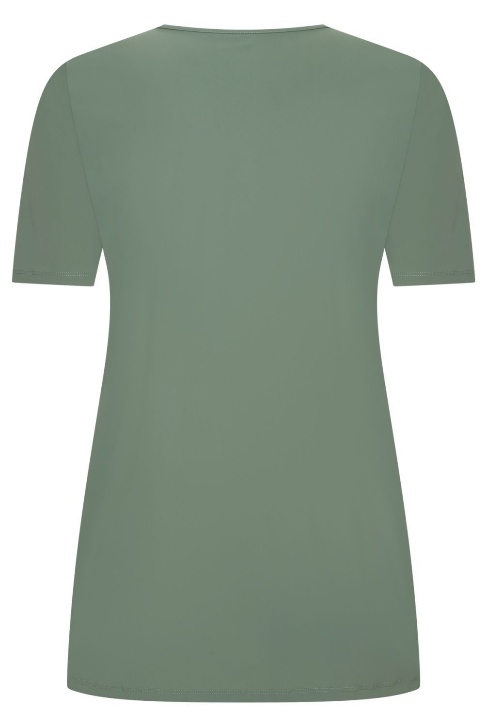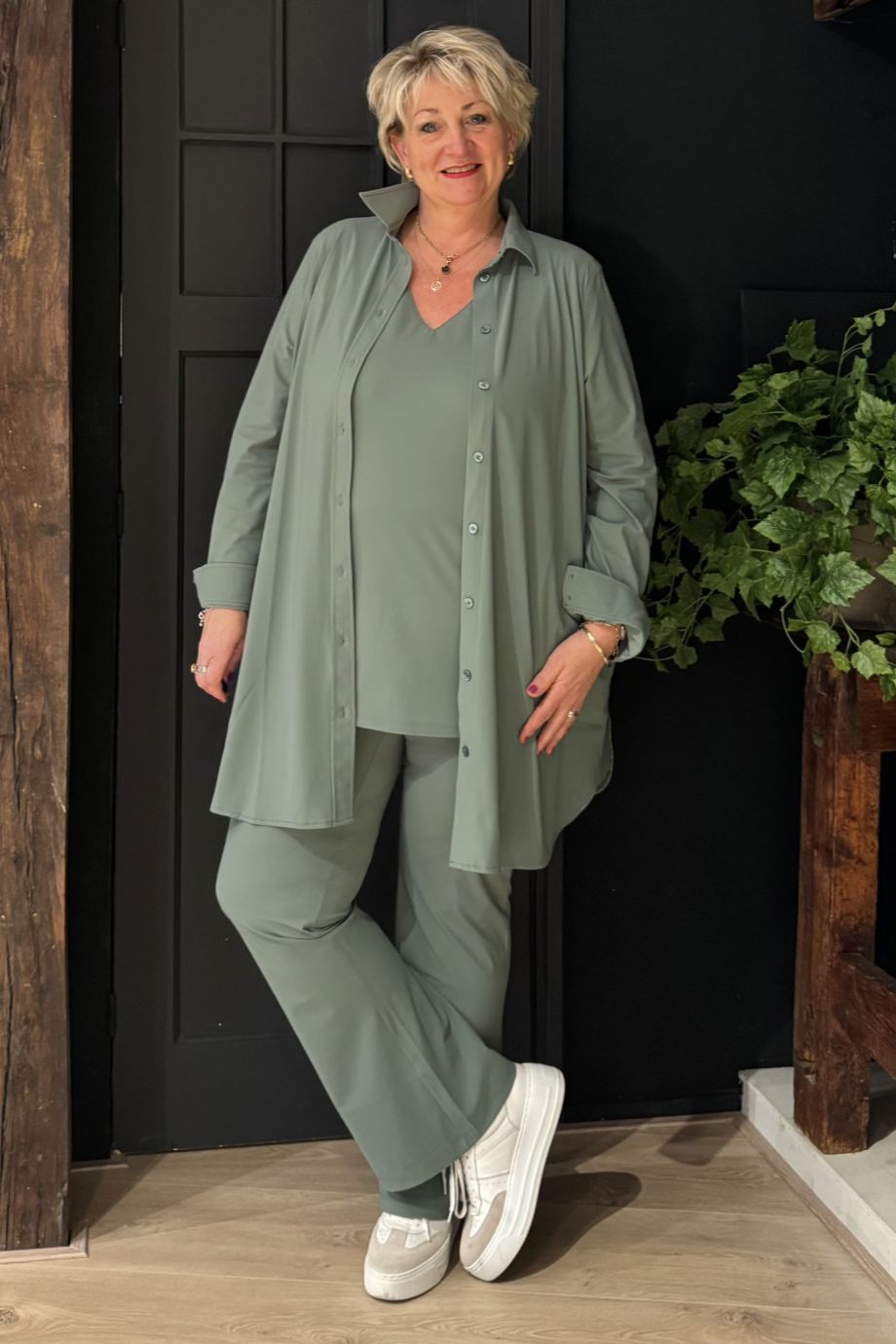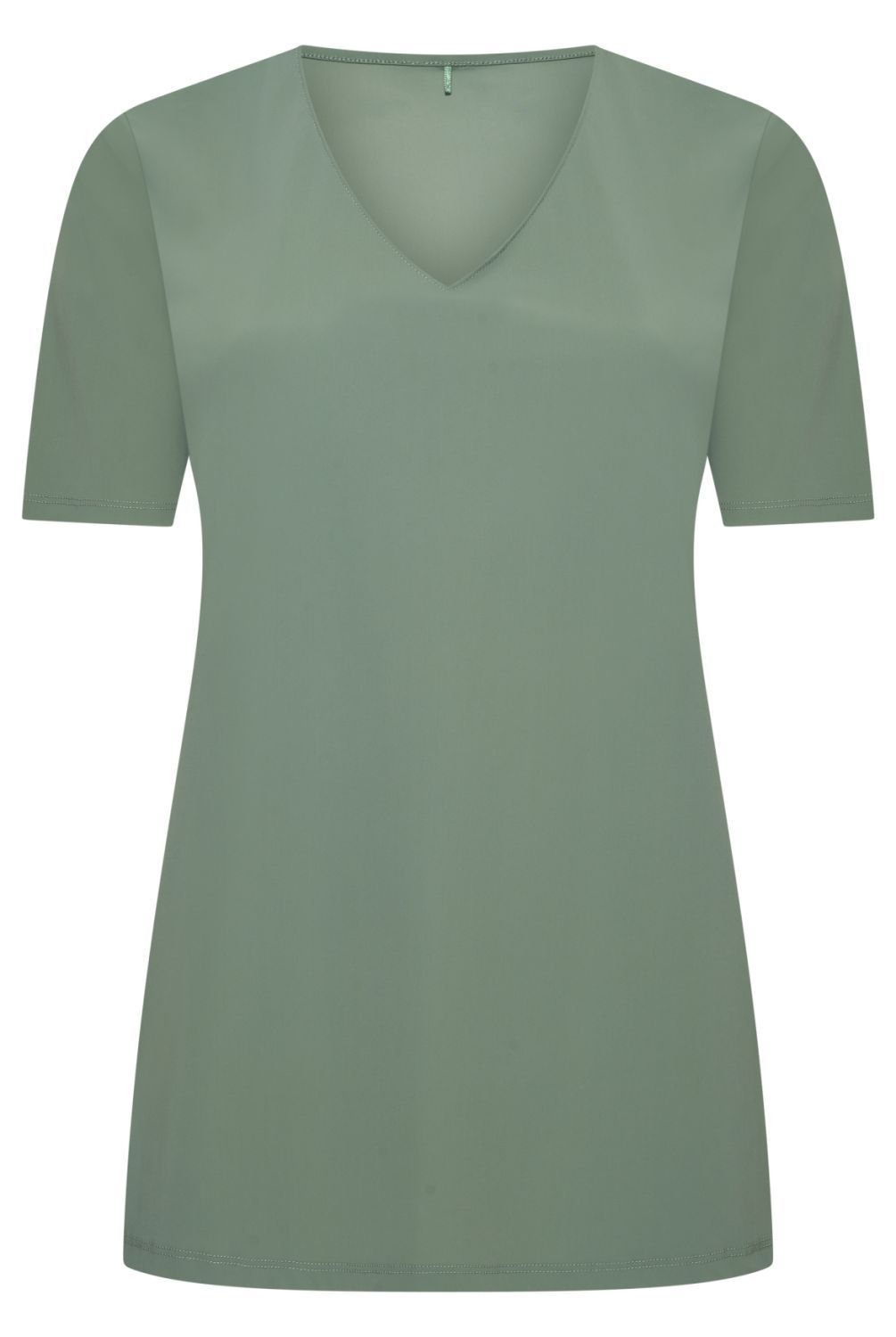 Top met V-hals en kort, aansluitend mouwtje. Slankere en kortere fit. Lengte 78 cm (mt 46)