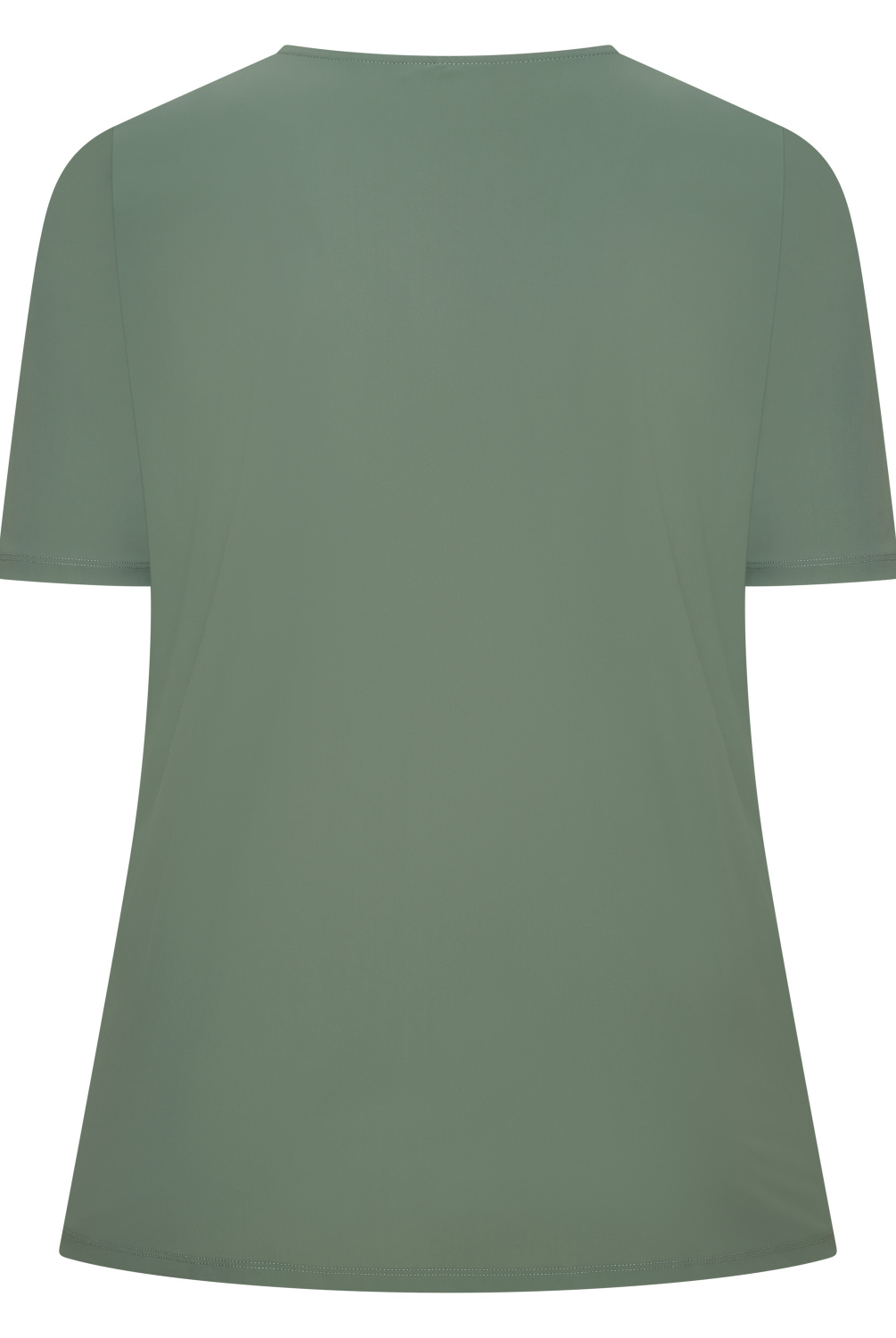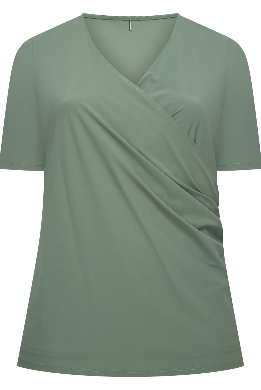 Top met V-hals en overslag met plooitjes aan de voorzijde. Korte mouwen.