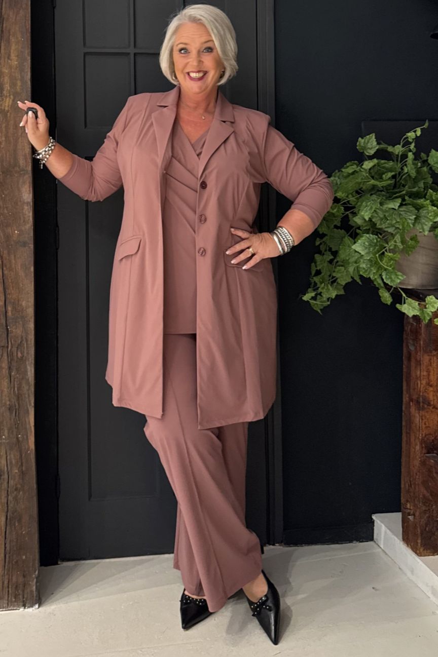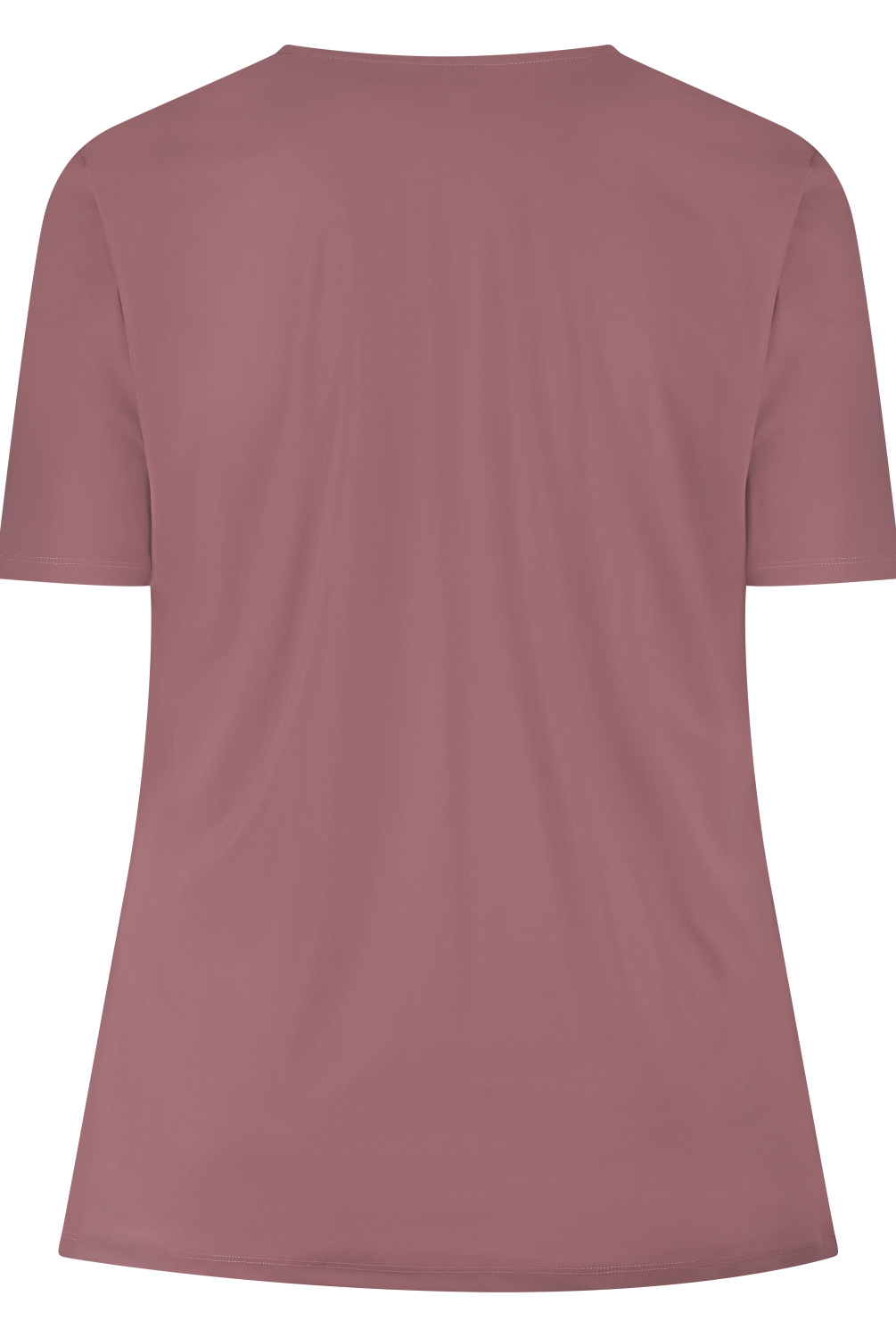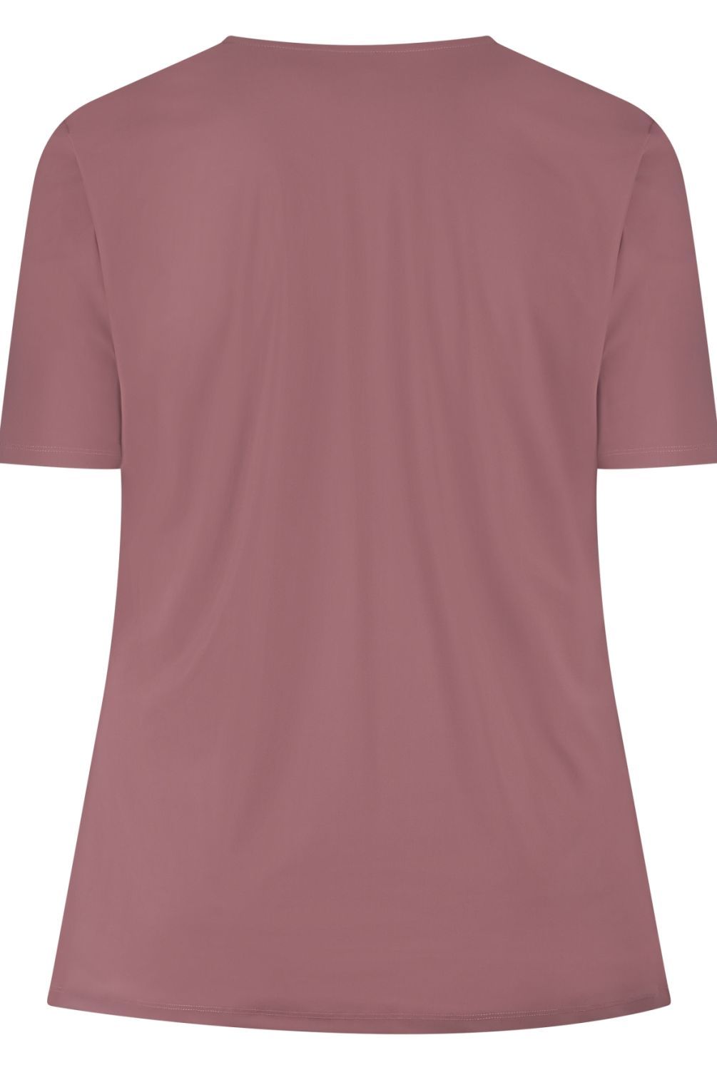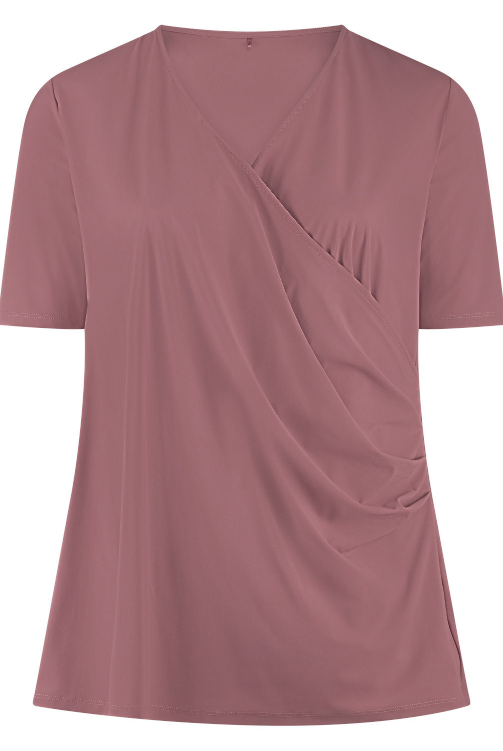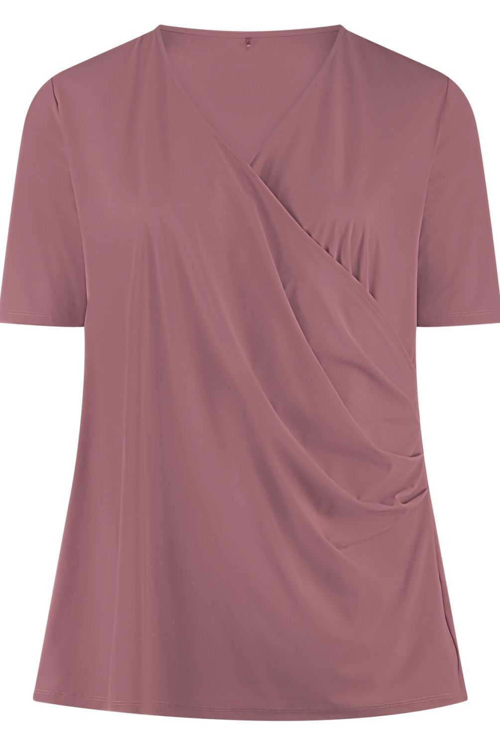 Top met V-hals en overslag met plooitjes aan de voorzijde. Korte mouwen.