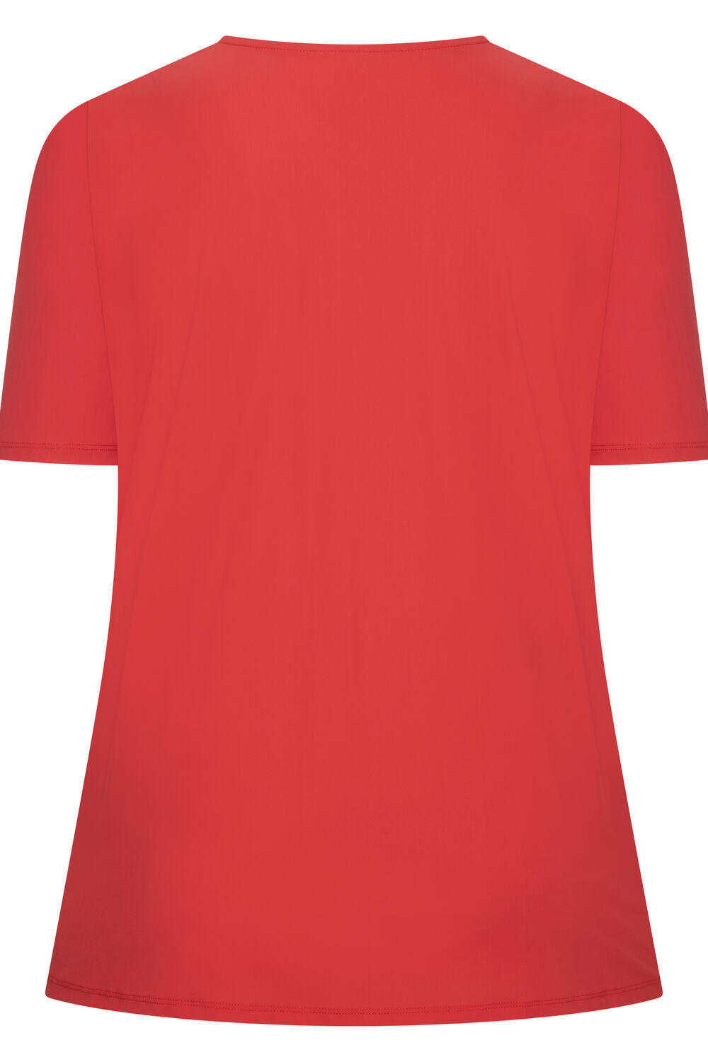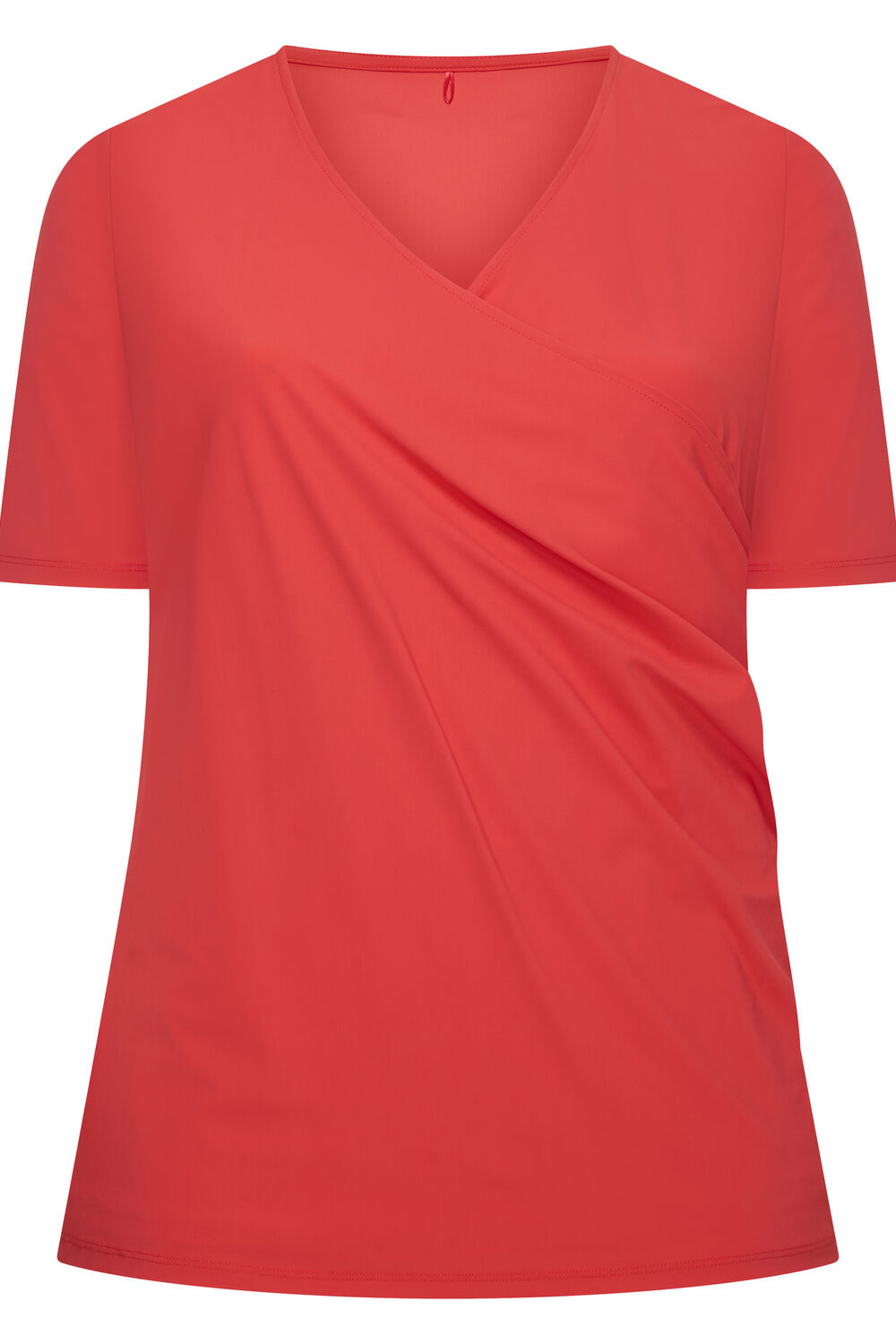 Top met V-hals en overslag met plooitjes aan de voorzijde. Korte mouwen.