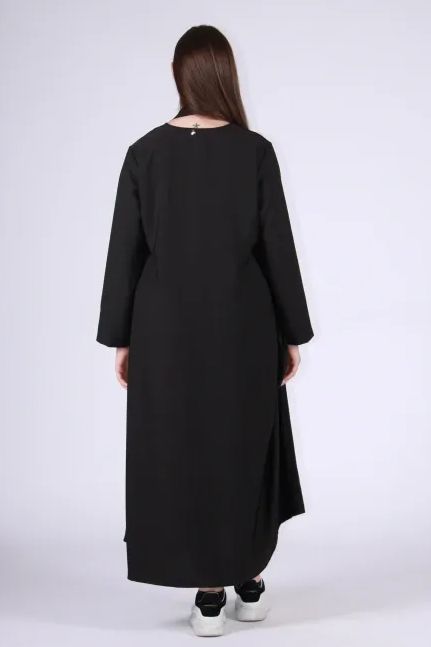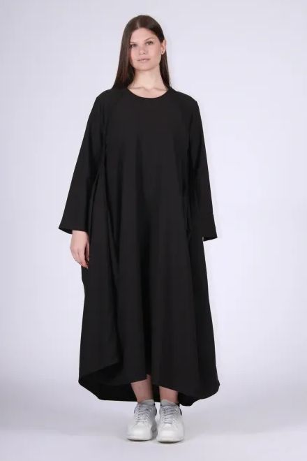 Jurk met een eigentijdse uitstraling, gekenmerkt door vloeiende volumes en gedeconstrueerde lijnen die een natuurlijke elegantie creëren. De ruime pasvorm geeft beweging en stijl, terwijl het minimalistische ontwerp het bijzonder veelzijdig maakt: iconisch wanneer het los gedragen wordt, en ultra chic met een riem. Een karaktervol kledingstuk, ontworpen om zich met eenvoud te onderscheiden.