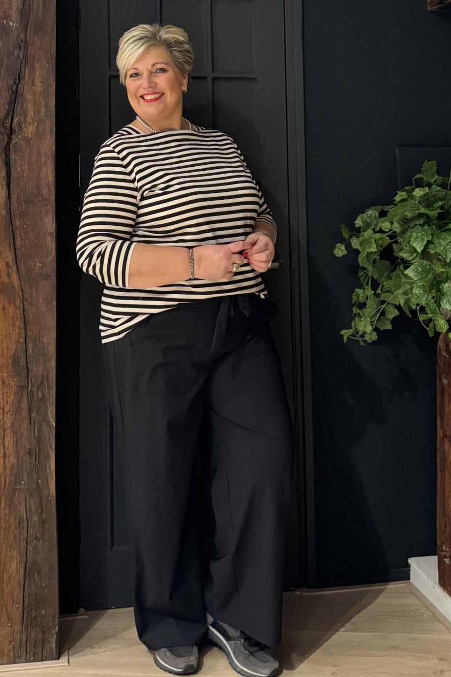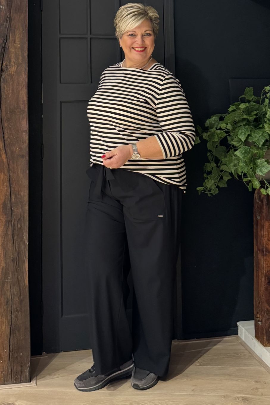 Broek met opliggende zakken en bindceintuur, fake zakken op de achterzijde