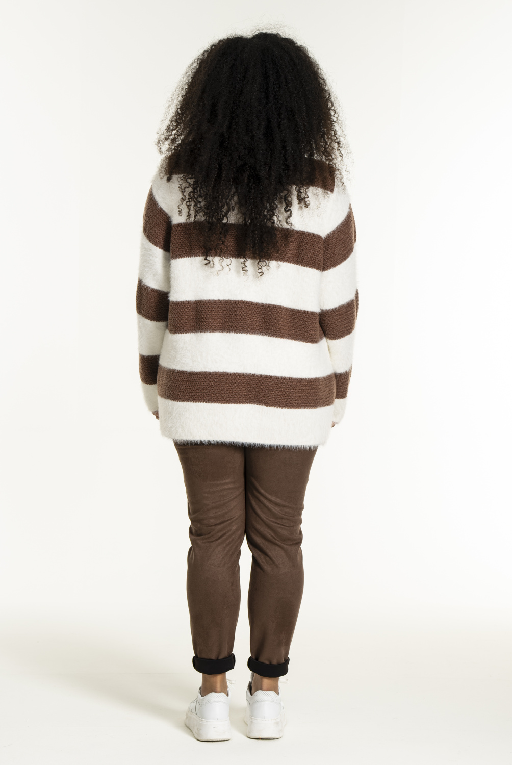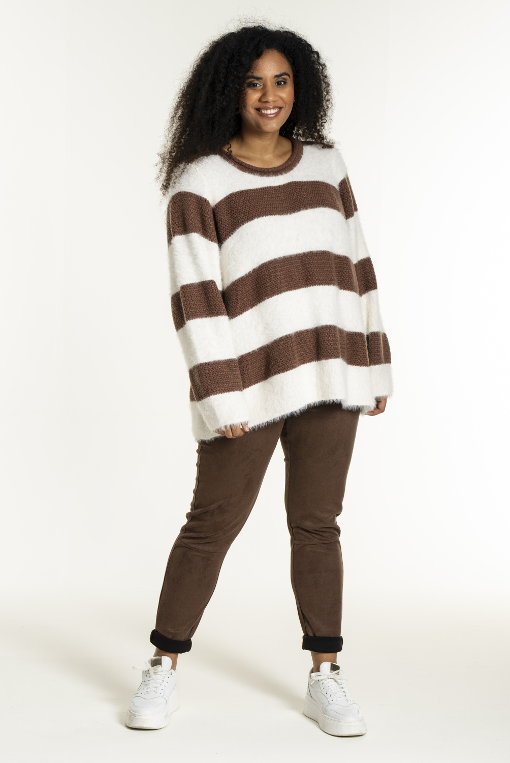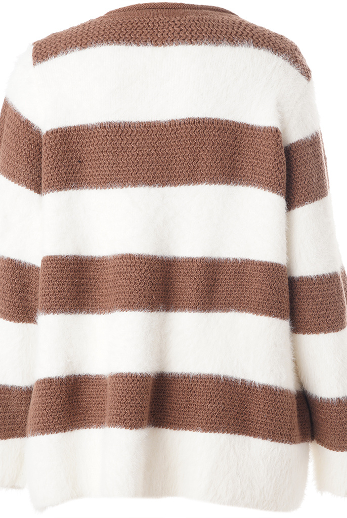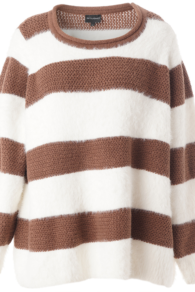 Prachtige gebreide trui met brede strepen. De stijl heeft een losse en comfortabele pasvorm met een ronde halslijn en lange mouwen. De kwaliteit is een mix van polyamide en polyester, wat zorgt voor een mooie en lichte pluizige textuur