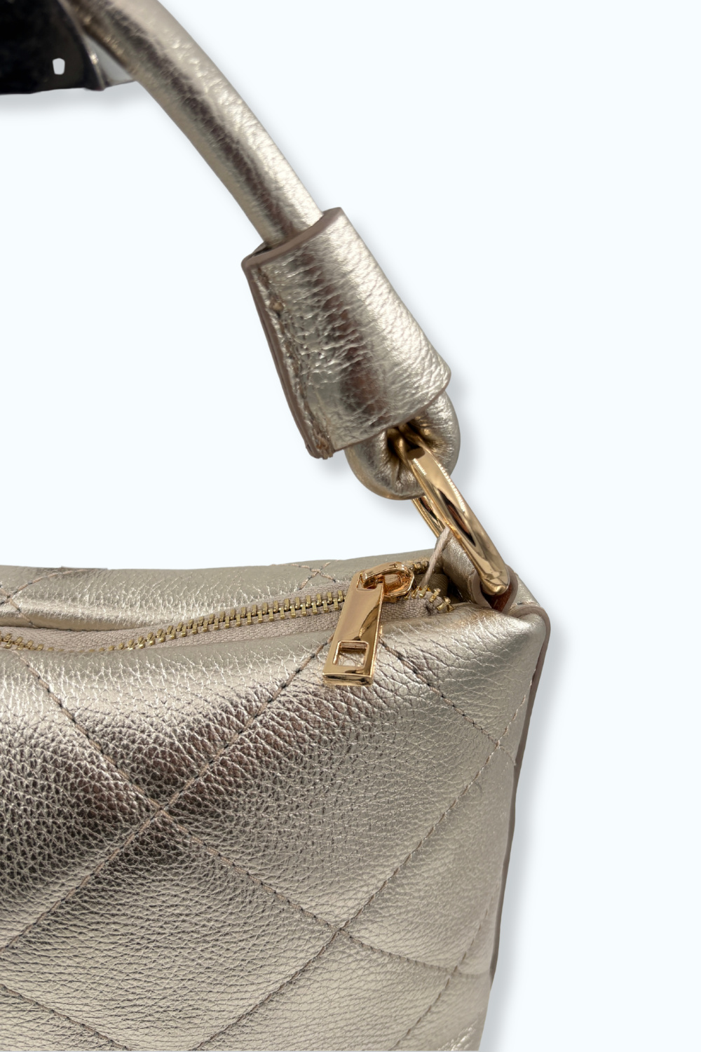 Goud gespoten tas van echt leer, gemaakt in Italië. Bevat een extra opbergvak met rits binnenin.