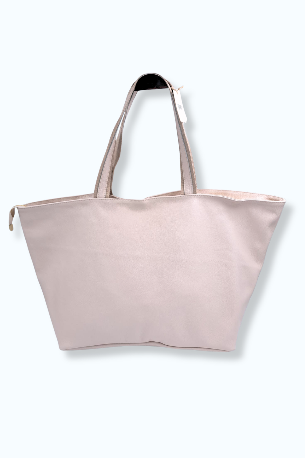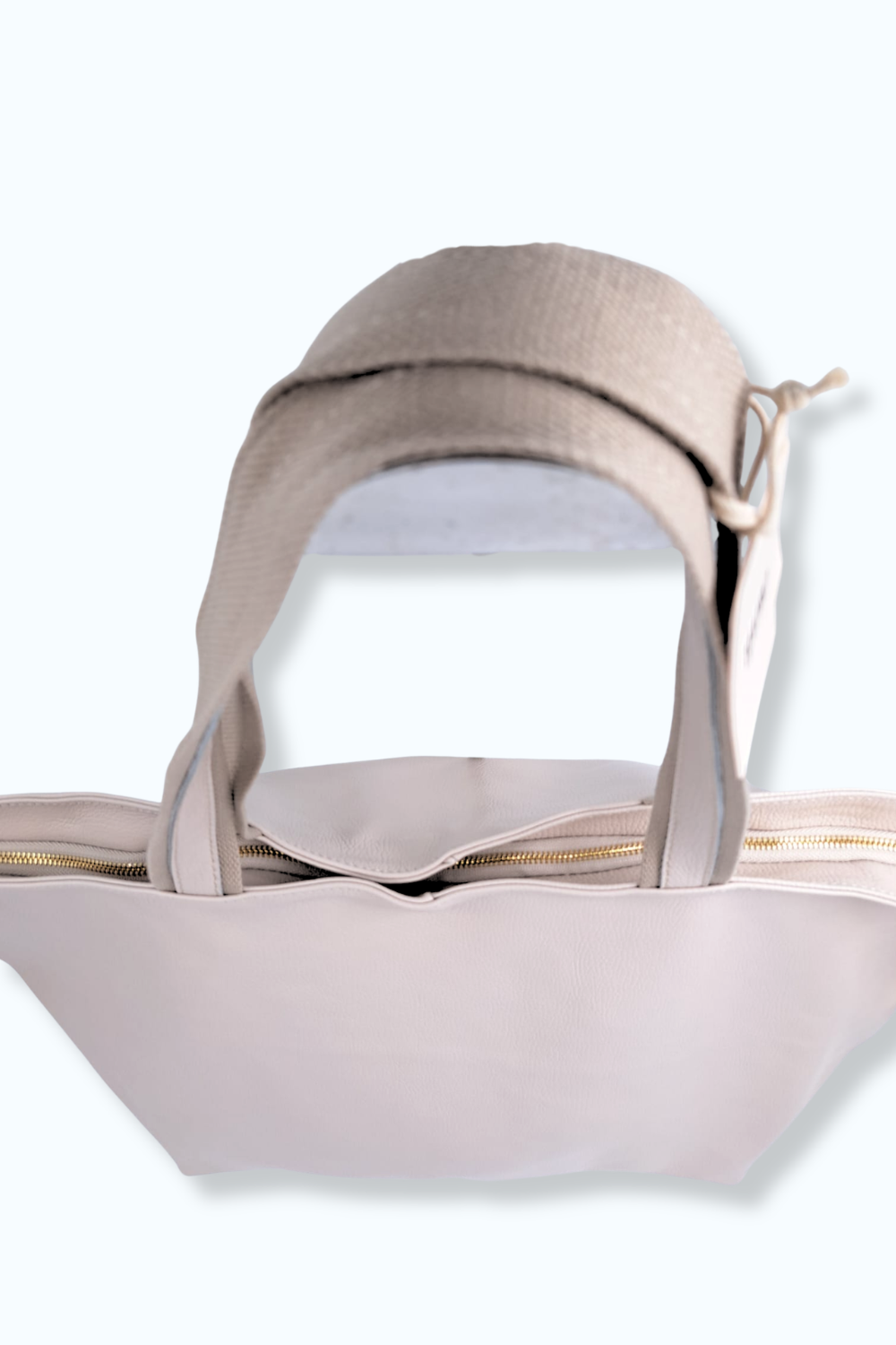 Grote rundlederen tas in de kleur ecru. Gemaakt in Italië. Bevat gouden ritsluiting. Ook in de kleur taupe te verkrijgen.