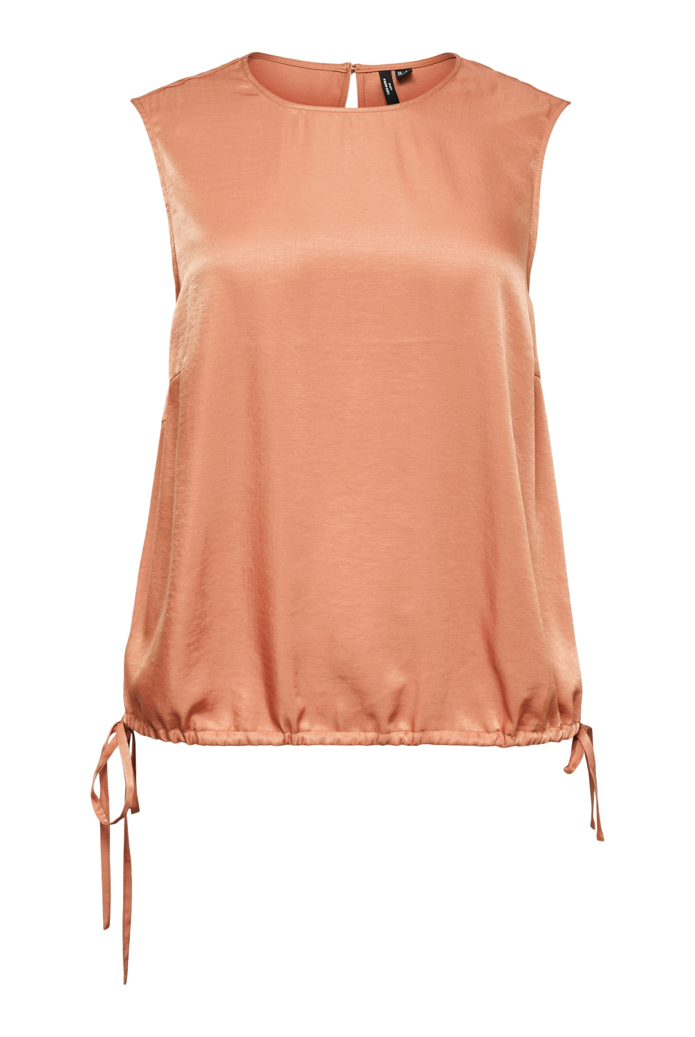 Dames top met korte lengte, mouwloos, met sleutelgat-hals (keyhole), strikdetail aan de zoom en zijstrikjes.