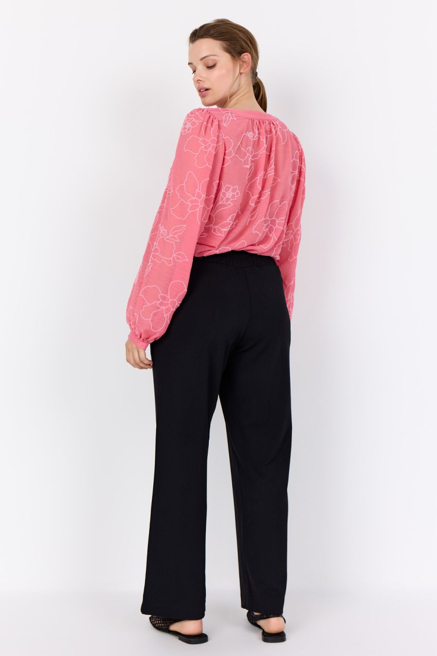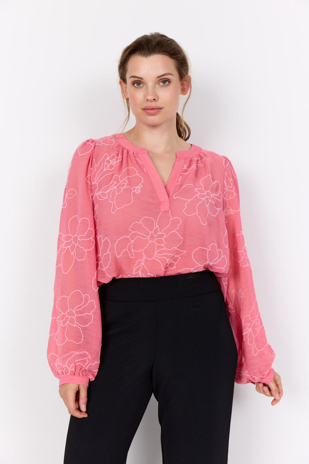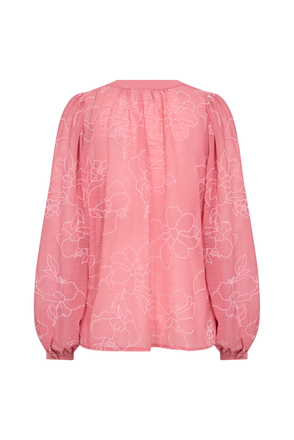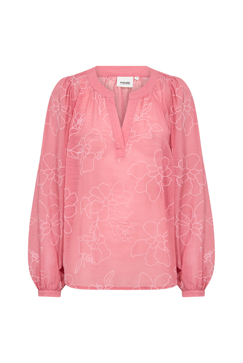 WA-SAHIFA 1 is een vrouwelijke blouse gemaakt van 100% gerecycled polyester. Hij heeft een delicate bloemenprint, een stijlvolle V-hals met een subtiel kraagje en lange mouwen met knoopmanchetten. Combineer hem met een pantalon of een spijkerrok voor een elegante look.