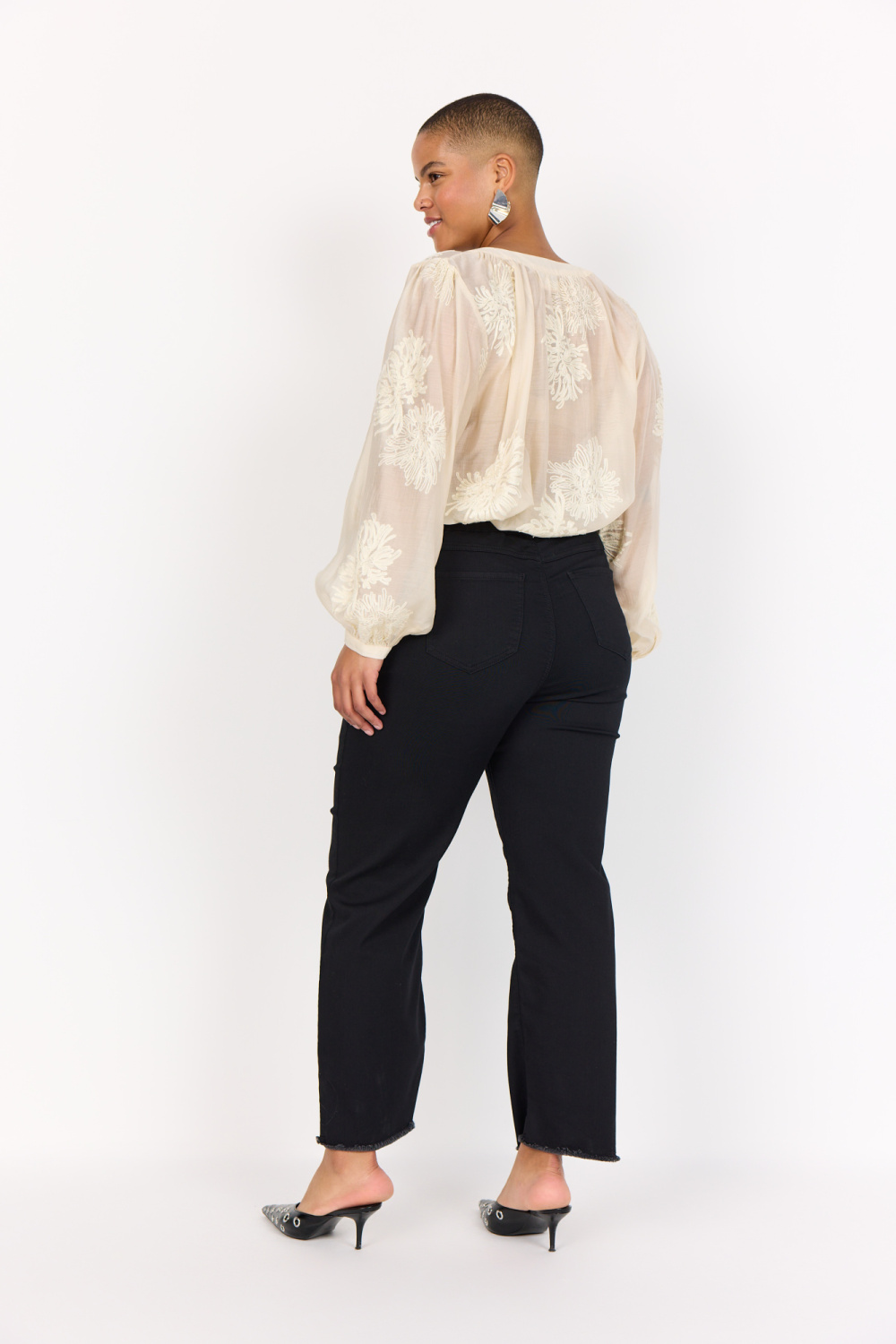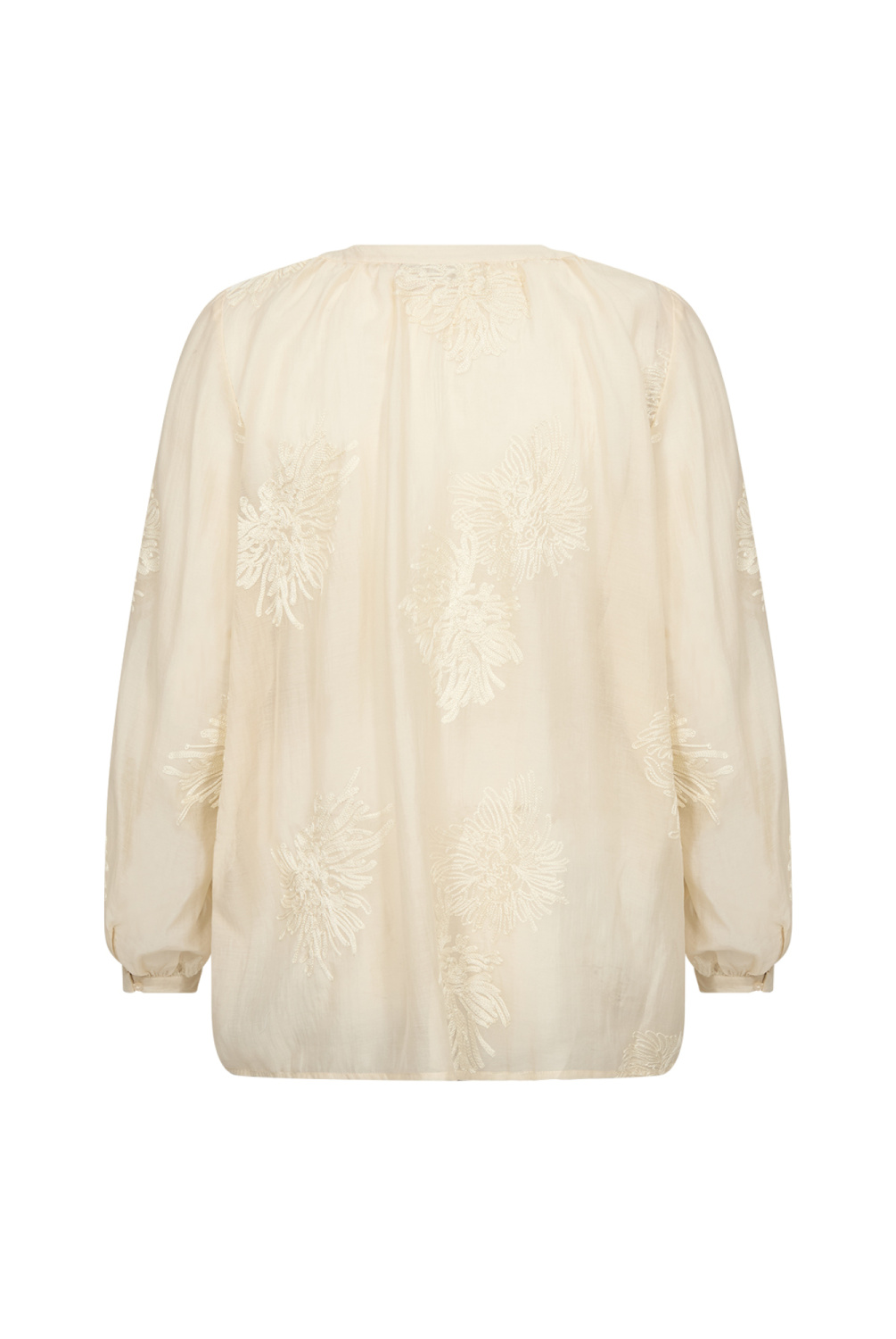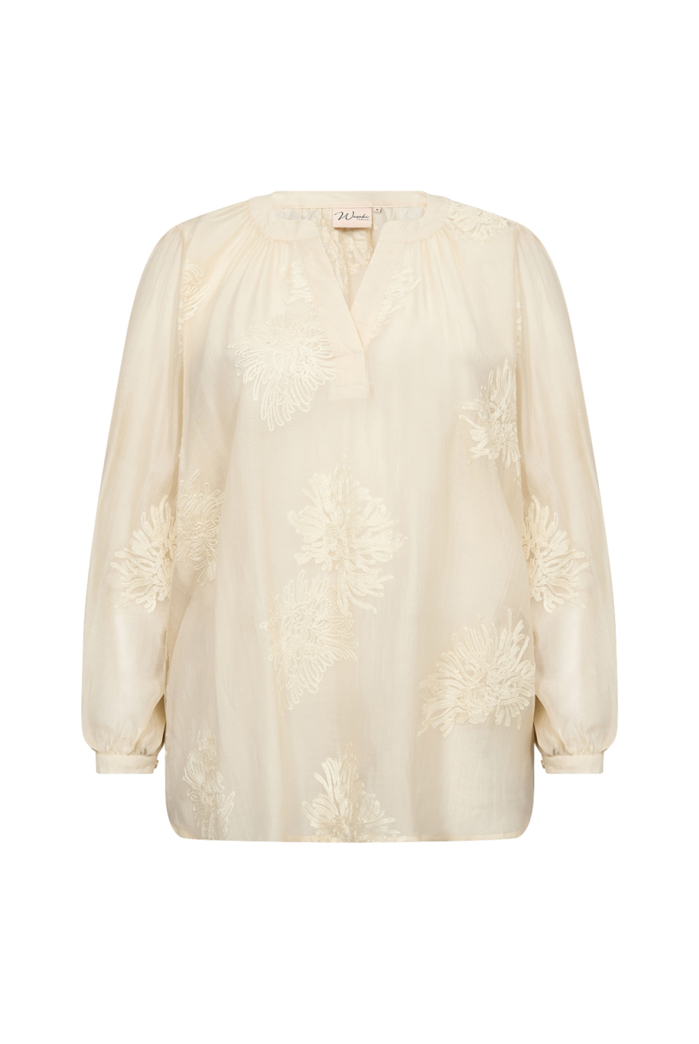 WA-SILICIA 1 is een blouse vervaardigd uit 75% viscose en 25% nylon. Het heeft elegante bloemenborduurwerk, een subtiele v-halslijn en manchetten. Combineer het met een pantalon of een rok voor een verzorgde uitstraling.