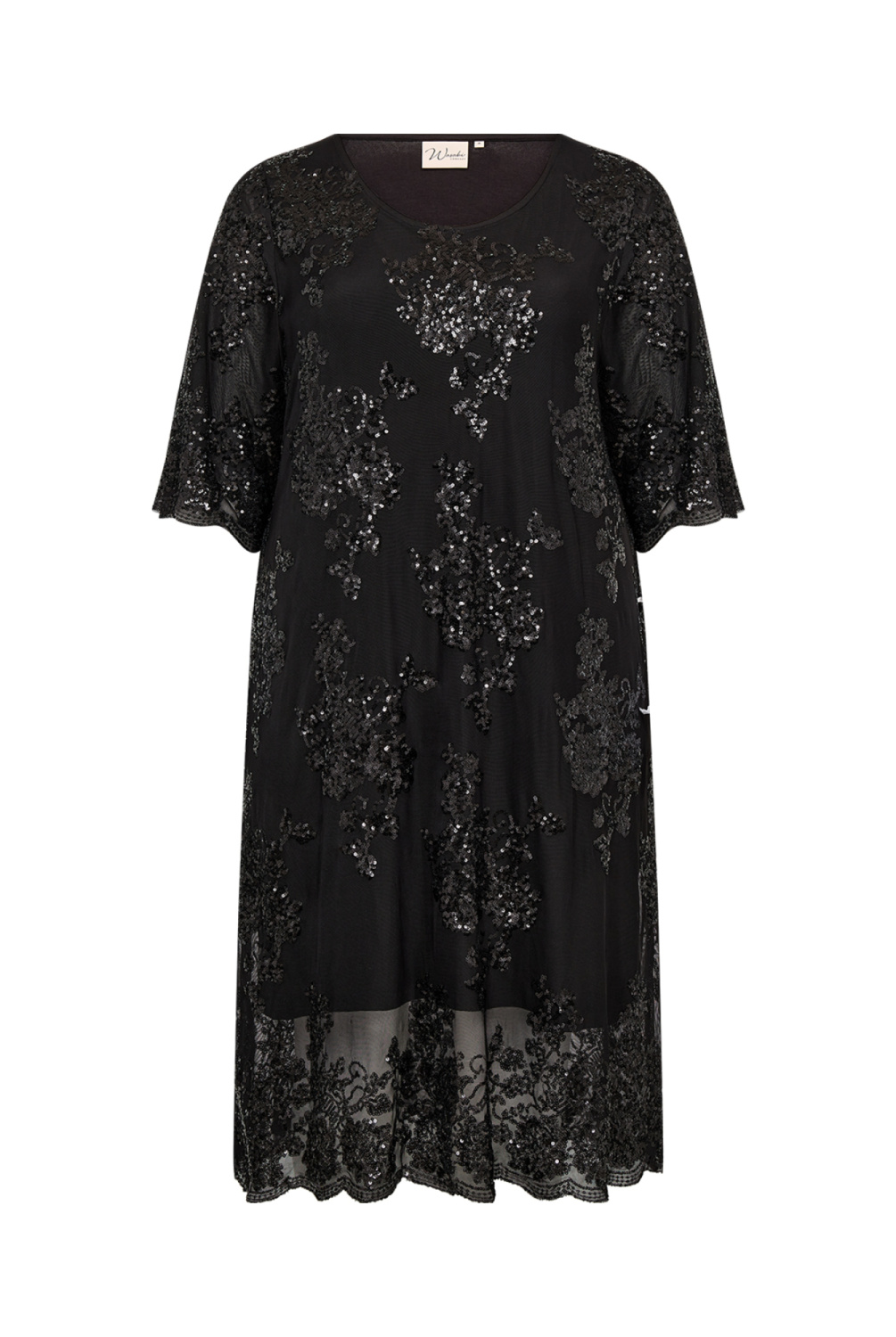 Deze elegante jurk heeft ingewikkelde pailletten details en mouwen tot halverwege de arm met een delicate golvende zoom. Draag het met strappy hakken en minimale sieraden voor een verfijnde uitstraling.