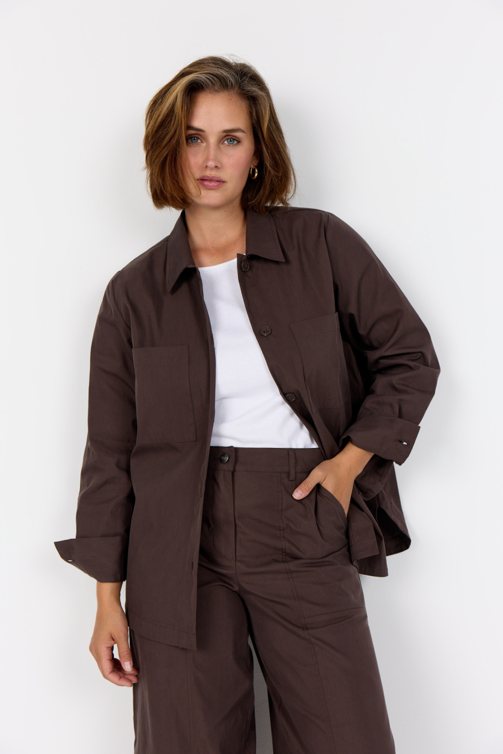 WA-HAILEY 1 is gemaakt van 72% biologisch katoen en 28% polyamide. Het heeft een klassieke kraag, een knoopsluiting aan de voorkant en twee grote opgestikte zakken voor extra stijl en functionaliteit. Combineer het met een nette broek of een eenvoudige jurk voor een elegante uitstraling.