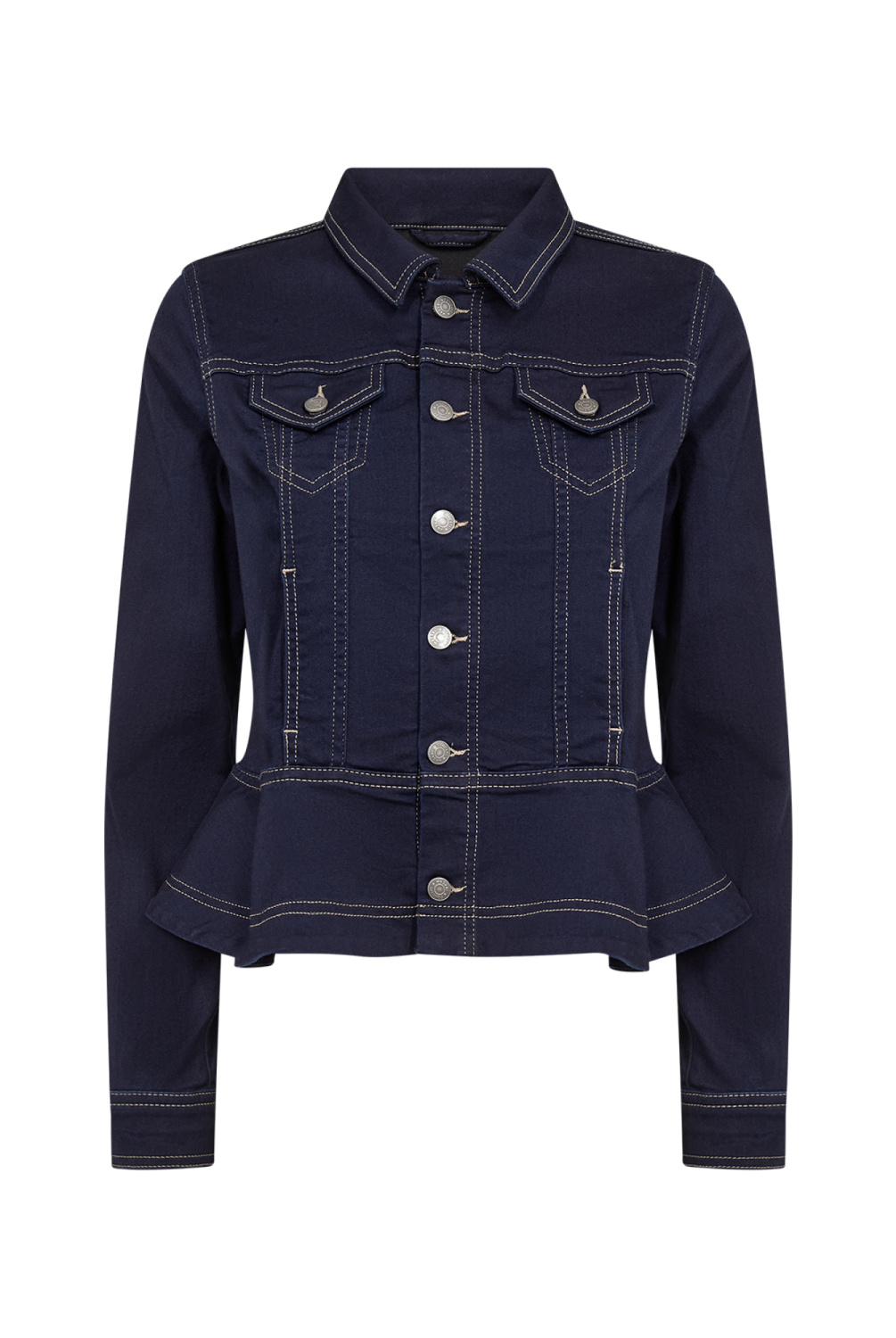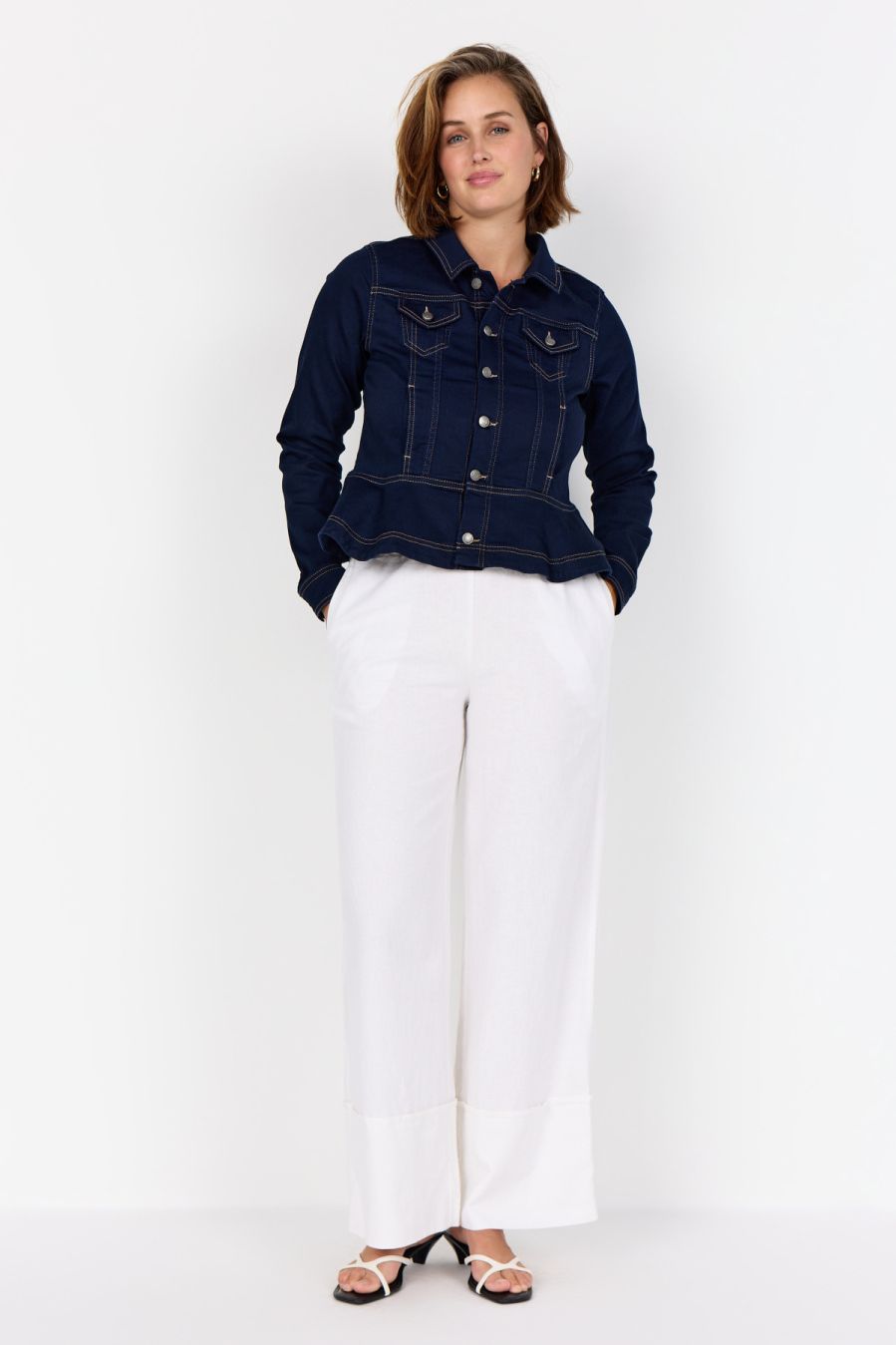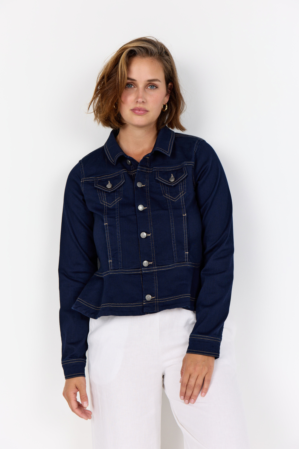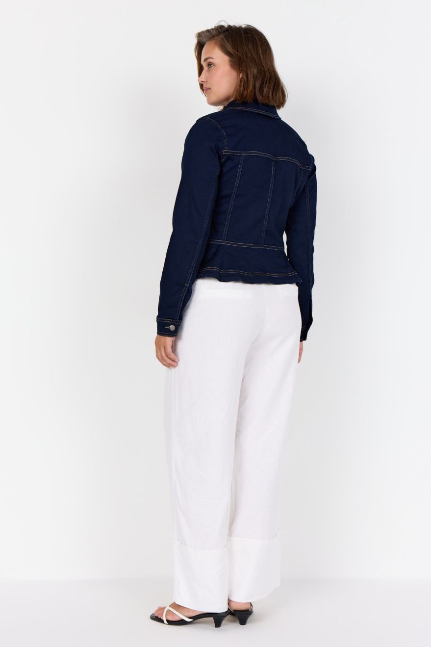 WA-SUMMER 23 is een stijlvolle jasje. Het ontwerp heeft een klassieke kraag, opvallende knopen en een peplumzoom met contrasterende stiksels. Combineer het met een aansluitende broek of een zwierige rok voor een elegante look.