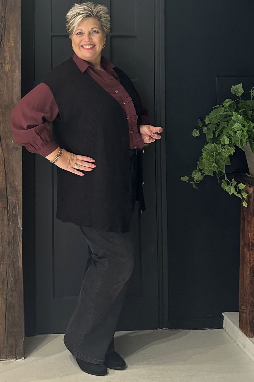 WA-NANINE 1 is een vest gemaakt van 50% LENZING™ ECOVERO™ Viscose, 27% Polyester en 23% Nylon. Het heeft een V-hals ontwerp met een knoopsluiting aan de voorkant en een geribbelde brei textuur. Draag het over een shirt of blouse voor een gelaagde look.