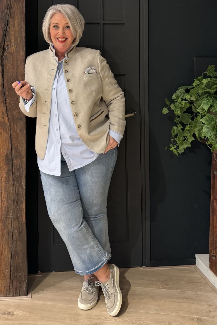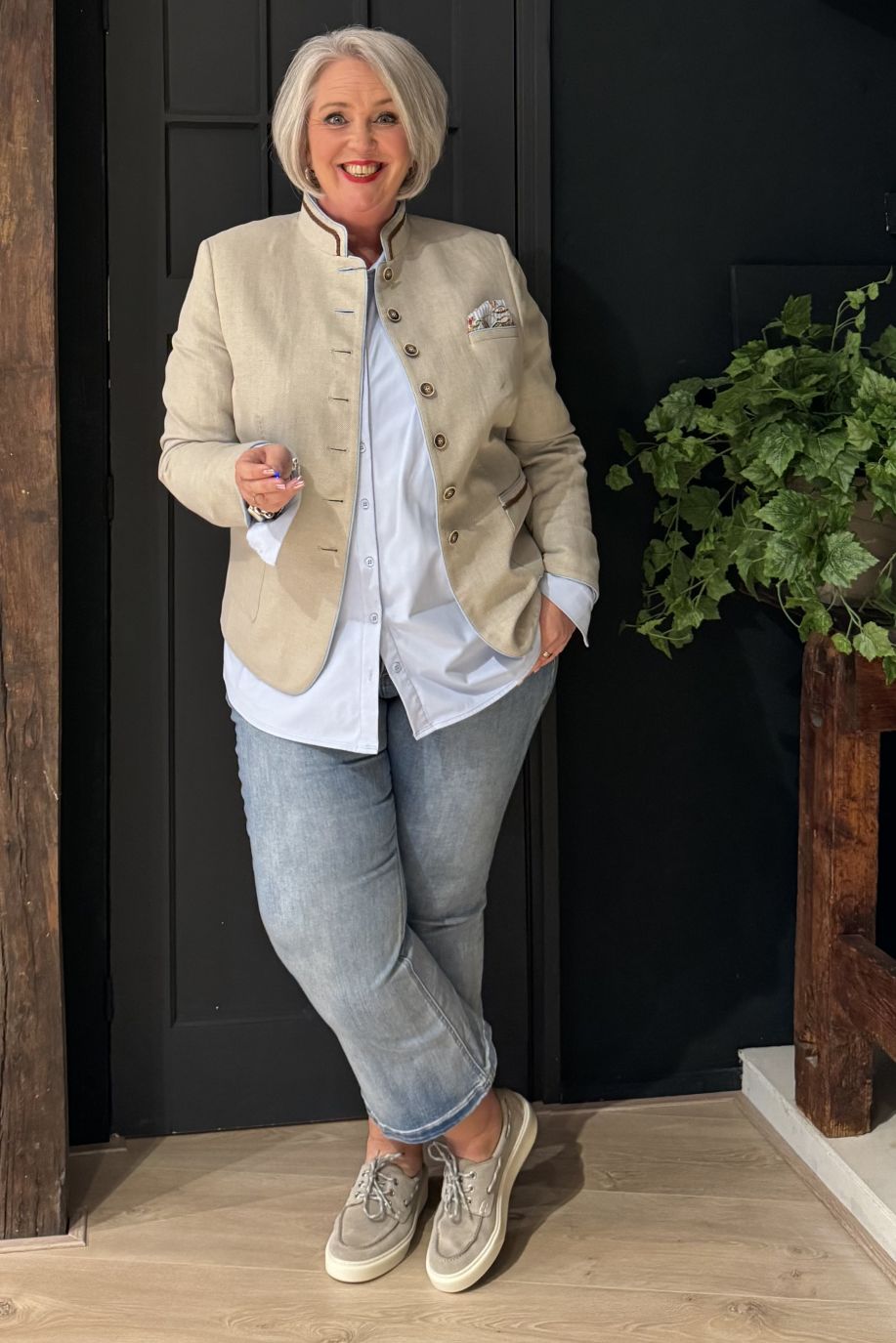 Productdetails - Getailleerd model - Ruglengte 58 cm (confectiemaat 38) - Lange mouwen met open mouwsplit om om te slaan - Gevlochten band van imitatiesuède als decoratief accent - Kleurcontrasten aan kraag, voorrand, zakken en mouwzoom - Borstflap met pochet - Knopenrij in het midden voor - Opgezette zakken onder taille - Opstaande kraag - Volledig gevoerd