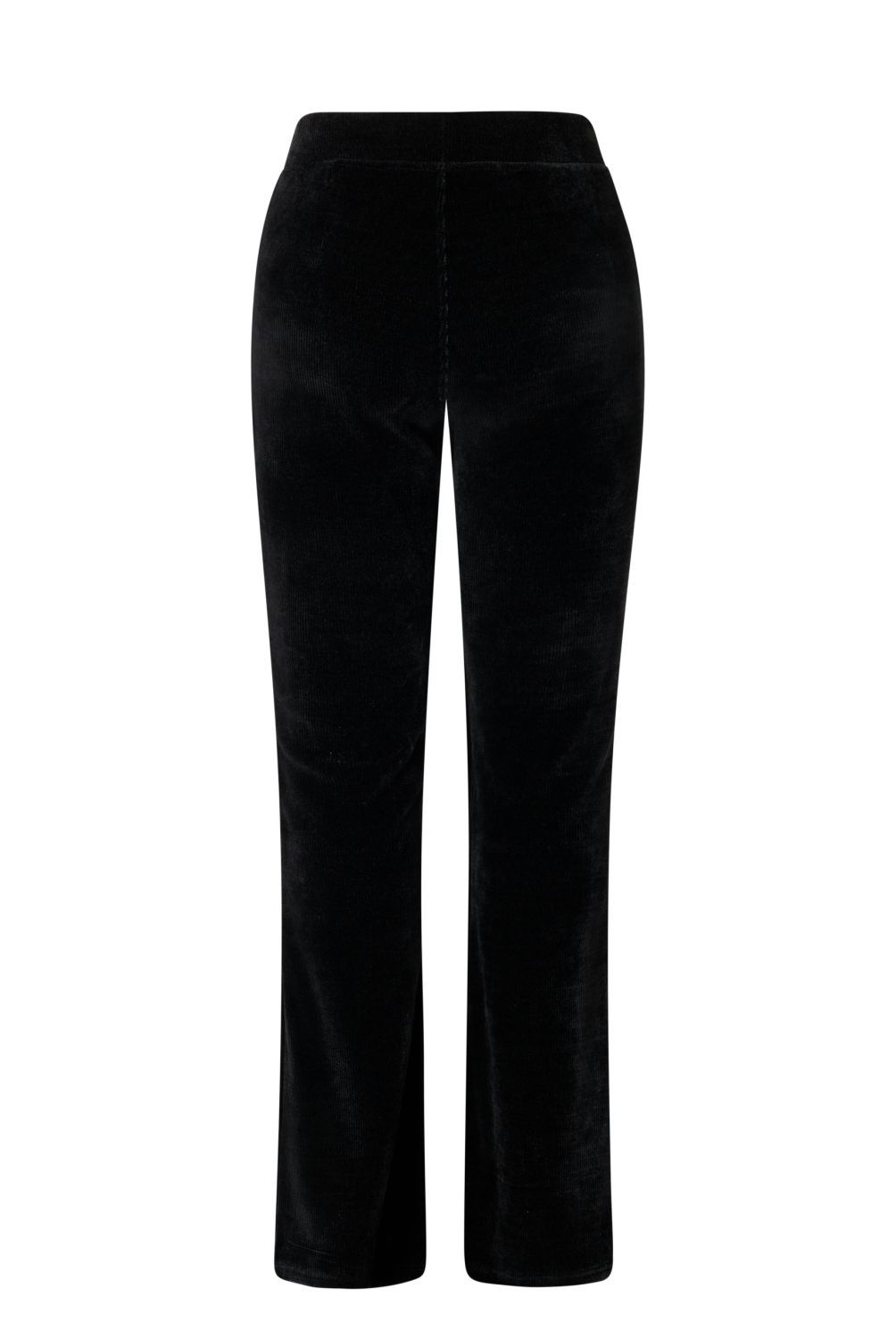 Deze ribbroek is uitgevoerd in een zachte stretchkwaliteit met een elastische tailleband voor extra comfort. Het model heeft een flared fit en sluit mooi aan bij de heupen. Door het treggingmodel trek je hem gemakkelijk aan. Uitgevoerd in zwart, een tijdloze basis voor elke garderobe.