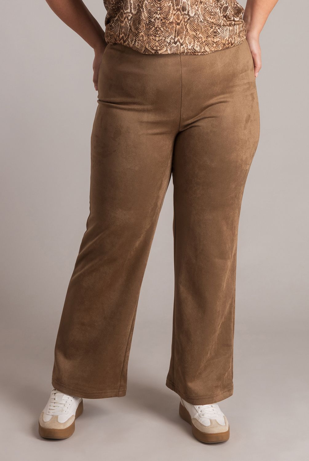 Deze suedine tregging combineert een comfortabele jersey kwaliteit met een gladde, zachte feel. De flared pijpen geven een moderne look, terwijl het aansluitende bovenbeen zorgt voor een flatterend effect. Een stijlvol en makkelijk te combineren item in een rijke soft brown tint.