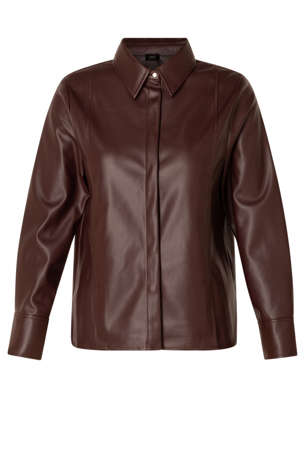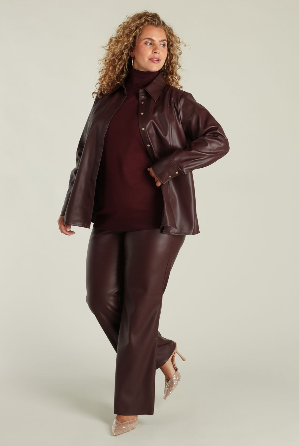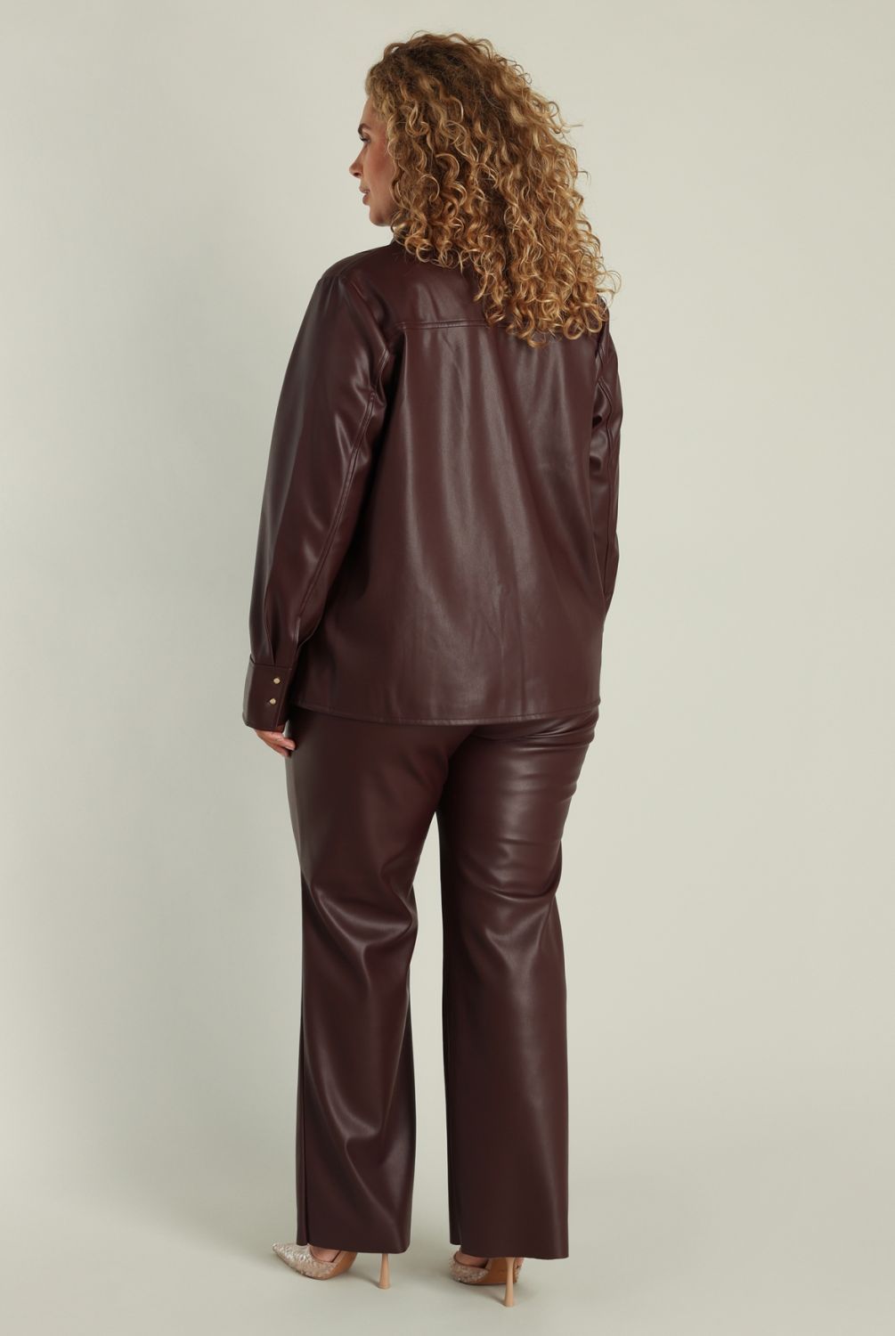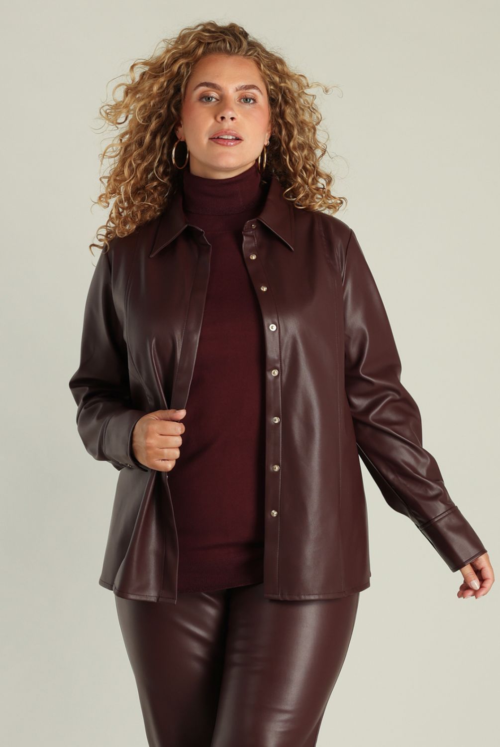Stoer als jasje, stijlvol als blouse. Dit bordeauxkleurige overshirt is gemaakt van P.U., waardoor het glad, duurzaam en eenvoudig af te nemen is. De drukknoopsluiting en strakke lijnen geven het een moderne uitstraling.