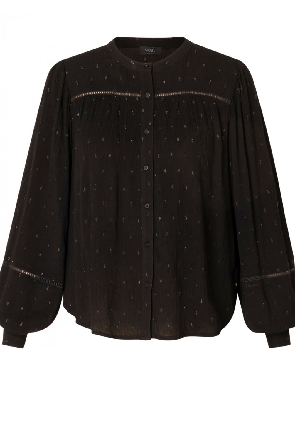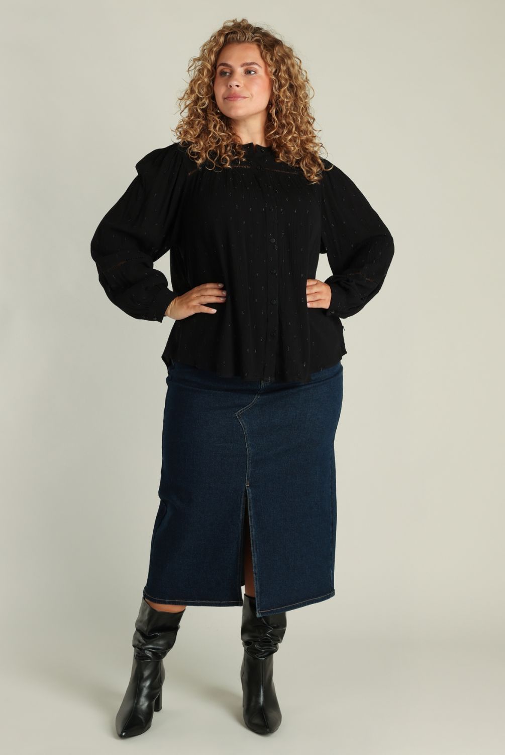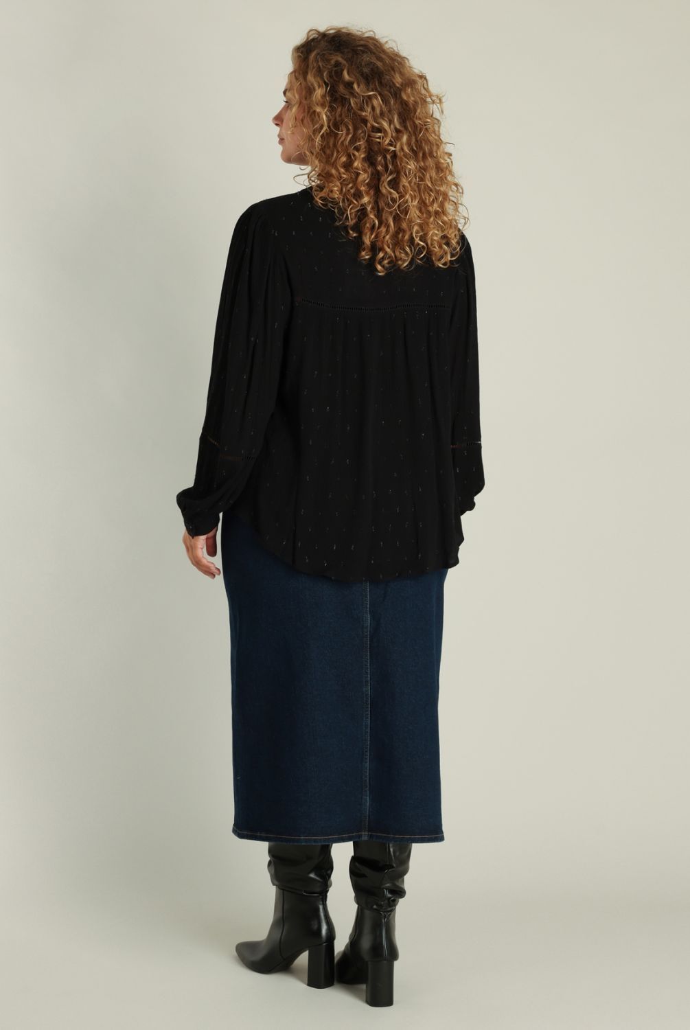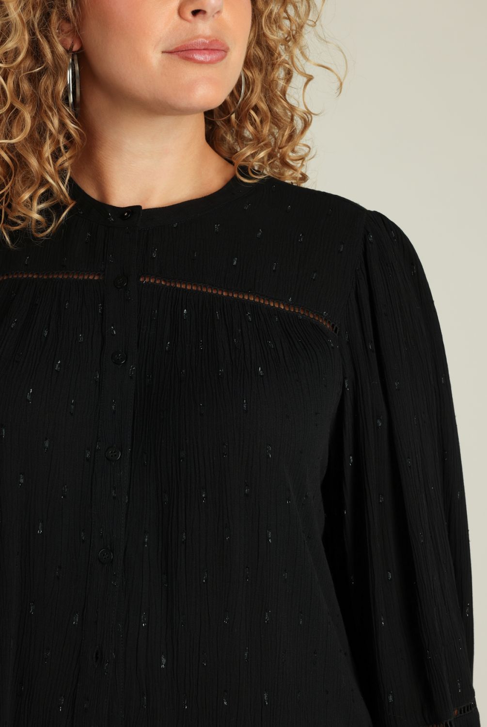 Deze blouse combineert een zachte, crêpe-achtige viscose met een lichte glitter dankzij het lurex draadje. De wijde ballonmouwen en ronde halslijn geven het een moderne, vrouwelijke touch, perfect om een casual outfit een verfijnde boost te geven.