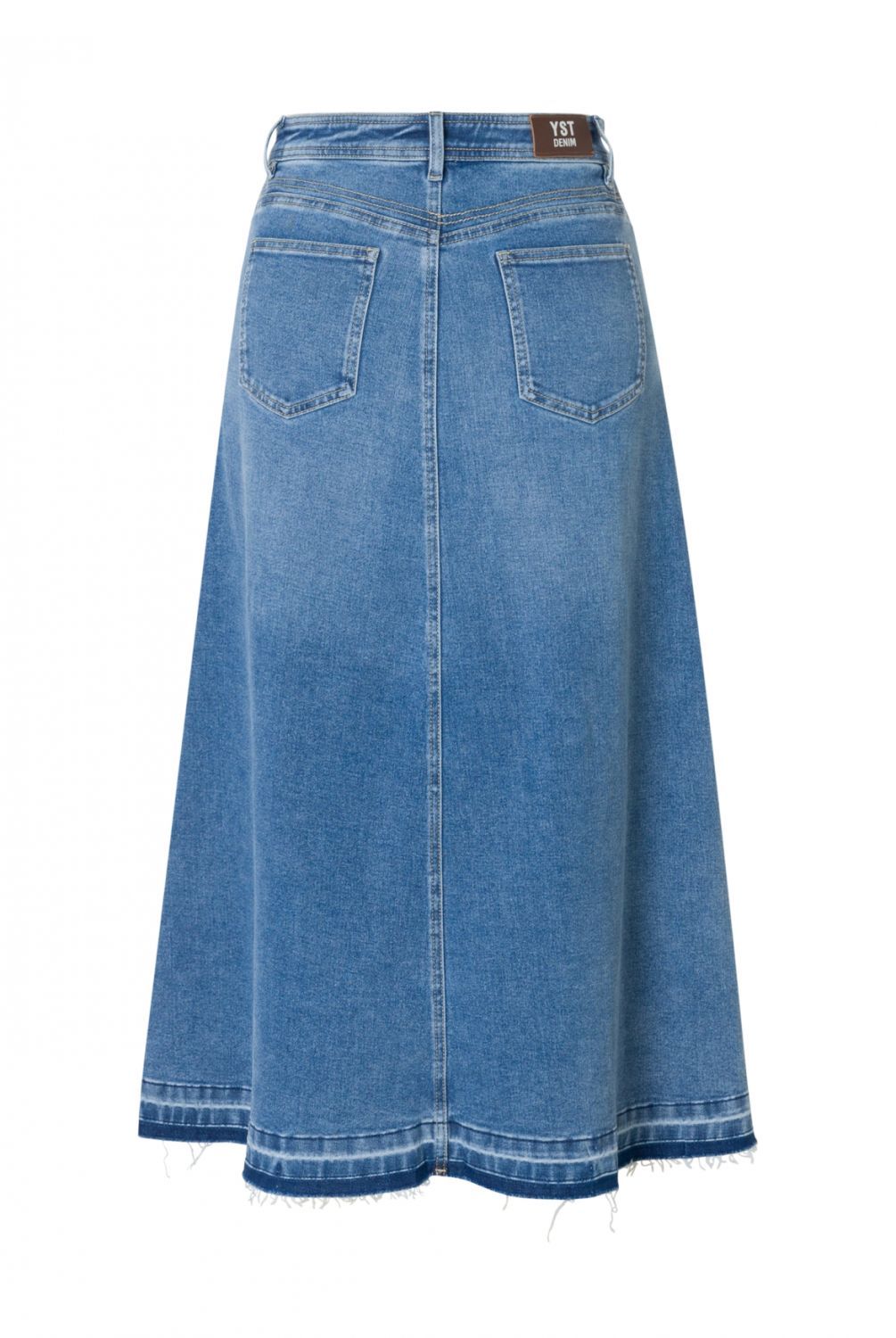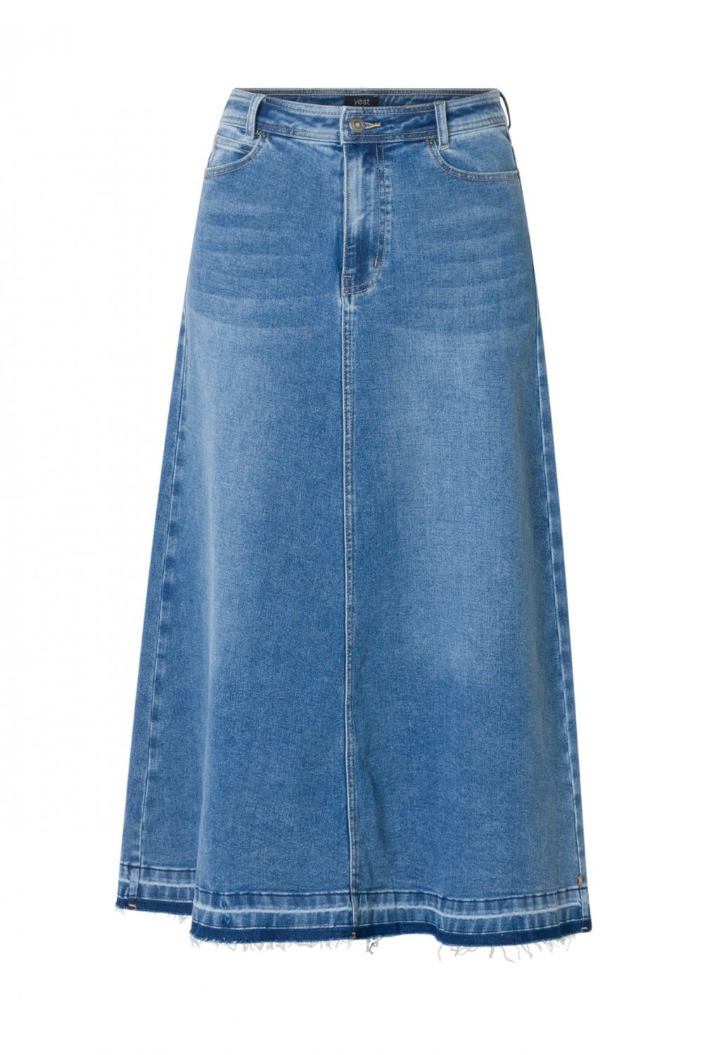 Deze denim rok heeft een subtiel vintage-lookje dankzij de onafgewerkte zoom, die een nonchalante twist geeft aan het klassieke uitlopende model. Met zijn halflange lengte en lichte wassing is het een relaxed item dat je makkelijk combineert met sneakers of juist toffe laarzen.
