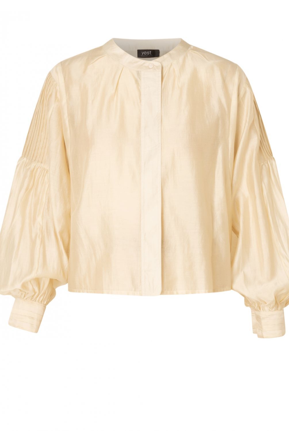 Deze blouse is gemaakt van een lichte viscose-polyester mix met een subtiele glans en semi-doorschijnende kwaliteit. De ballonmouwen met fijne plooien zorgen voor volume, terwijl de blinde knoopsluiting het geheel clean houdt. Een blouse die elegant valt en ideaal is voor zowel feestelijke gelegenheden als een stijlvolle werkdag.
