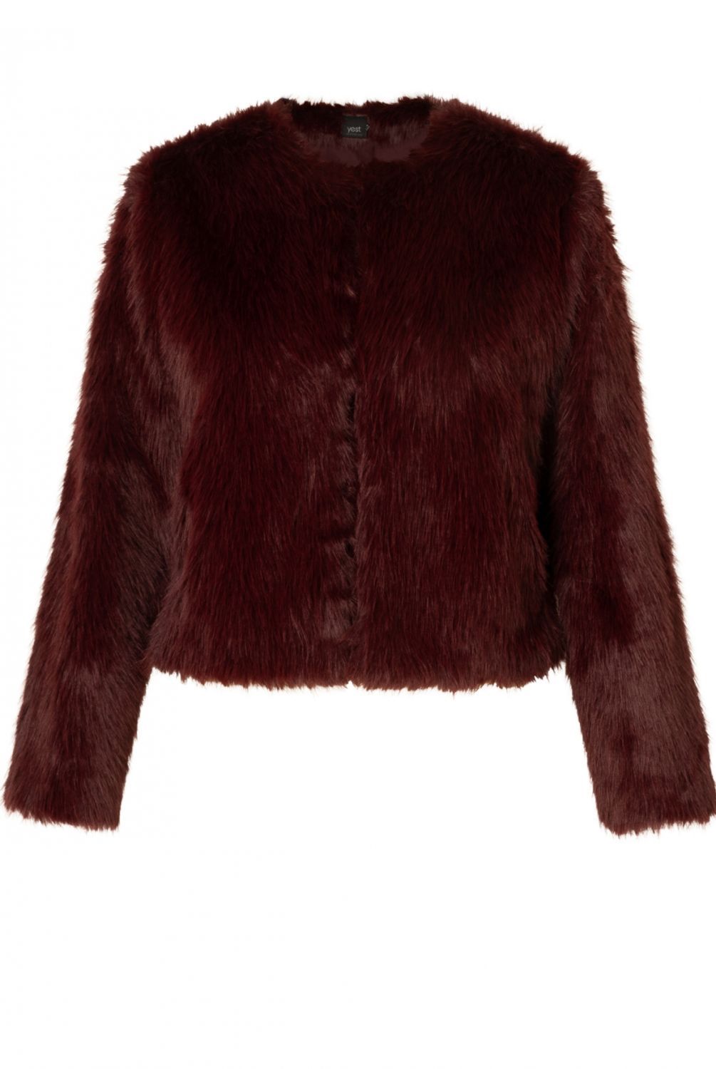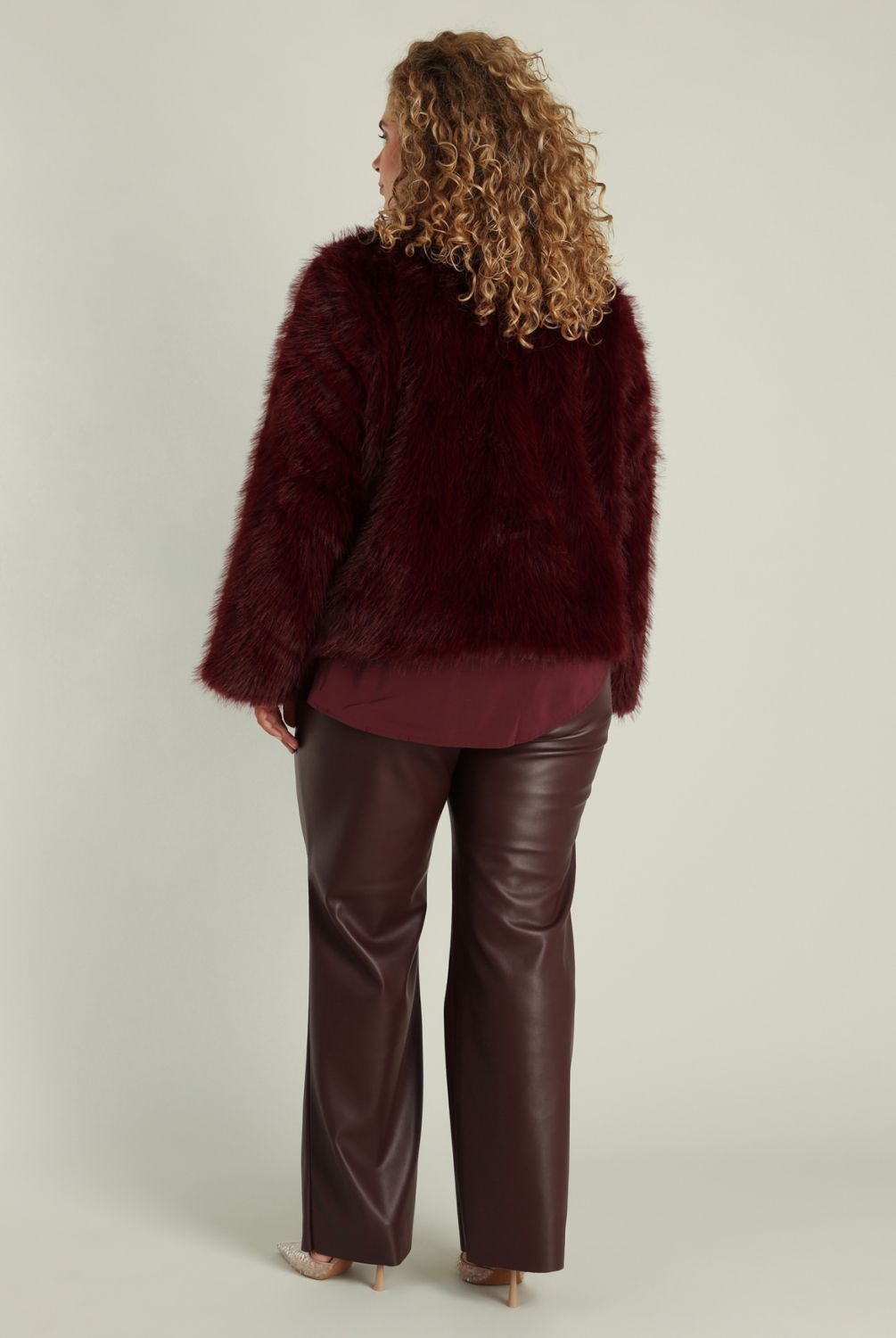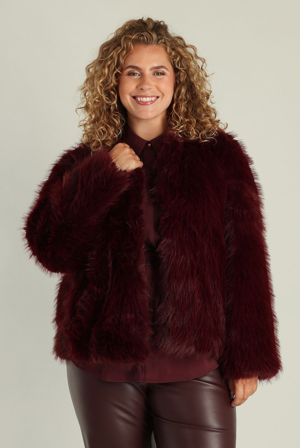 Een echte blikvanger: dit fake fur jasje heeft een volle, harige look in diepe port tint. Het korte model sluit met twee haakjes en heeft een ronde halslijn. Perfect om je outfit direct een luxe uitstraling te geven. Dit item blijft het mooist met professionele reiniging.
