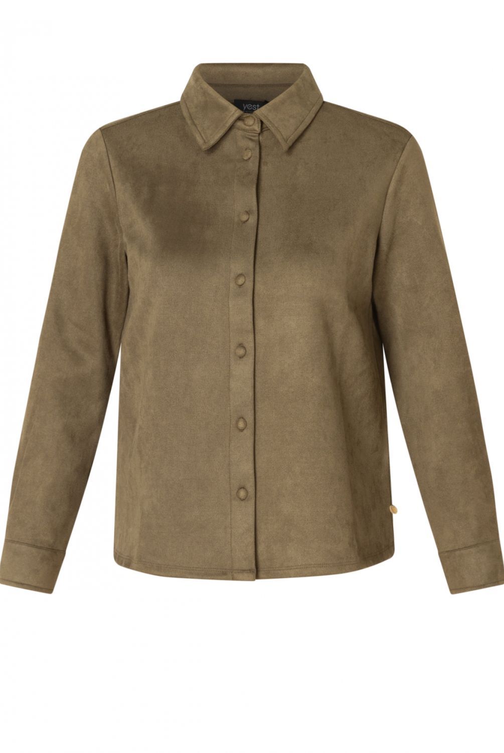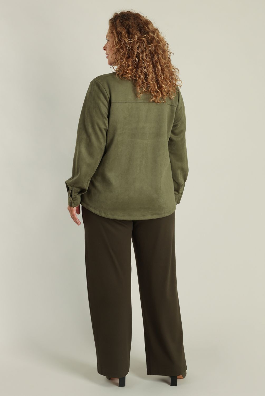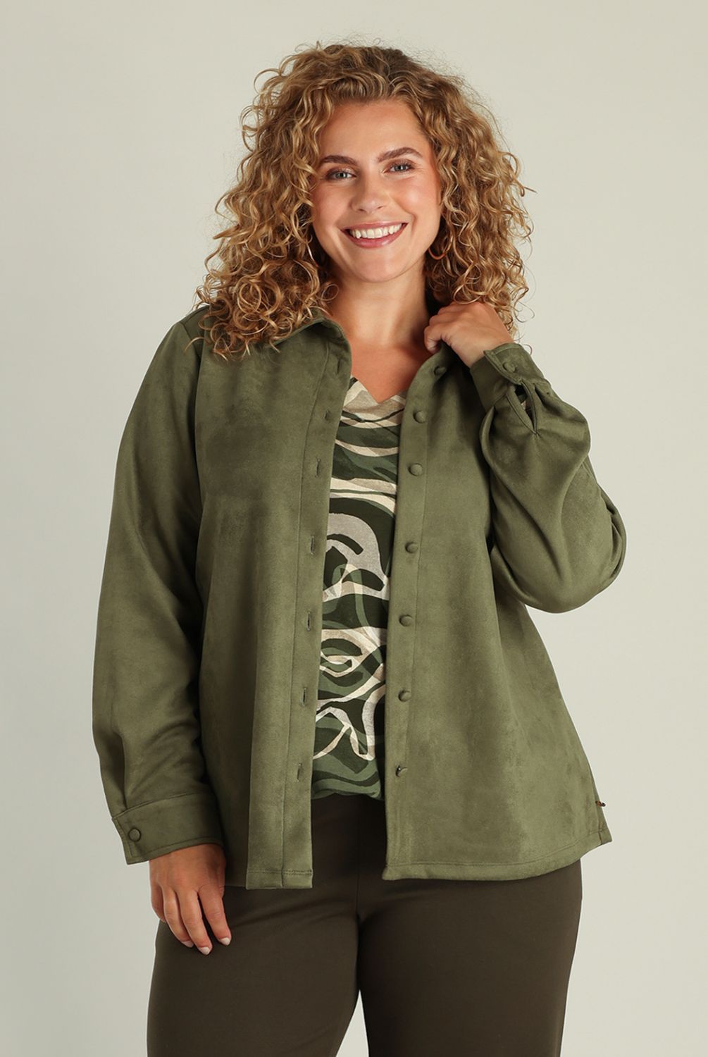 Deze blouse met suedine look combineert stoer en zacht perfect. De subtiele stretch zorgt voor een fijne pasvorm, en het materiaal voelt comfortabel aan. Combineer ‘m met het bijpassende rokje voor een relaxte, coole outfit die makkelijk opvalt. Verkrijgbaar in de kleuren soft taupe en grey olive.