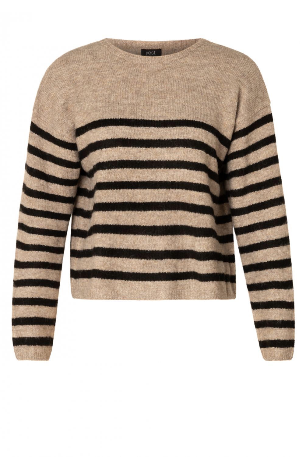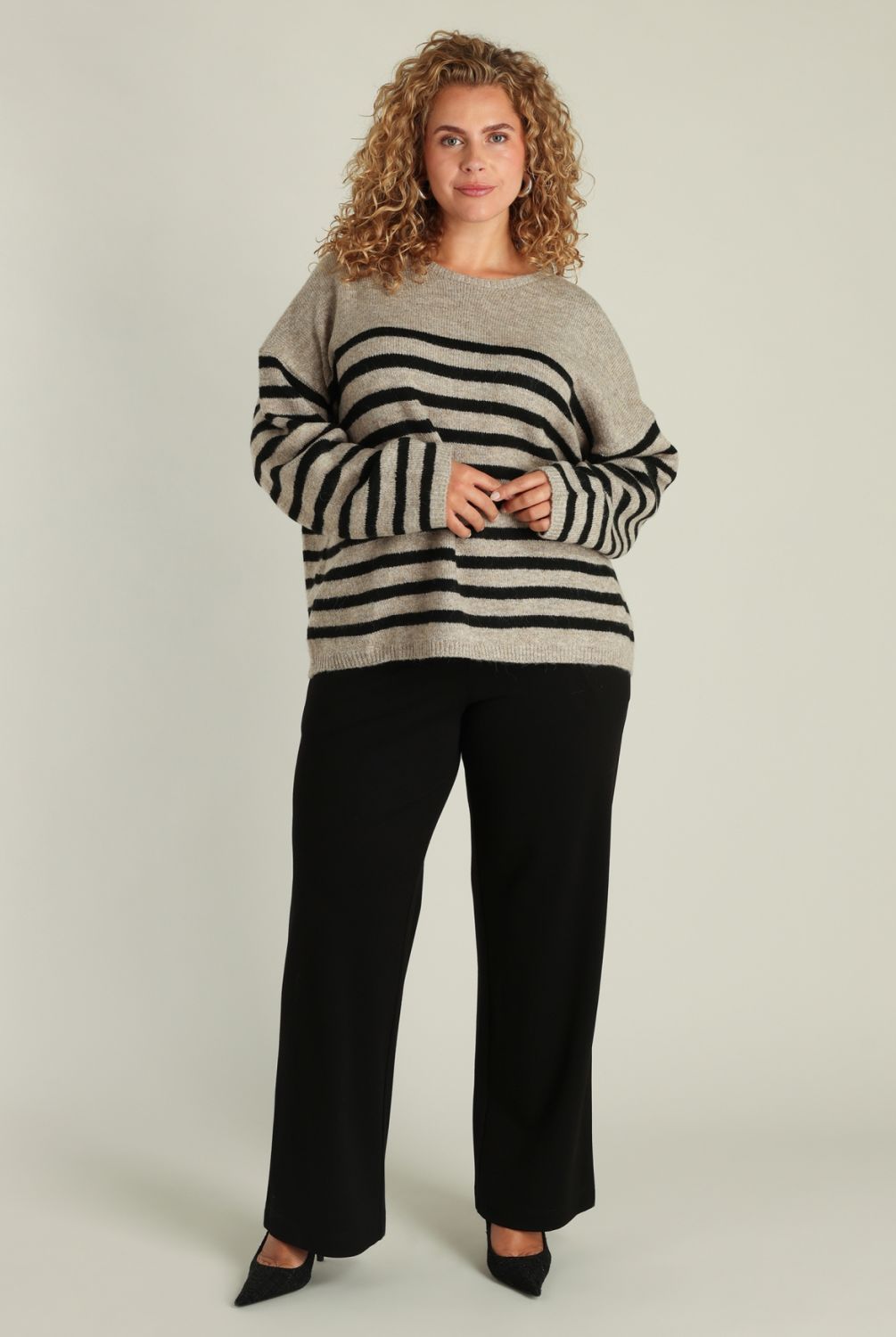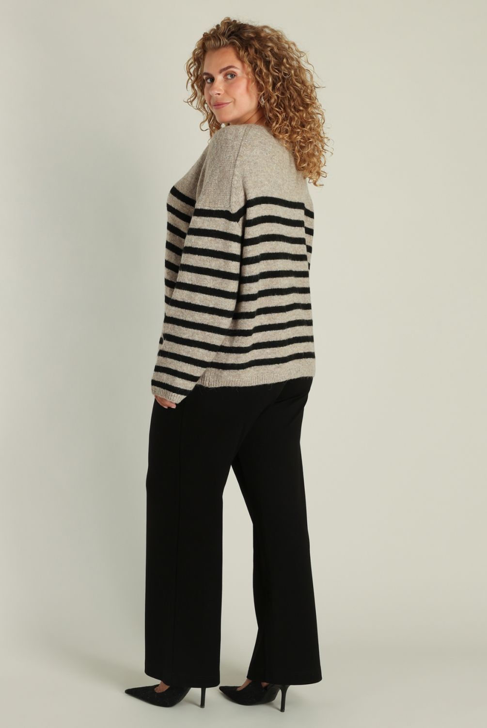 Deze gebreide trui combineert een klassieke streep met een zachte, comfortabele kwaliteit. De mix met wol en gerecycled polyester voelt behaaglijk aan en blijft mooi in vorm. De comfort fit maakt dit een easy-going knit, perfect voor dagelijkse outfits in de black/sand kleurstelling.