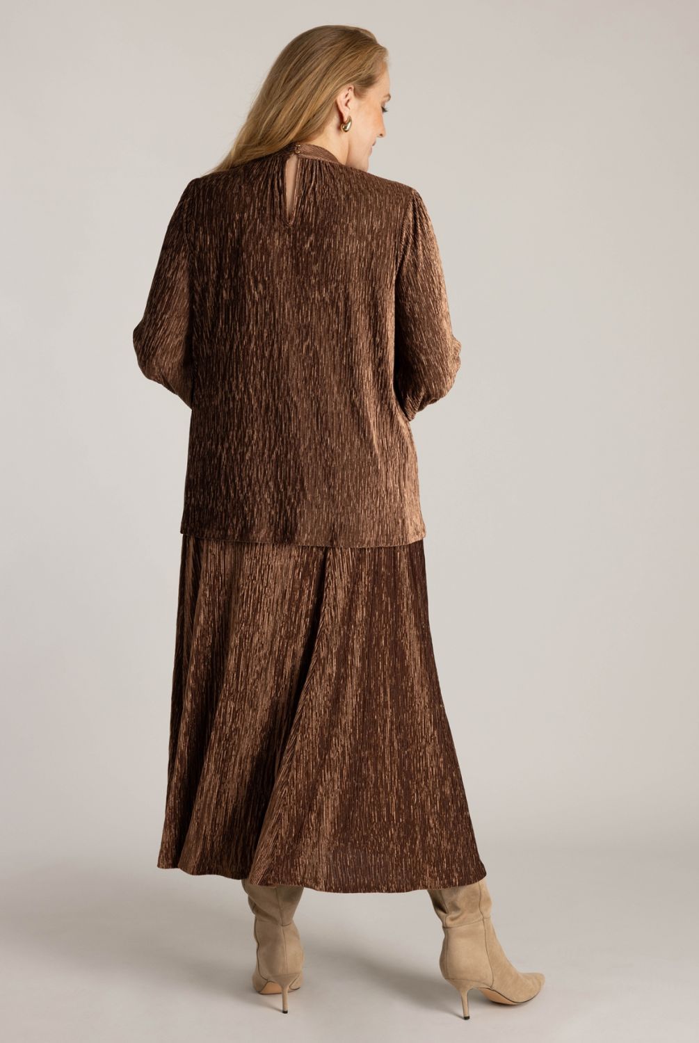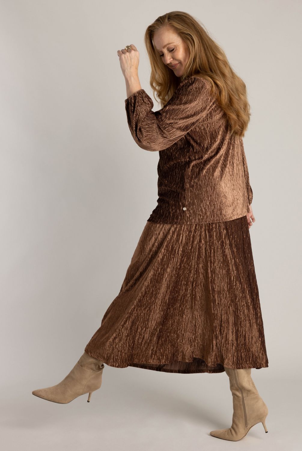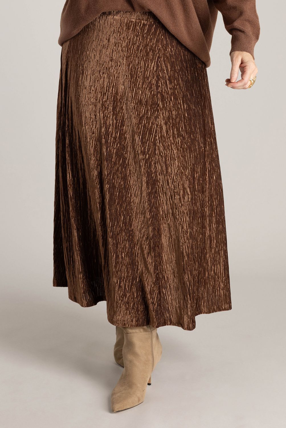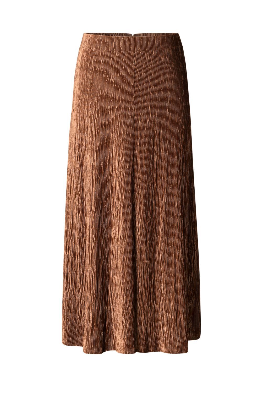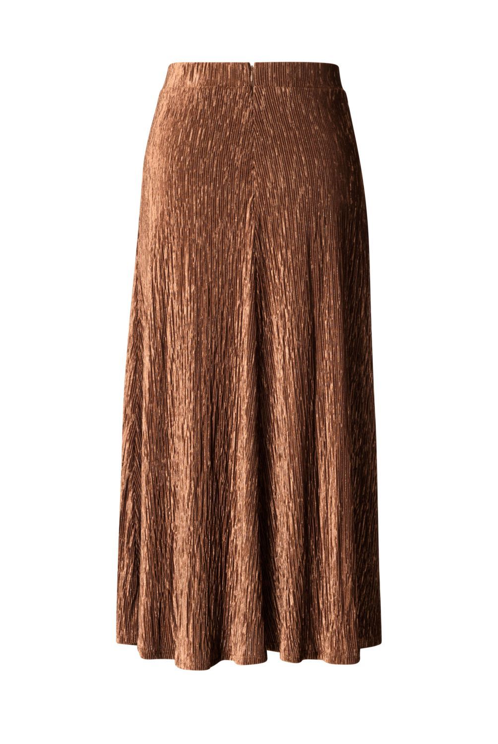 Een rok met een verfijnde glans, uitgevoerd in een soepele plisséstof met metallic draad. De stof valt elegant om het lichaam en beweegt mooi mee. Dankzij de elastische tailleband zit de rok comfortabel. Combineer met de bijpassende top voor een complete, feestelijke look in copper brown.