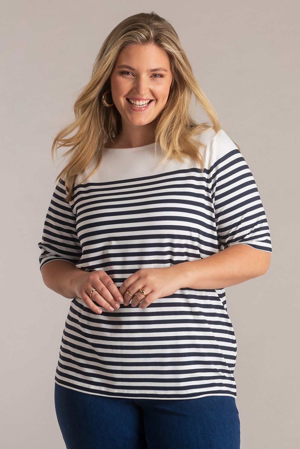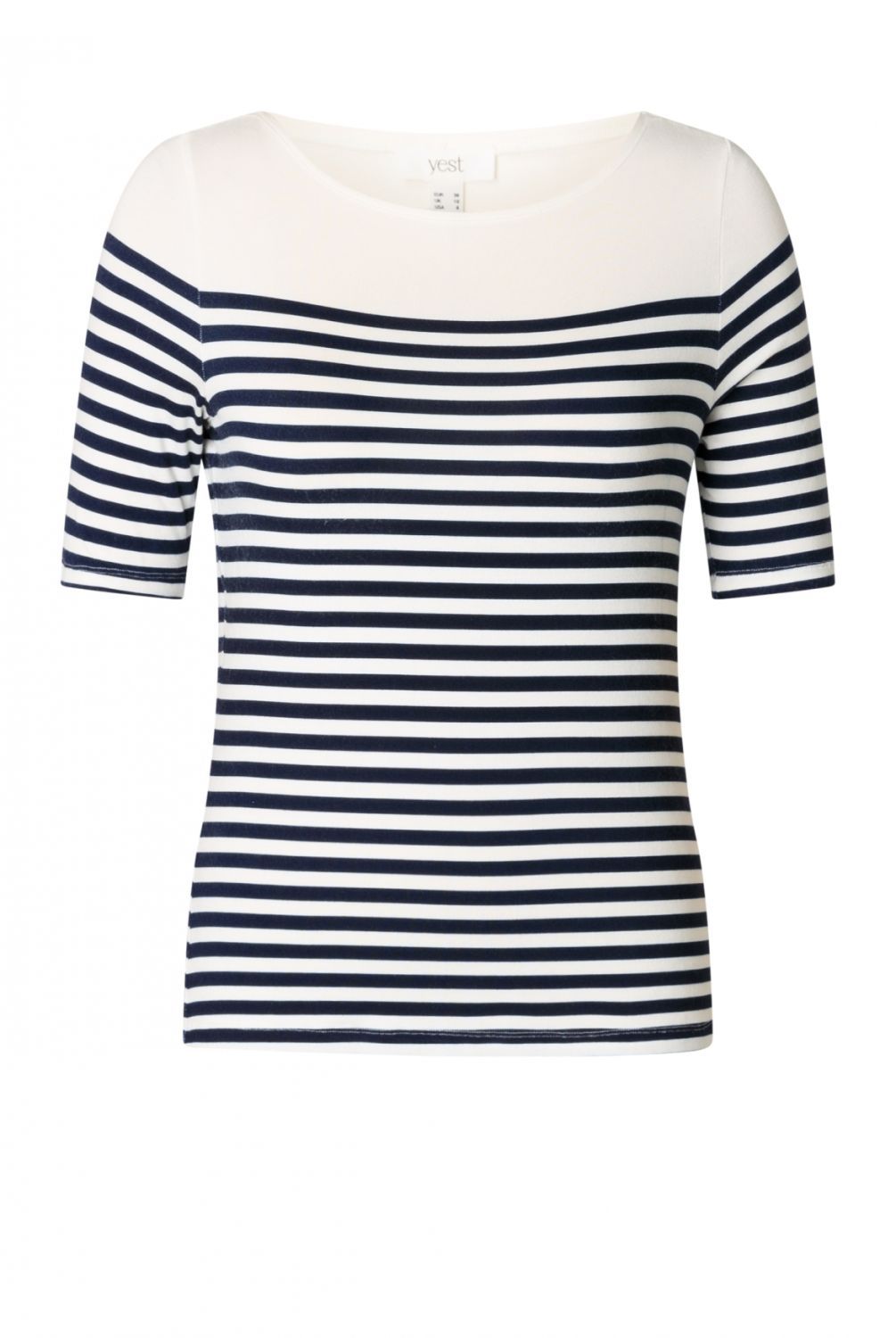 Het T-shirt heeft een lichte, rekbare kwaliteit dankzij 94% viscose en 6% elastane. De strepen in off white met navy of pink geven een tijdloze, zachte look. De half-lange mouw en de nette halslijn maken het een veelzijdig item in de zomerse garderobe.