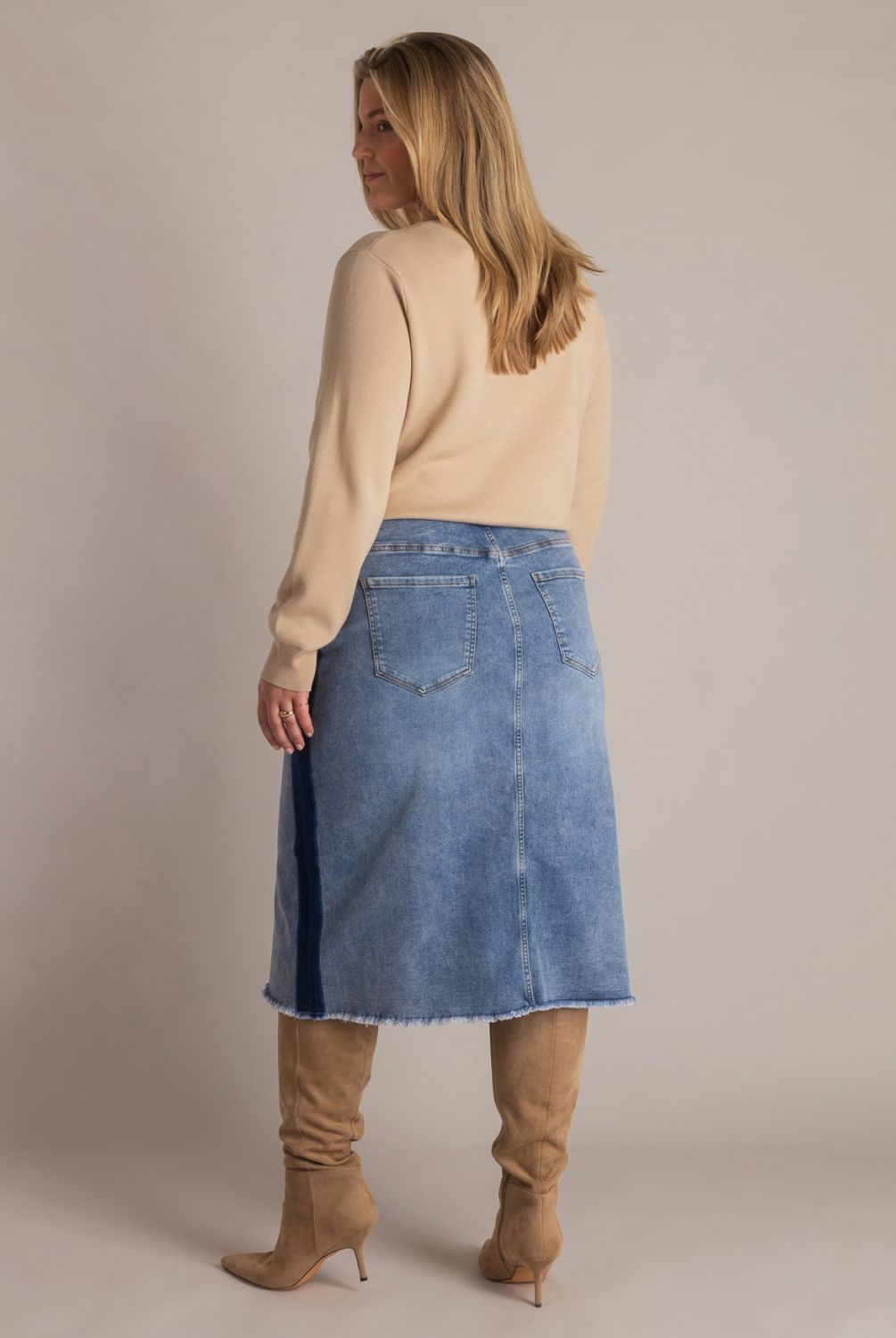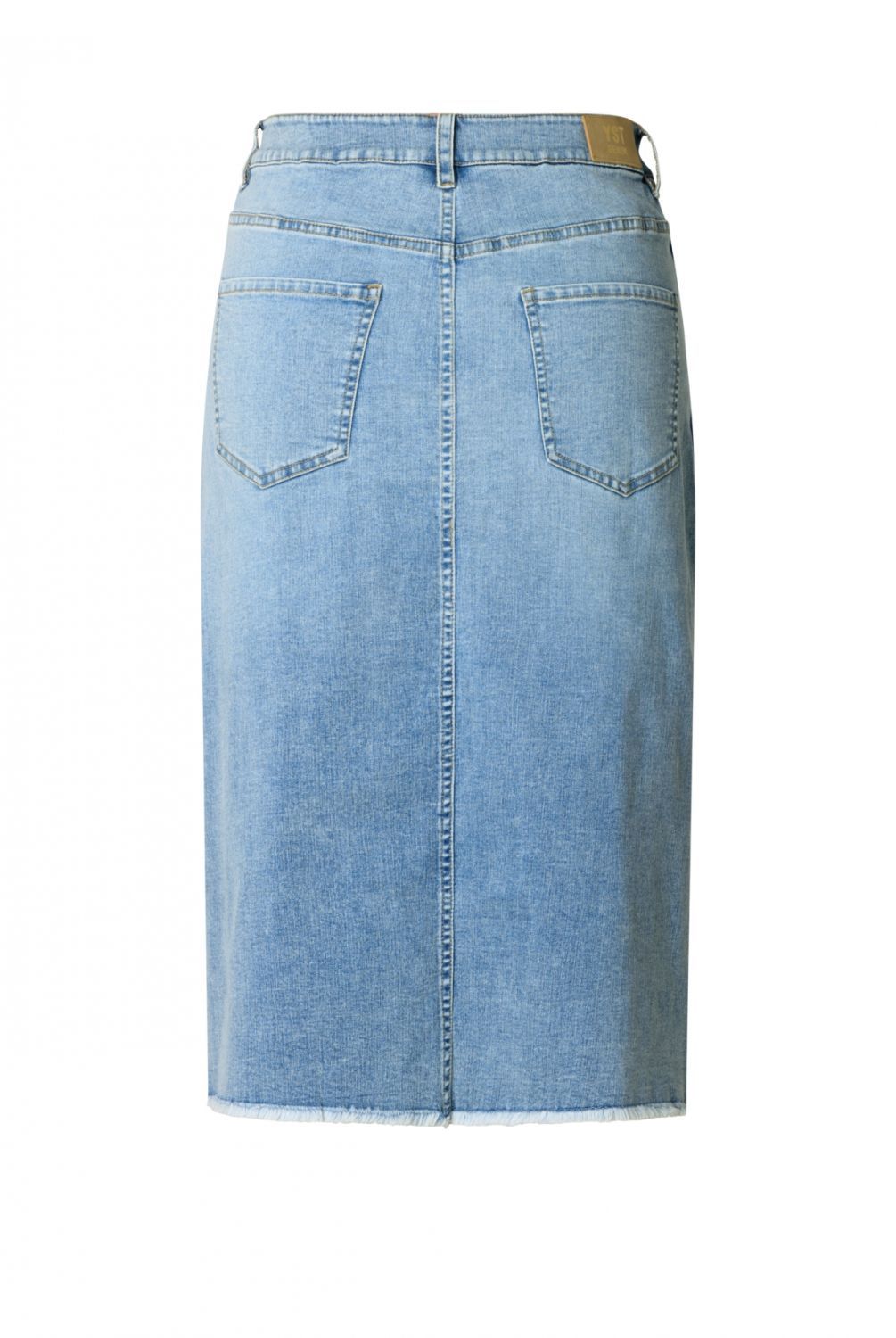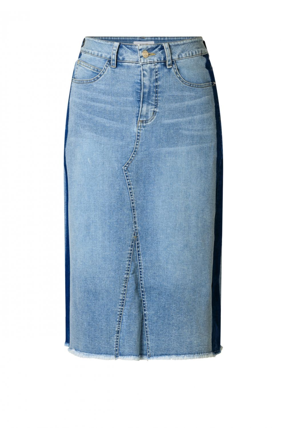 De Jasmin denim rok heeft een bleached wassing en een slim fit die mooi aansluit. Dankzij de toevoeging van elastane draagt het model comfortabel. De rok valt tot over de knie en is voorzien van een inzetstuk aan de voorkant, wat zorgt voor extra bewegingsvrijheid zonder het silhouet te onderbreken.