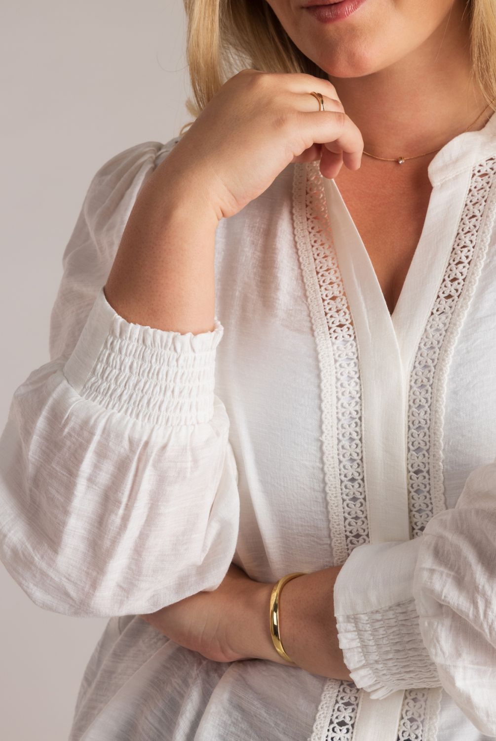 Blouse Jill is gemaakt van een lichte viscose-polyamide kwaliteit en heeft een regular fit die soepel valt. De blinde knoopsluiting zorgt voor een strakke afwerking, terwijl de opengewerkte details op de schouders en langs de sluiting een verfijnd accent vormen. Uitgevoerd in een zachte off-white tint.